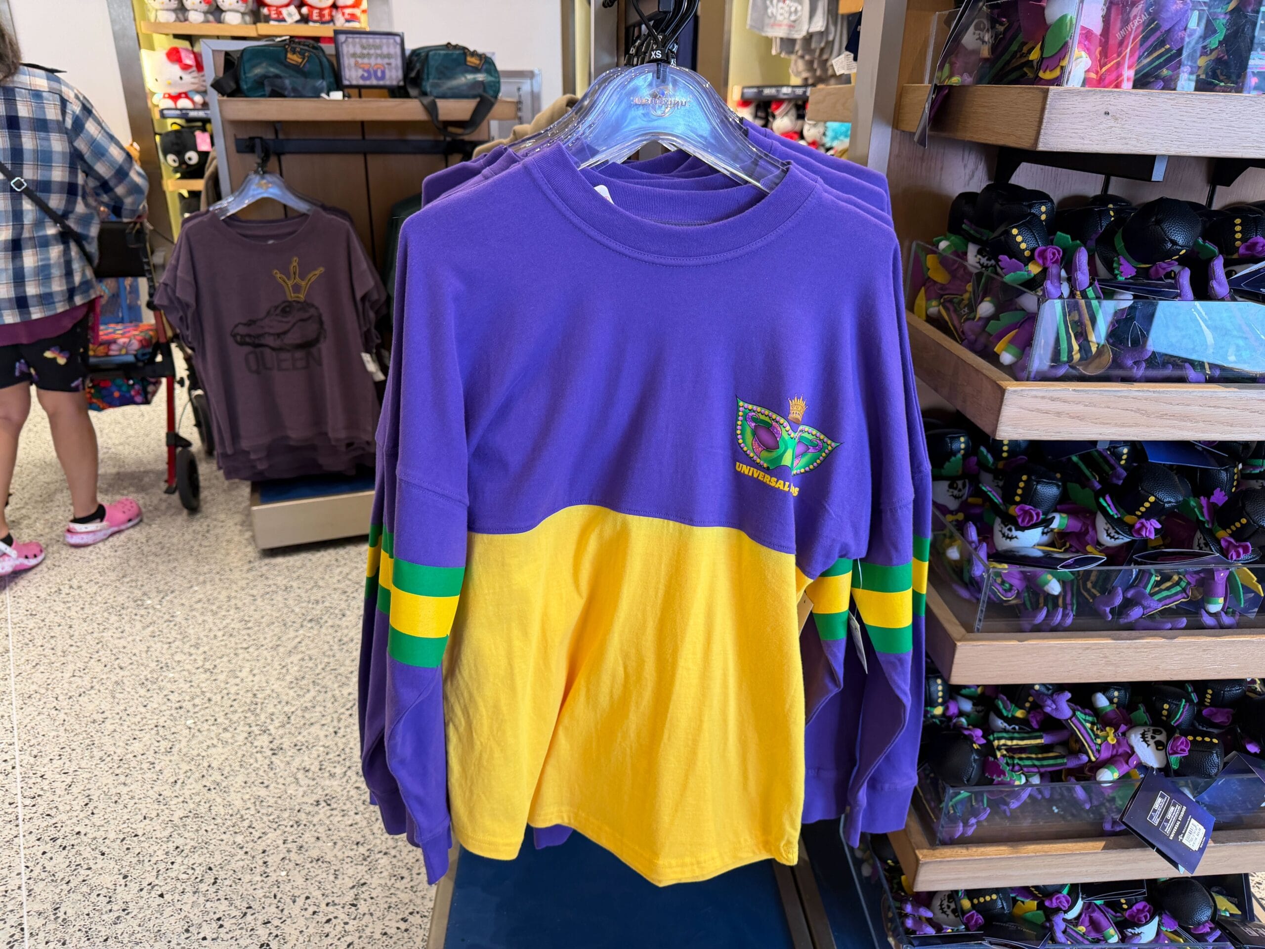 Fully covered in sequins, this football jersey is also a way to celebrate Mardi Gras in style. The body of the shirt is white with sequins, while the words “Mardi” and “Gras” comprise purple and green sequins, respectively. “Universal Studios” is in gold beneath it. Each arm has a three-stripe layer with purple, gold, and green sequins.