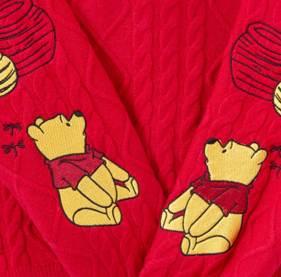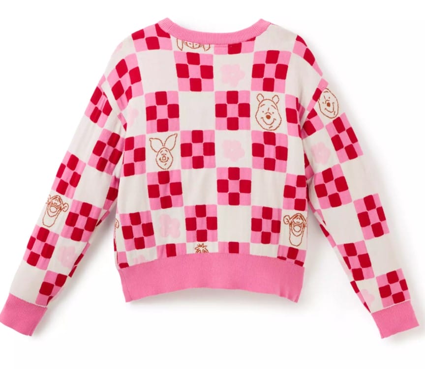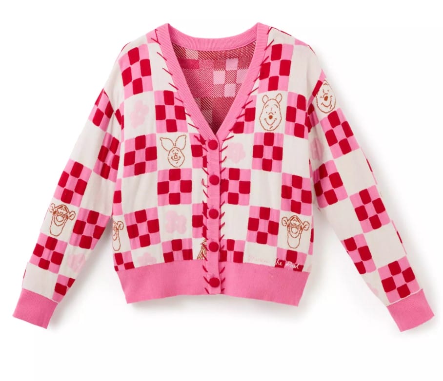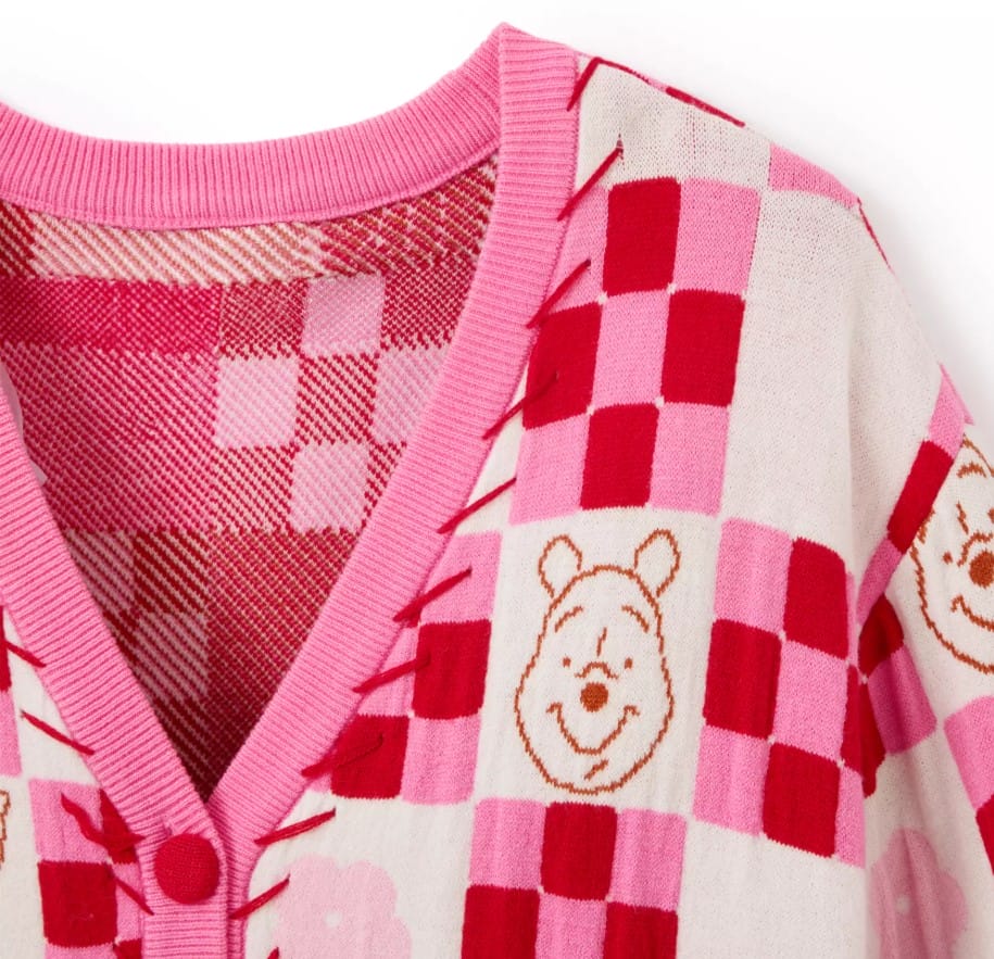 This cardigan has an allover knit checkered and floral pattern with fabric buttons, dropped shoulders, and ribbed cuffs, hem, collar, and placket. There is woven line art of Tigger, Piglet, Winnie, and Eeyore on the cardigan, and ”Winnie the Pooh” is embroidered on the front hem.