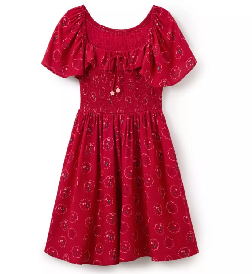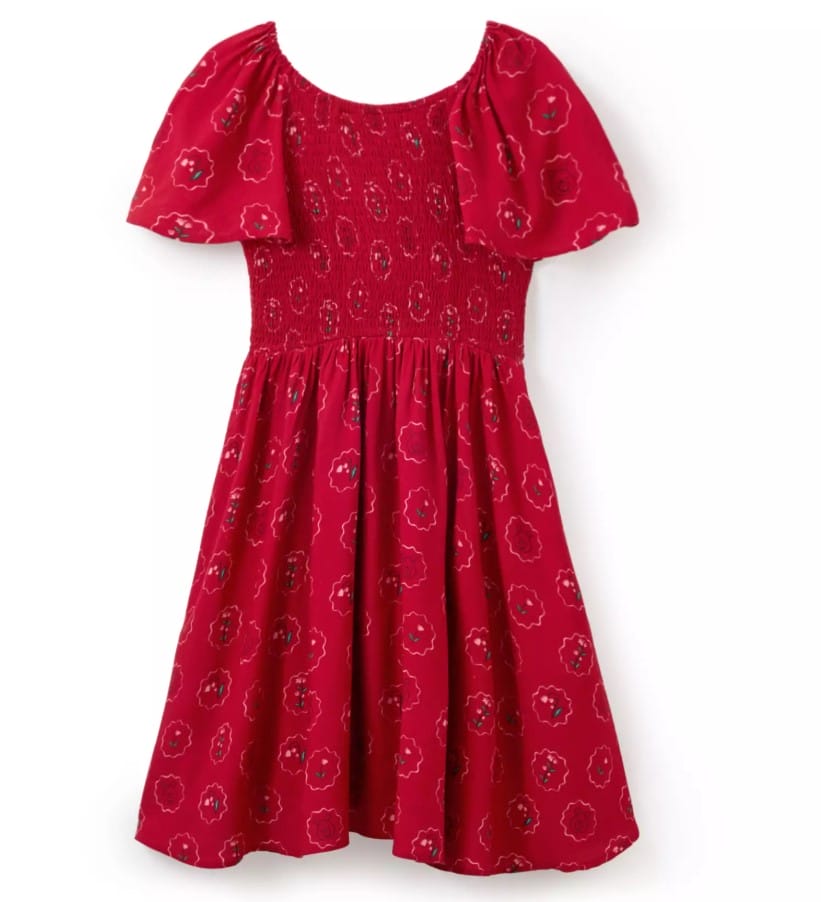 The red dress has smocking on the bodice, draped sleeves, and enamel floral charms on the cord tie. There are side slit pockets. A smiling Pooh is featured throughout the all-over print.