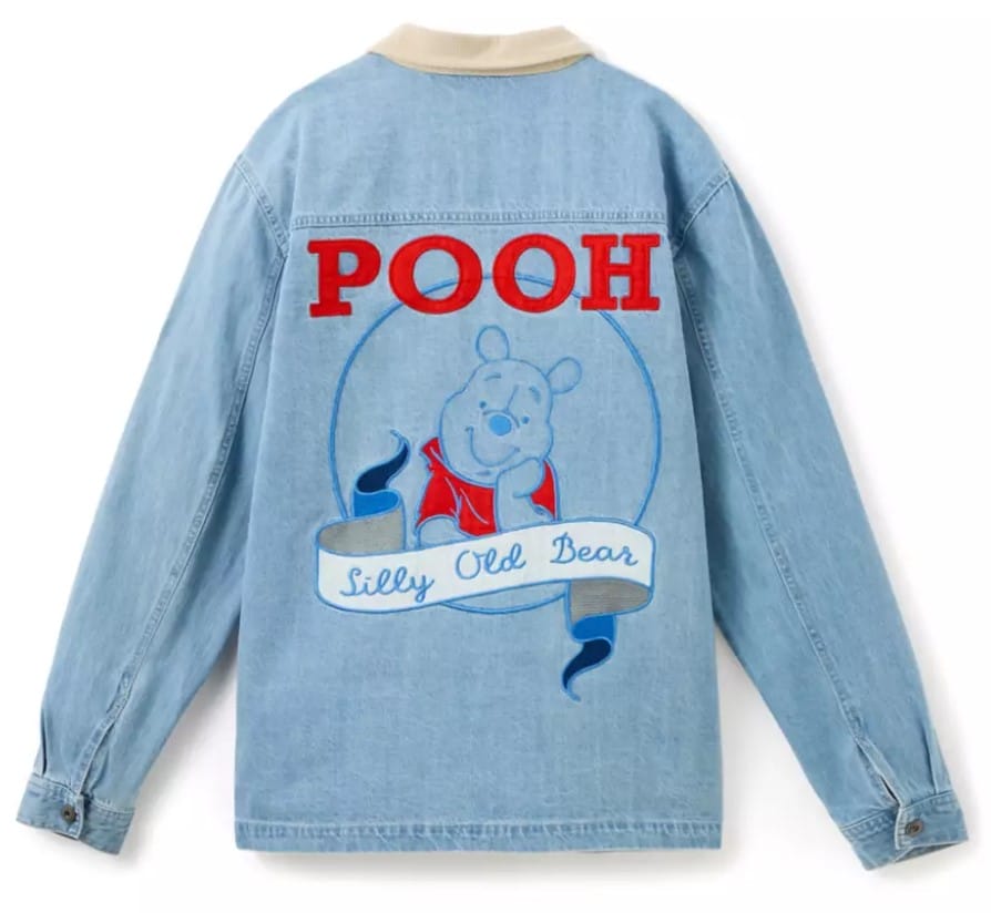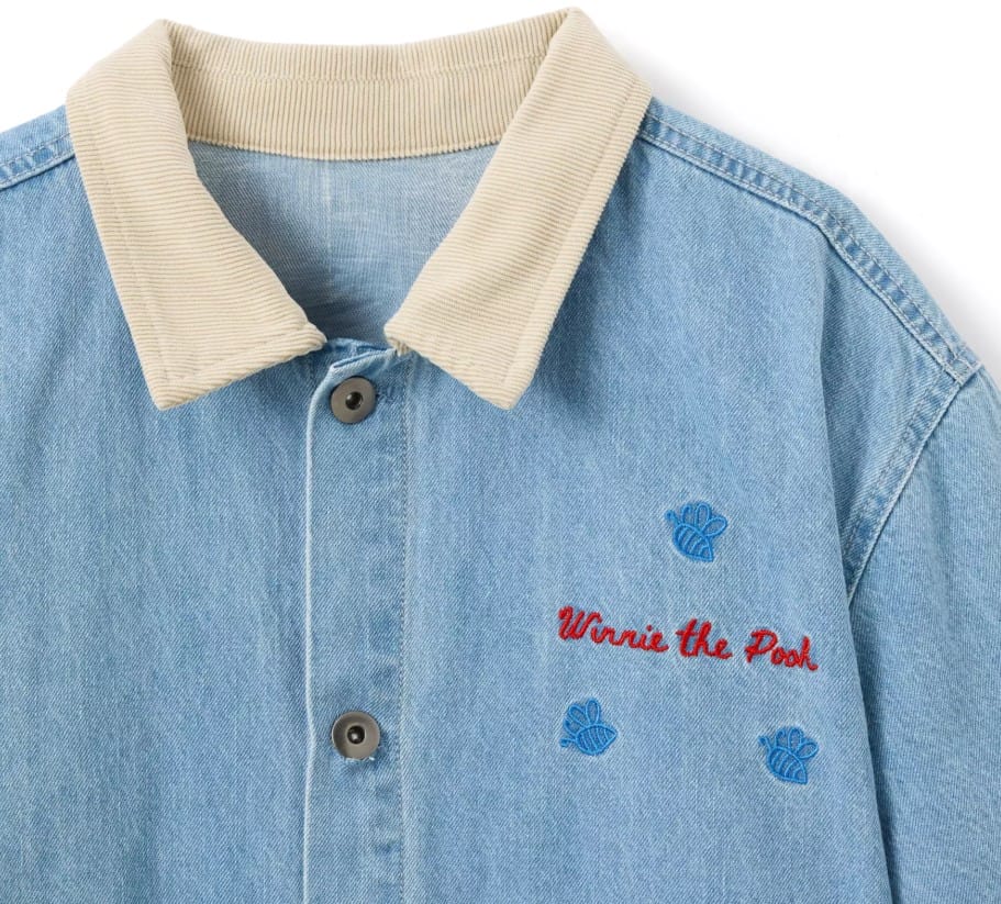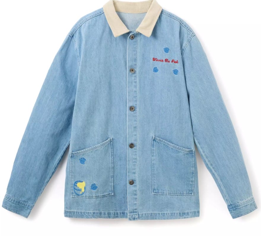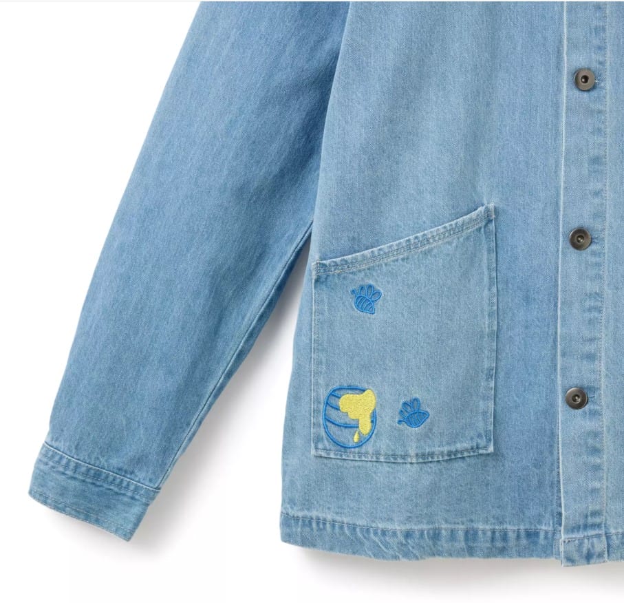The lightweight denim shacket features embroidered honeybees, a honey pot, and a ”Winnie the Pooh” signature on the front.