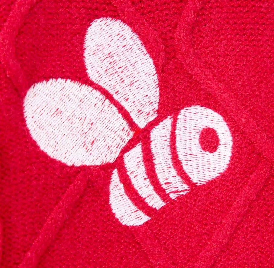 This red pullover cable-knit sweater has long sleeves and dropped shoulders. It also has ribbed hem and cuffs.