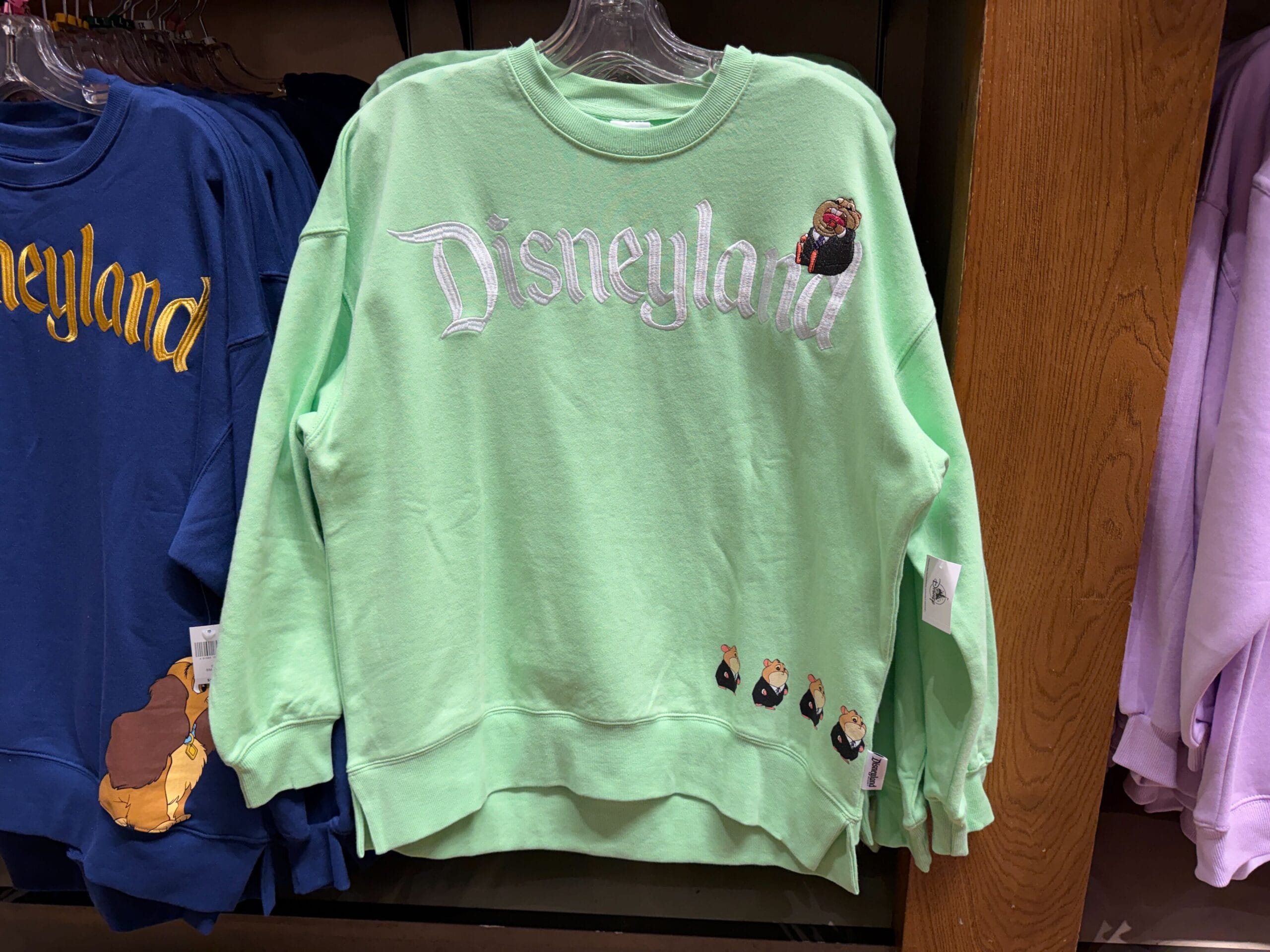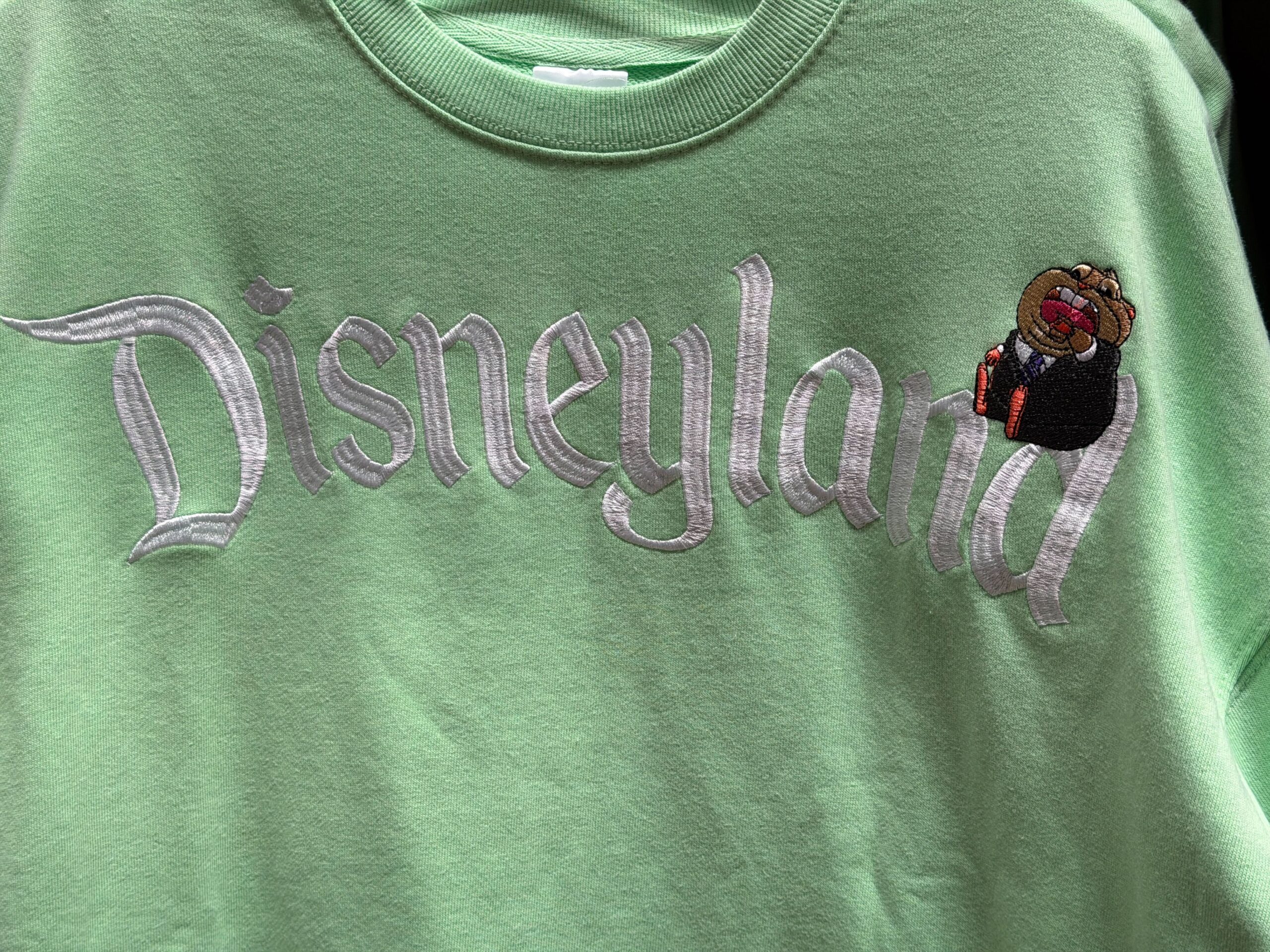 This mint green pullover has “Disneyland” embroidered in white across the chest. It has ribbed cuffs, hem, and neck, plus dropped shoulders.