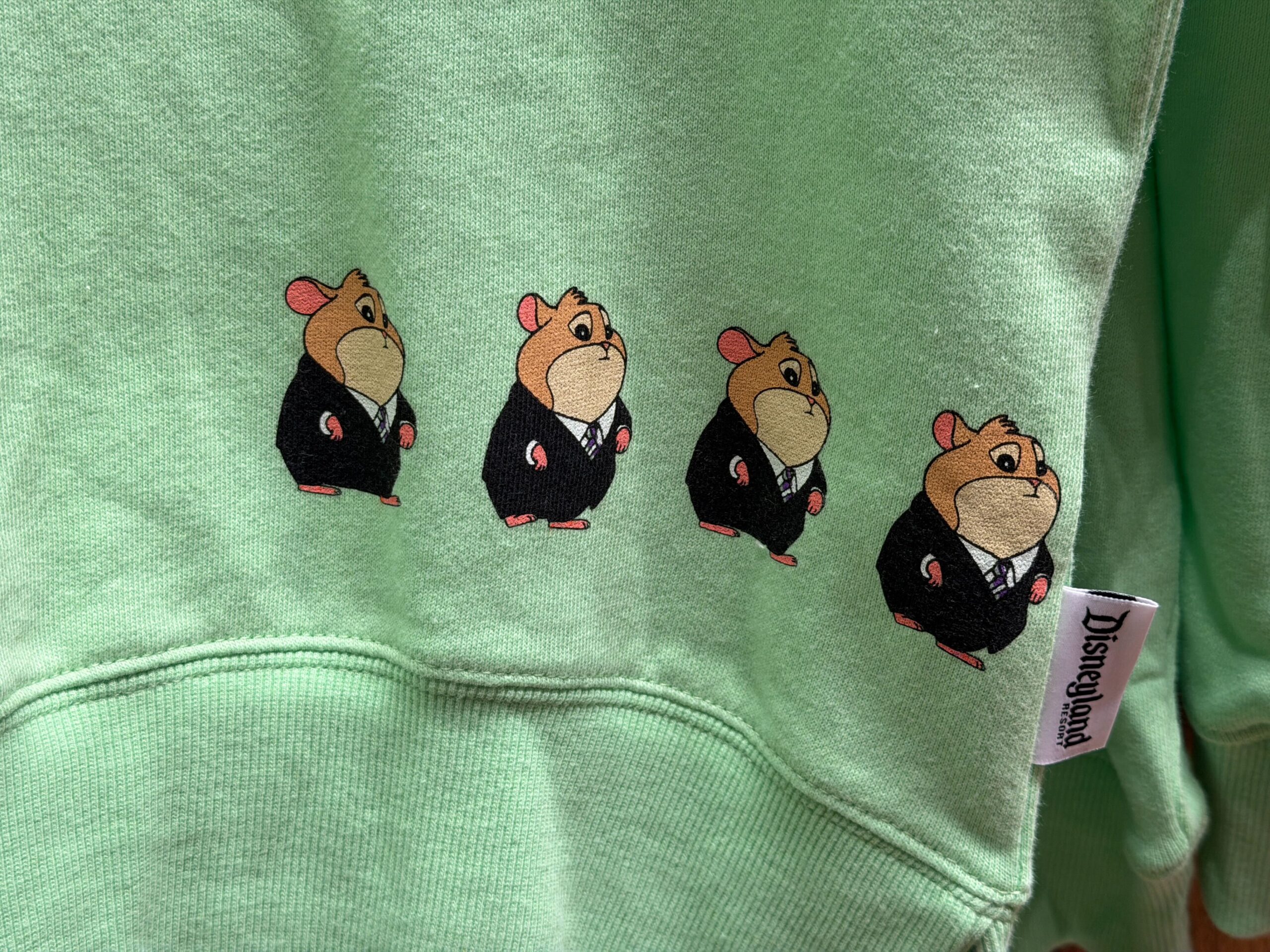 Sitting on “Disneyland” is an embroidered appliqué of a lemming in a suit eating “pawpsicle.” A line of four lemmings is above the hem.