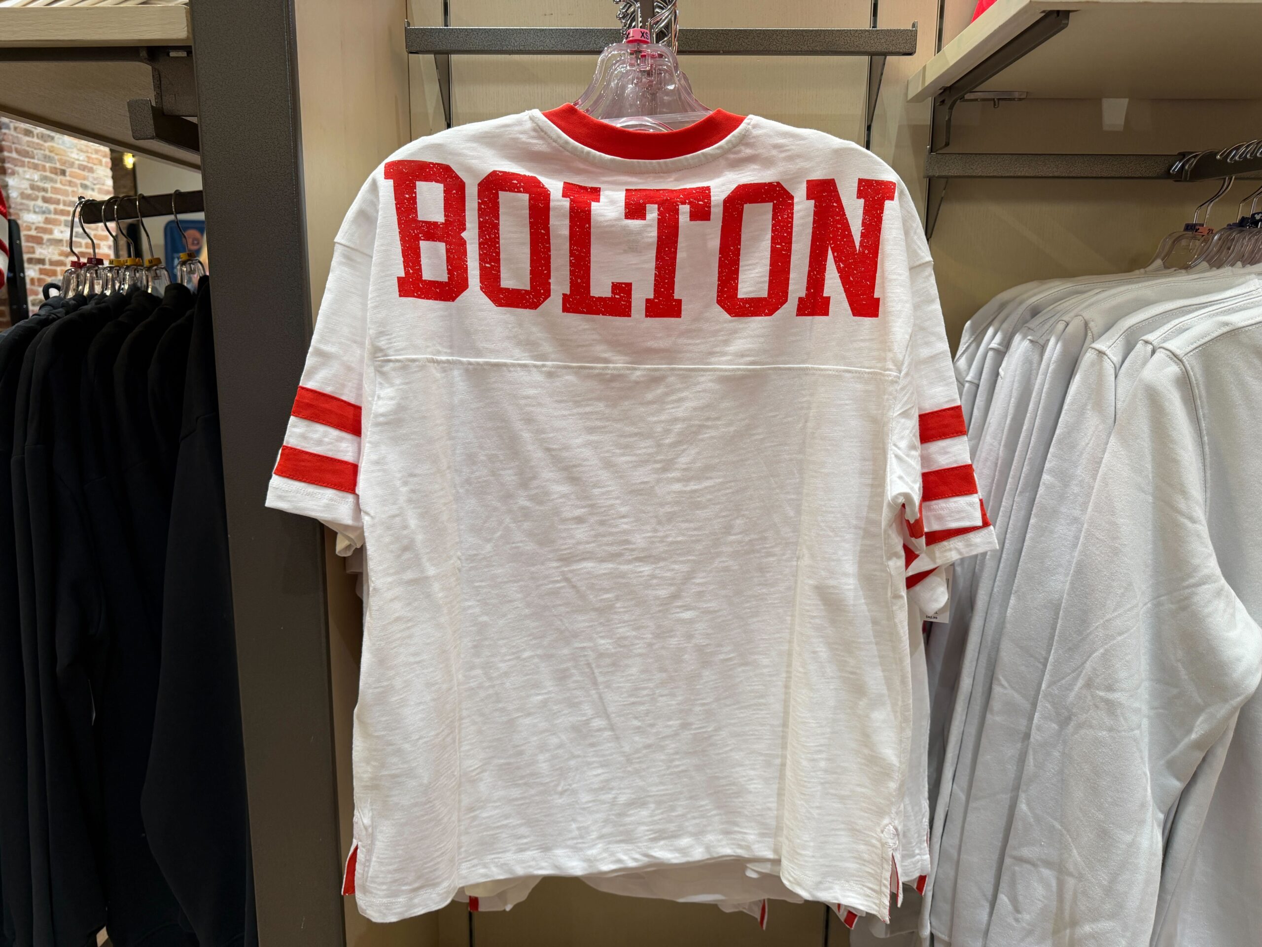 This white jersey has red stripes on the sleeves and red trim around the v-neck. “Wildcats” and the team’s mascot are on the front. “Bolton” is across the back.