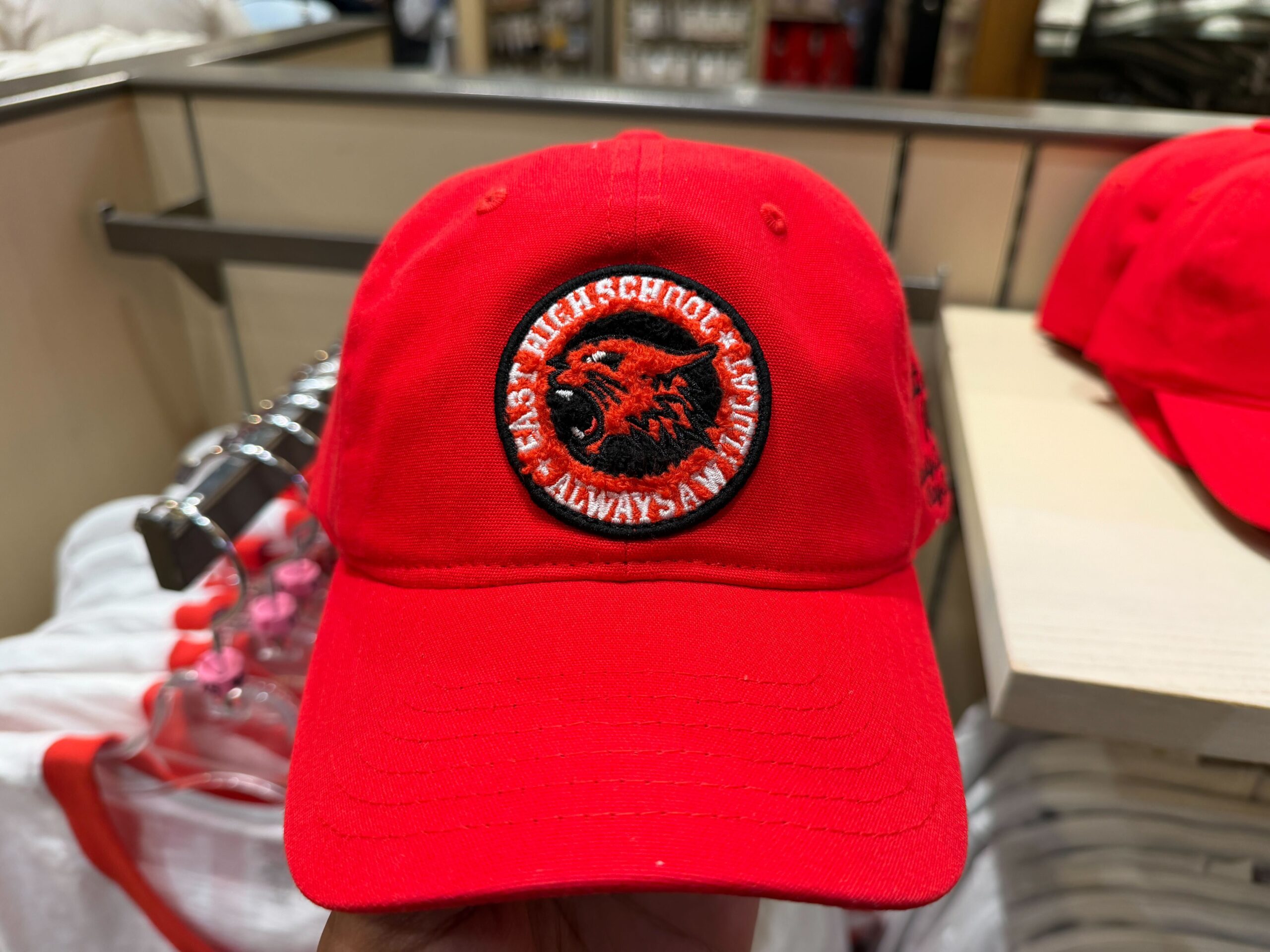 The matching ball cap is red. A fuzzy patch embroidered on the front reads “East High School – Always a Wildcat” around the mascot.