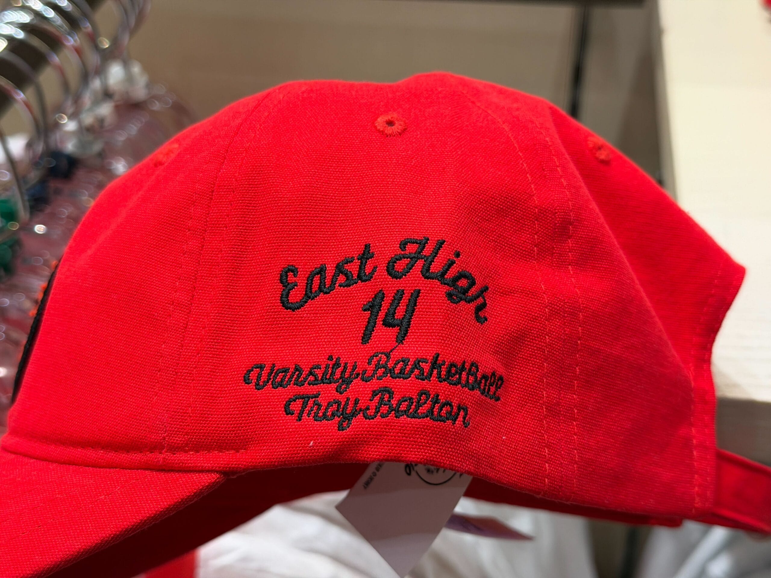 On the side is “East High – 14 – Varsity Basketball – Troy Bolton.” It has an adjustable strap.