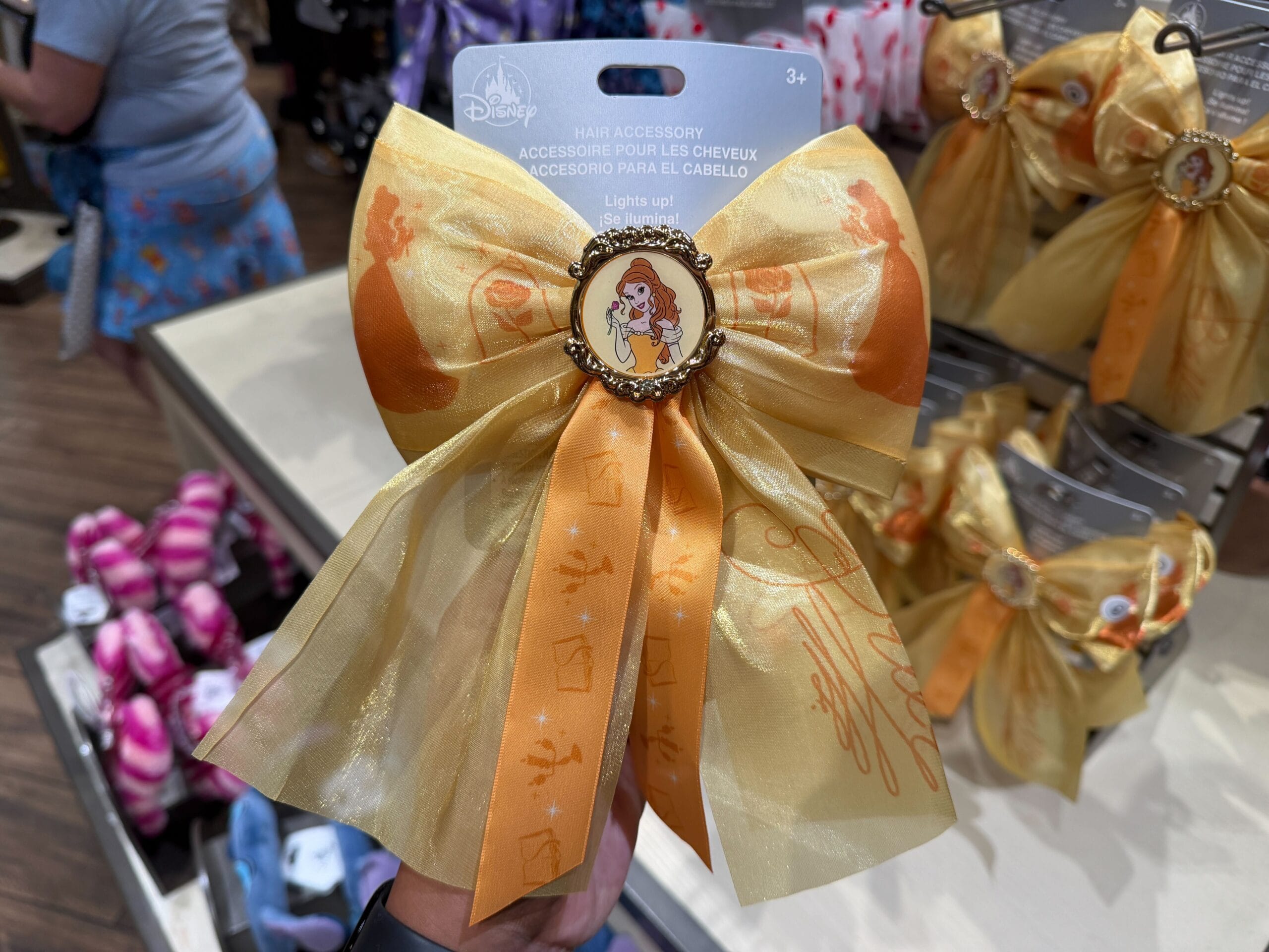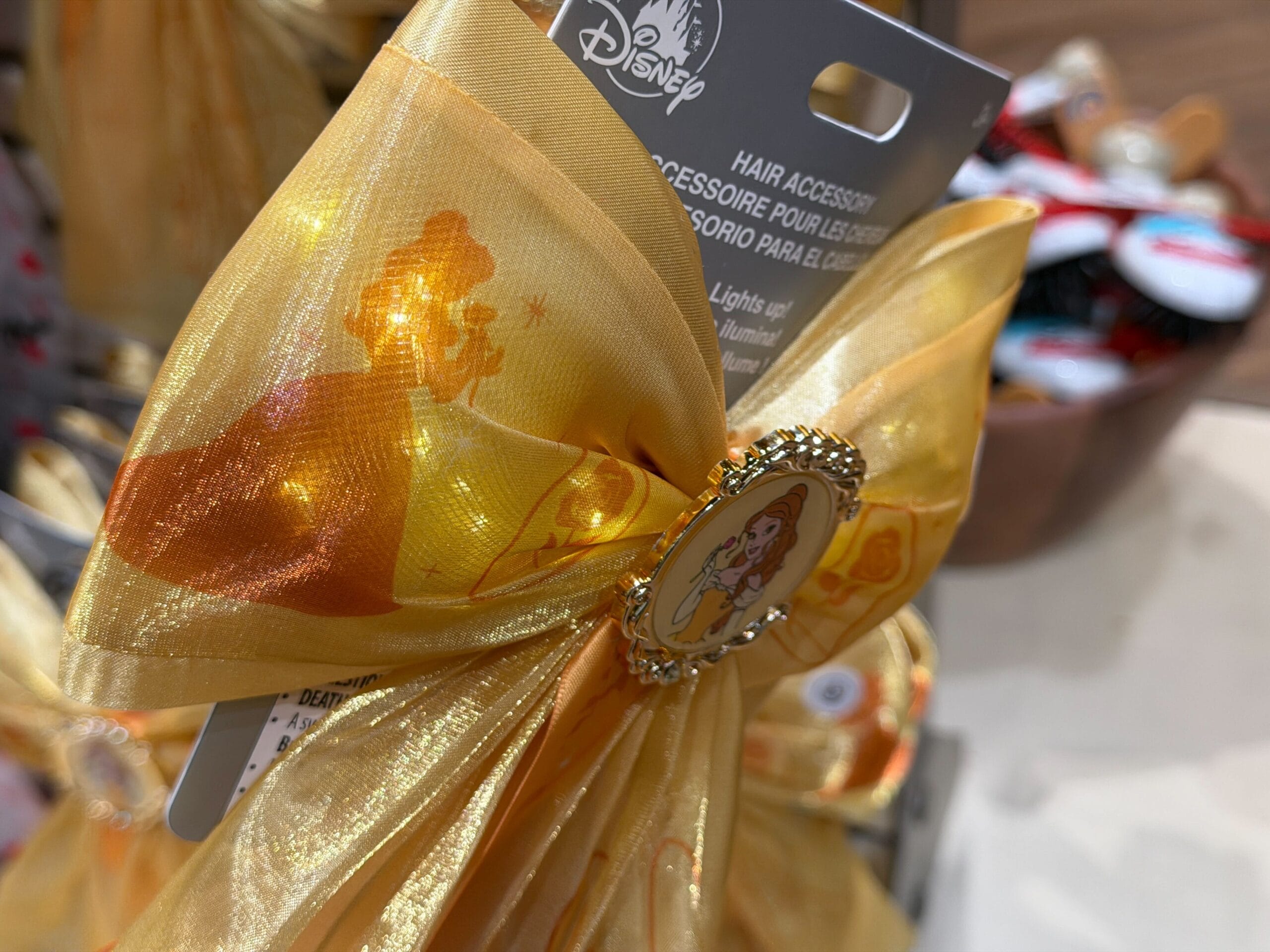 This is a light-up hair accessory for kids. It’s made with translucent yellow fabric accompanied by orange satin ribbons. Printed on the bow is Belle’s silhouette and the Enchanted Rose. An image of Belle is in the center.