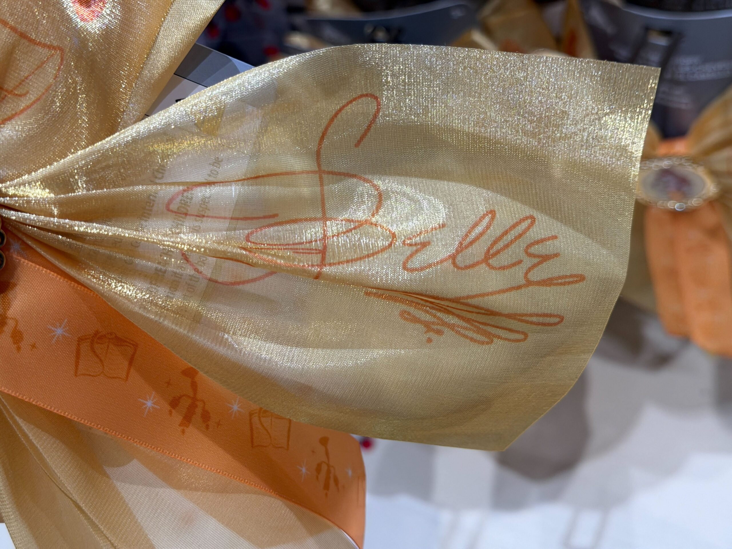 Belle’s autograph is on one tail of the bow. The ribbons are patterned with books and Lumiere’s silhouette.