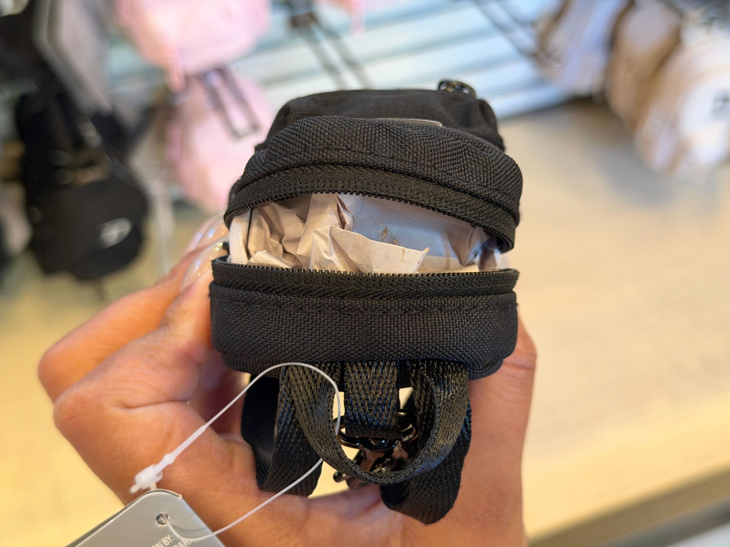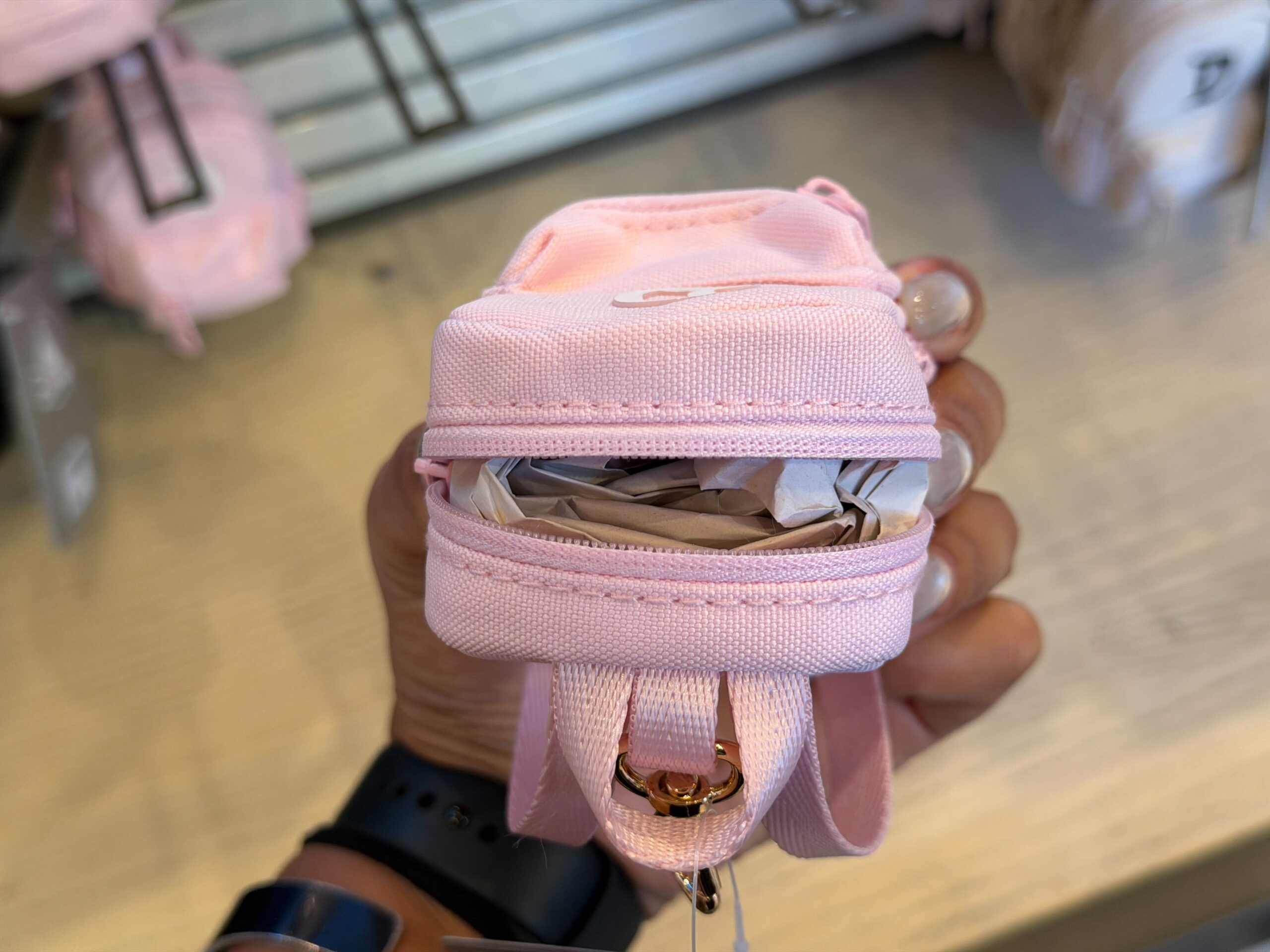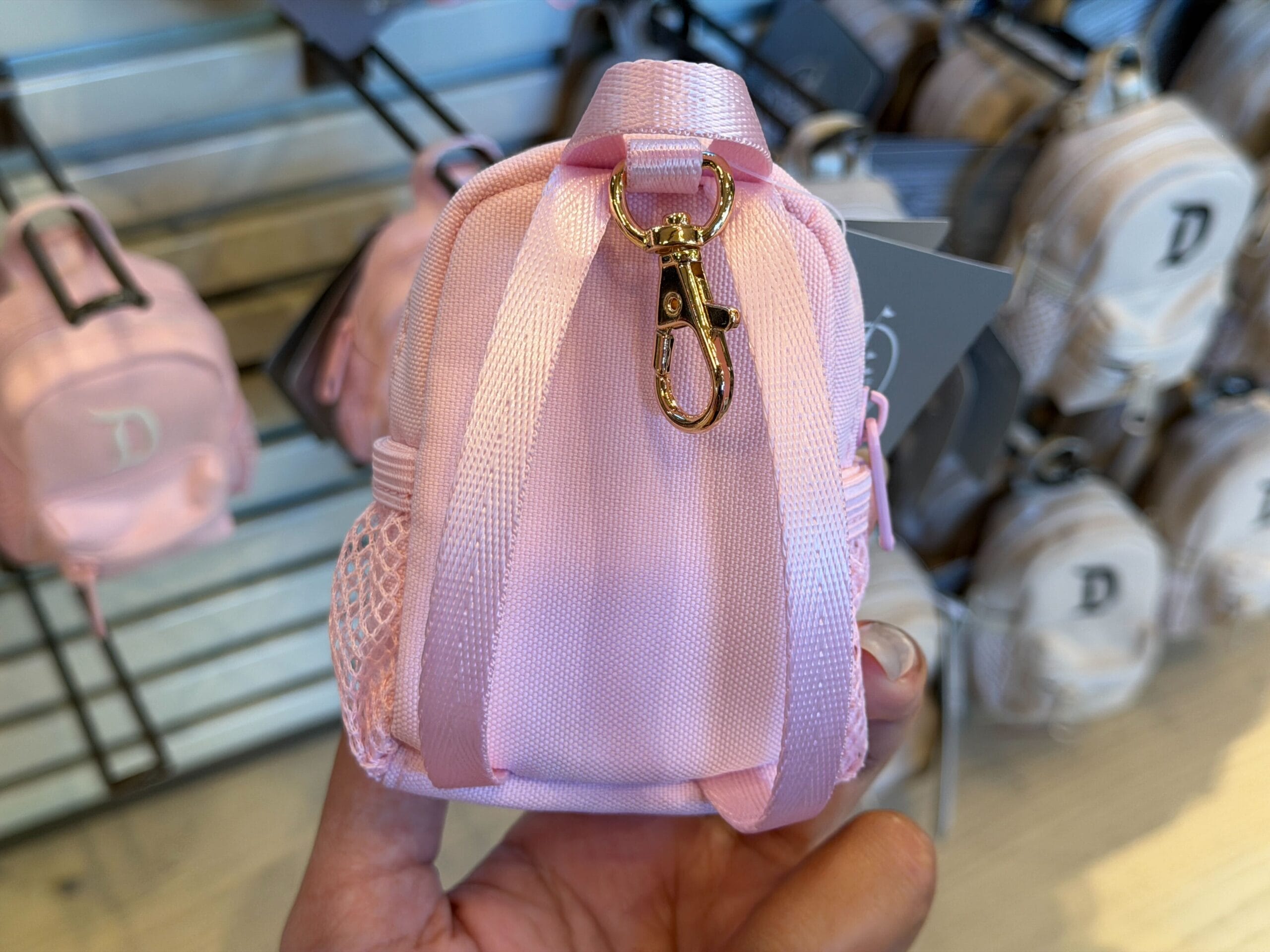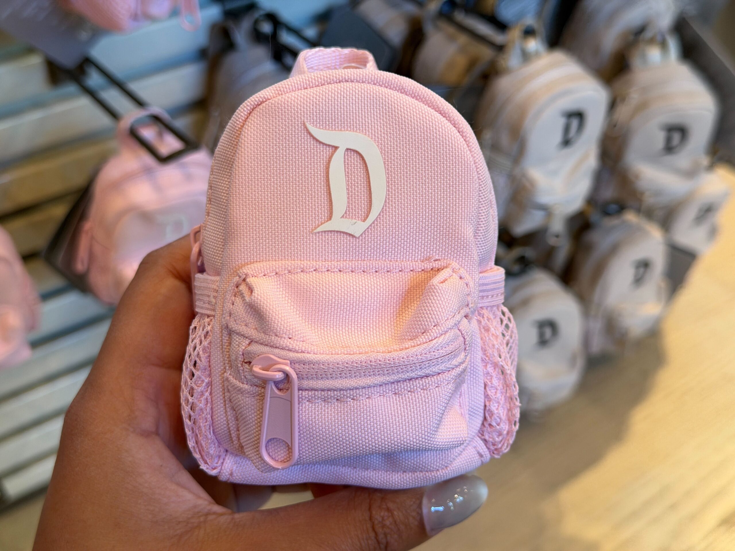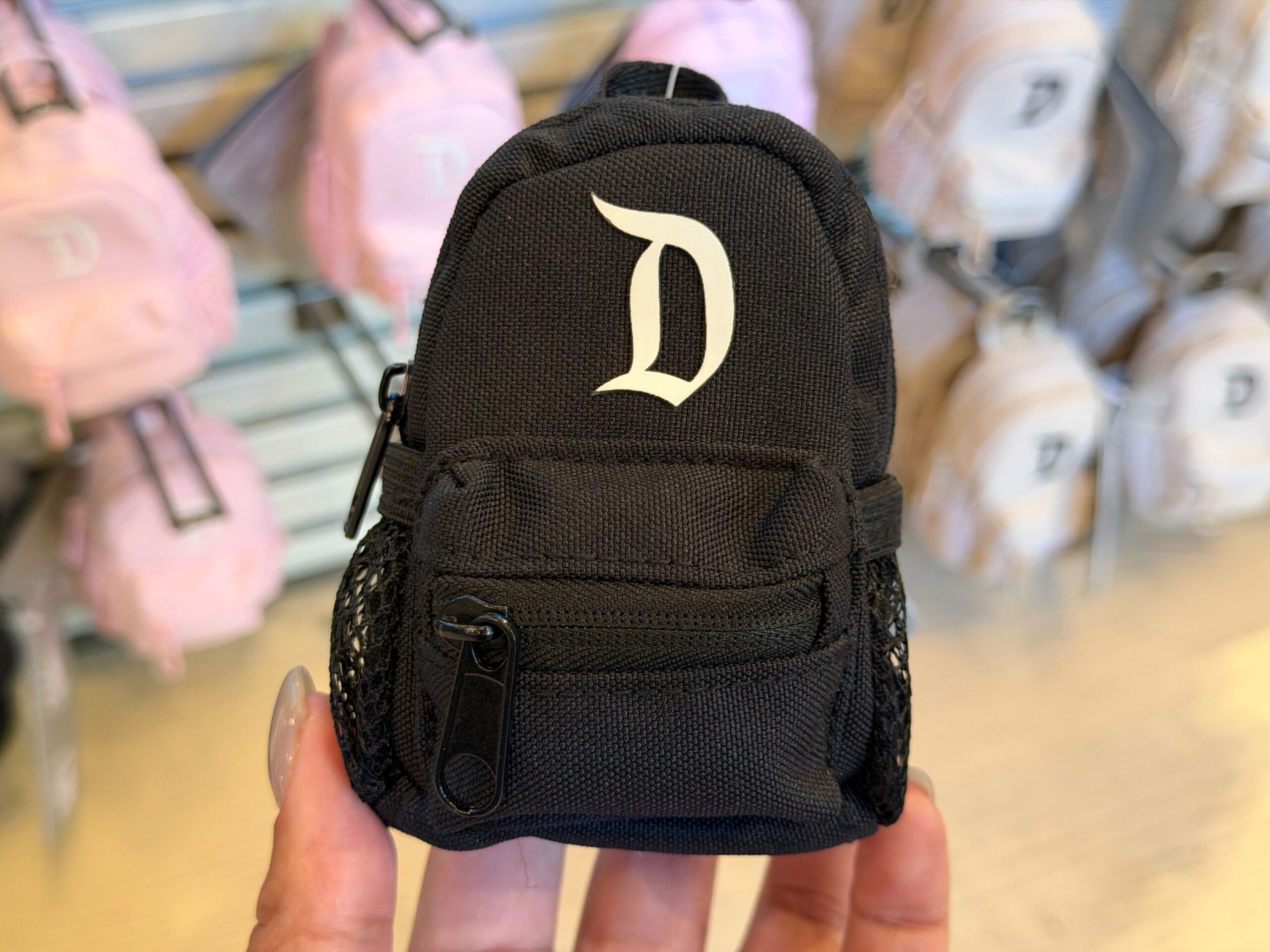 These tiny backpacks feature small zip pockets and mesh side pockets. The Disneyland “D” logo is on the front. This bag is black, including the hardware.