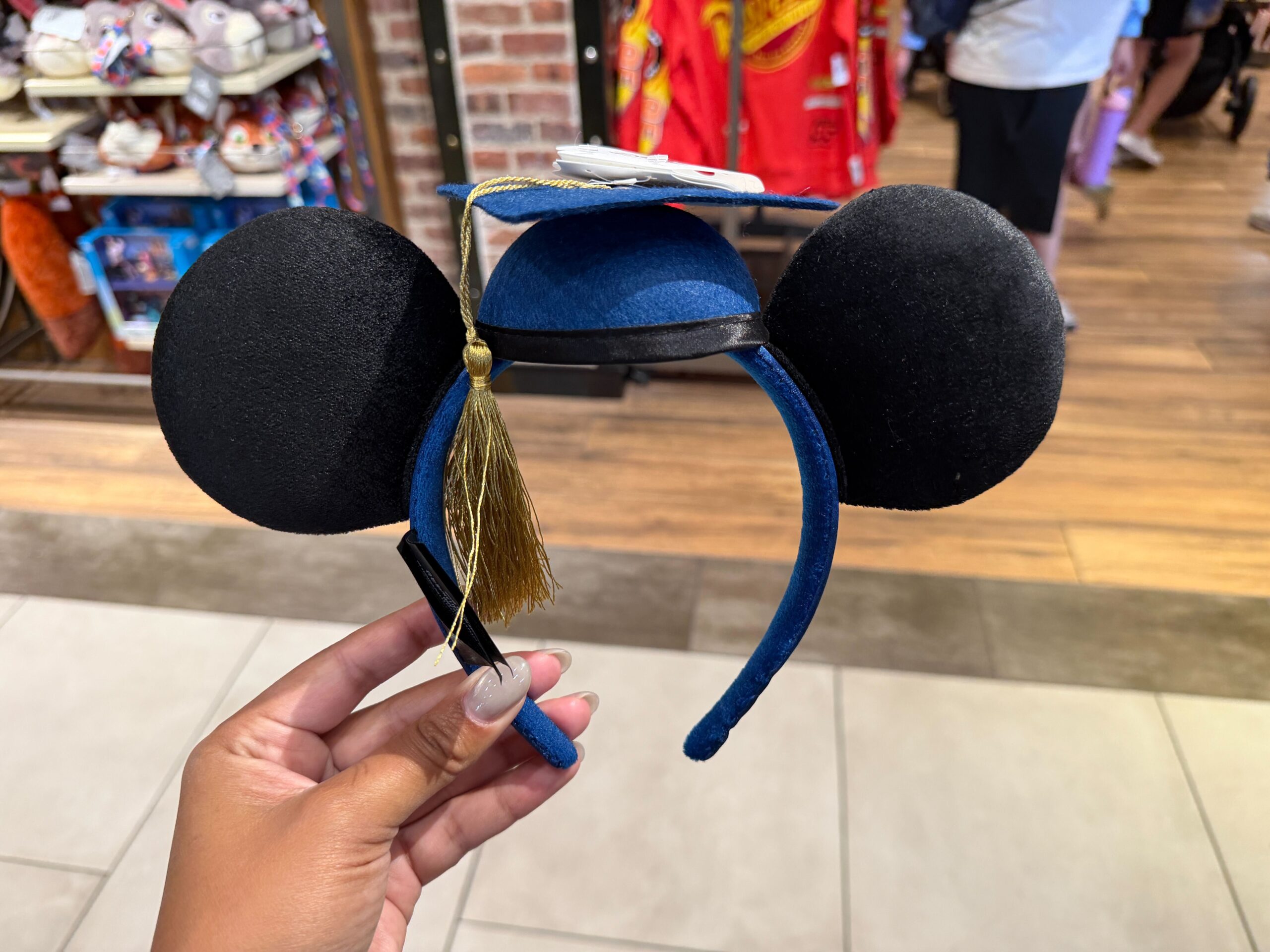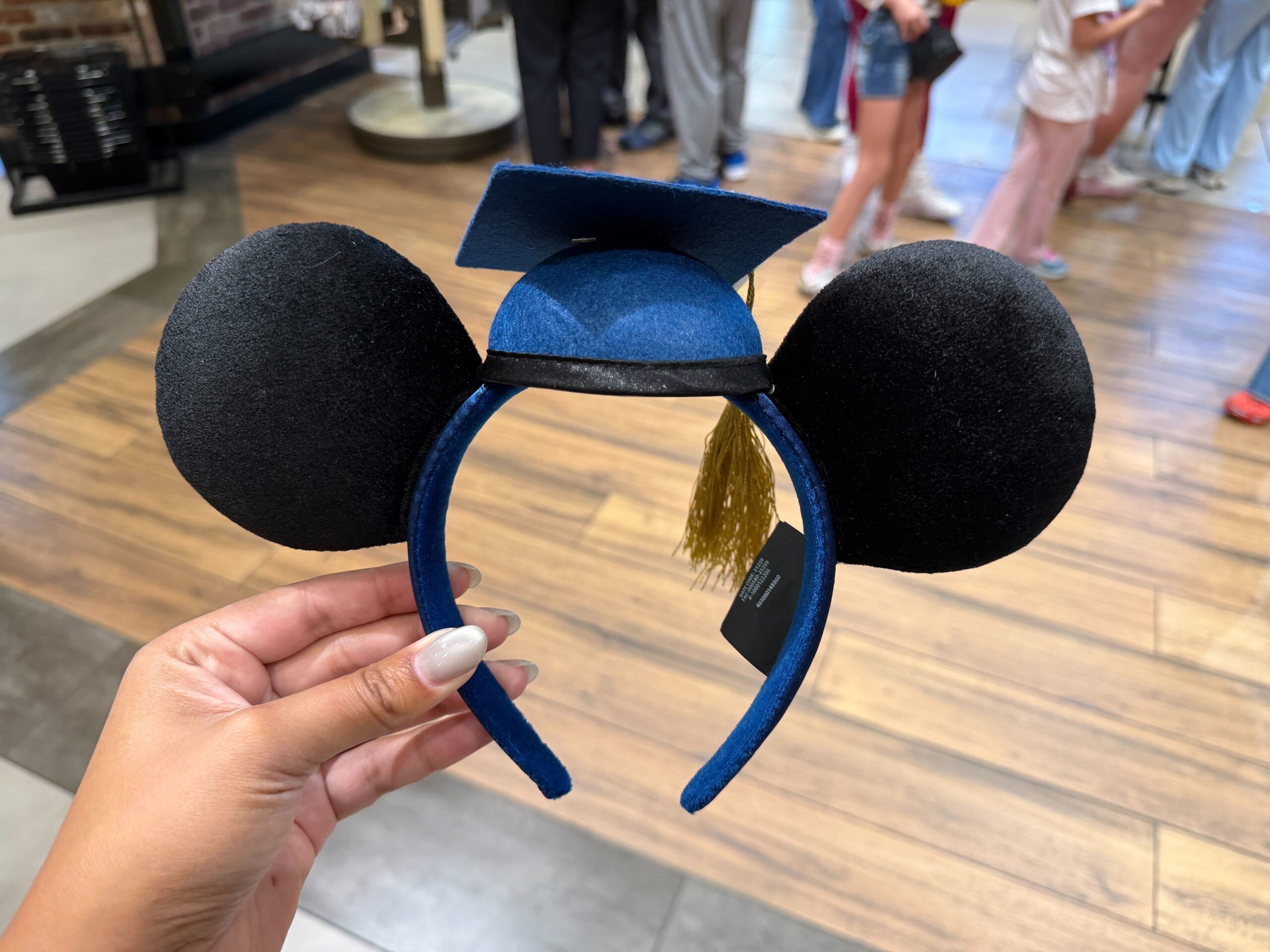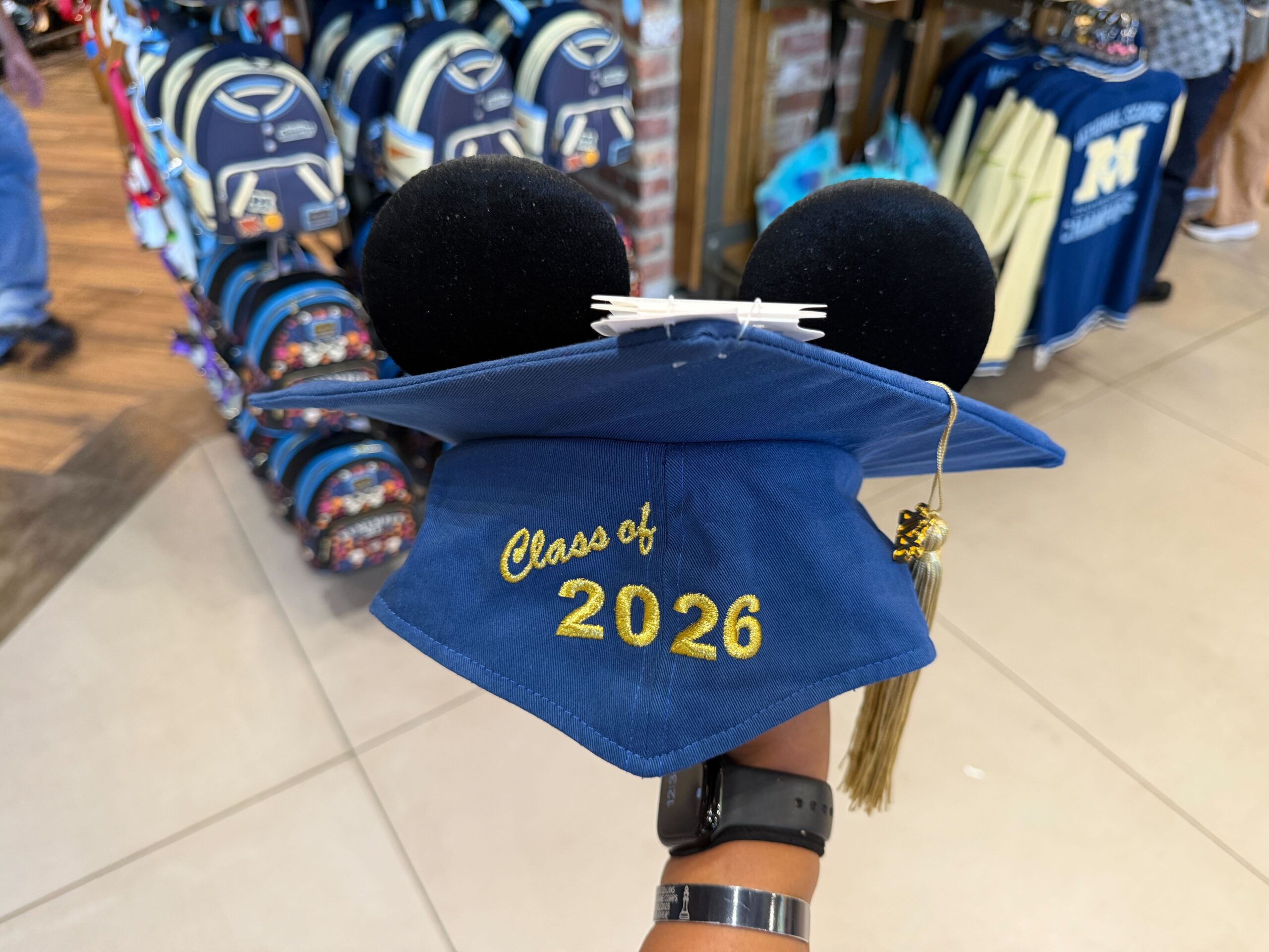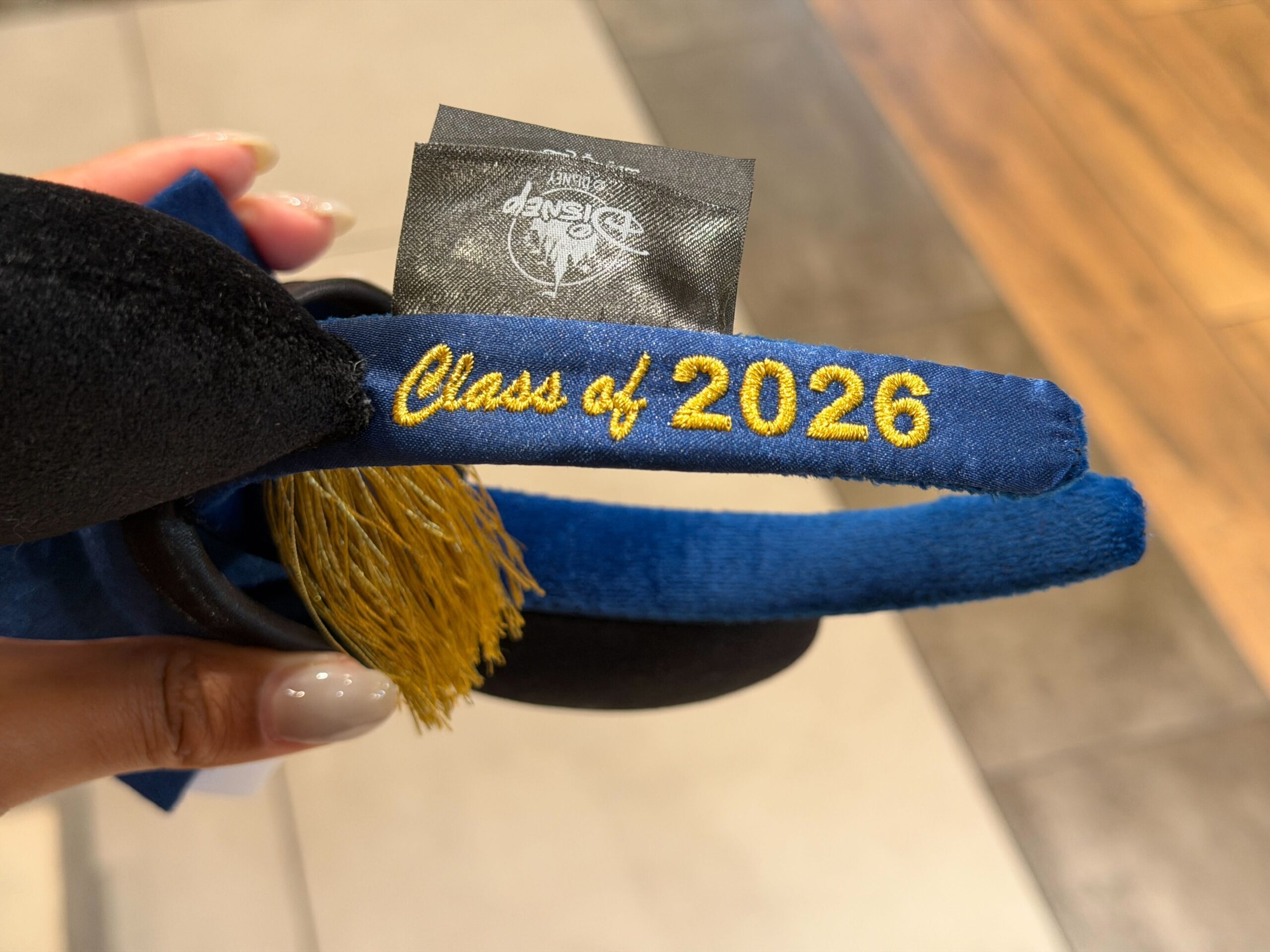The ear hat is also blue. It resembles a full-sized traditional graduation cap. Black mouse ears are on top with the golden tassel. “Class of 2026” is embroidered on the front.