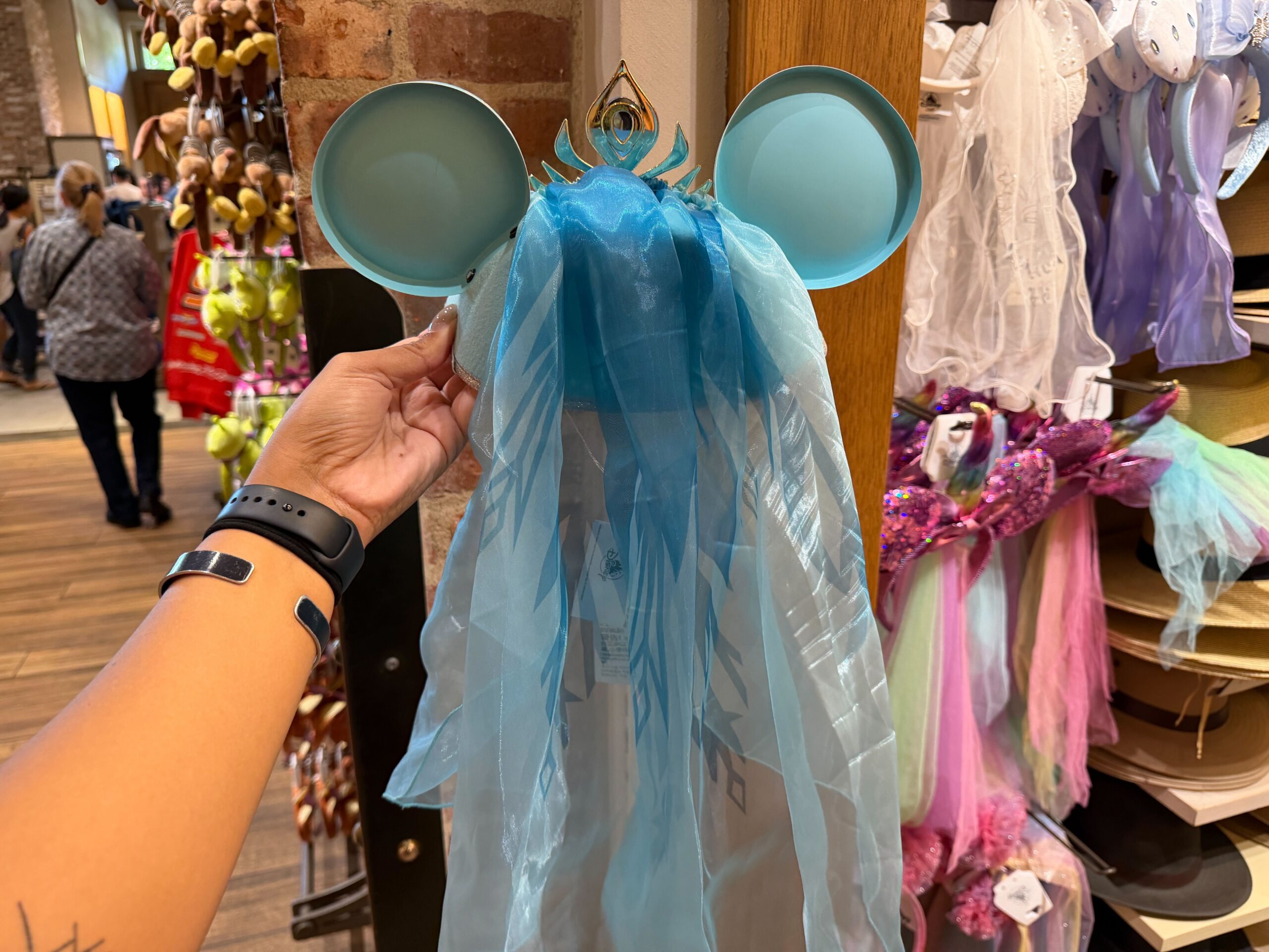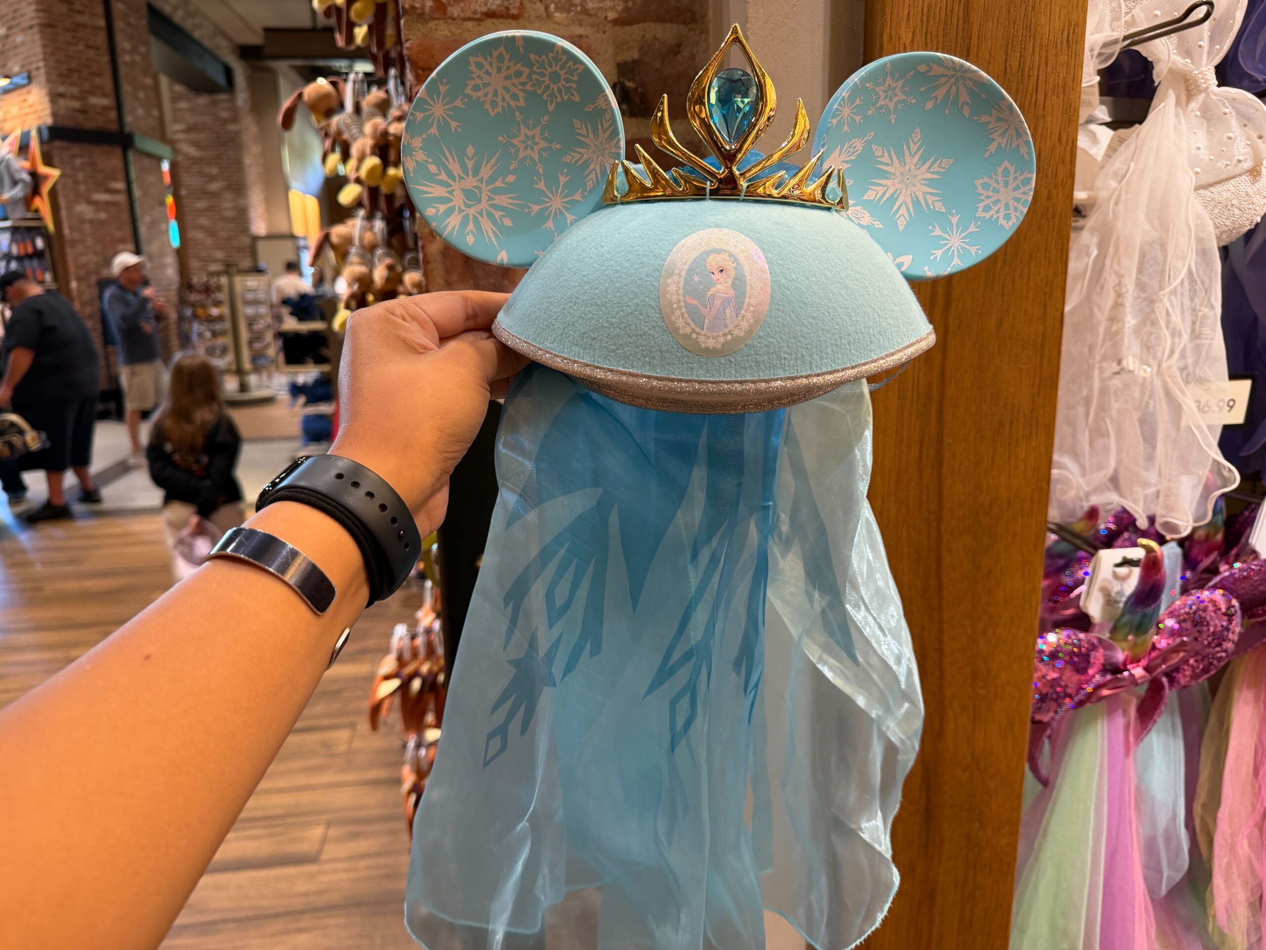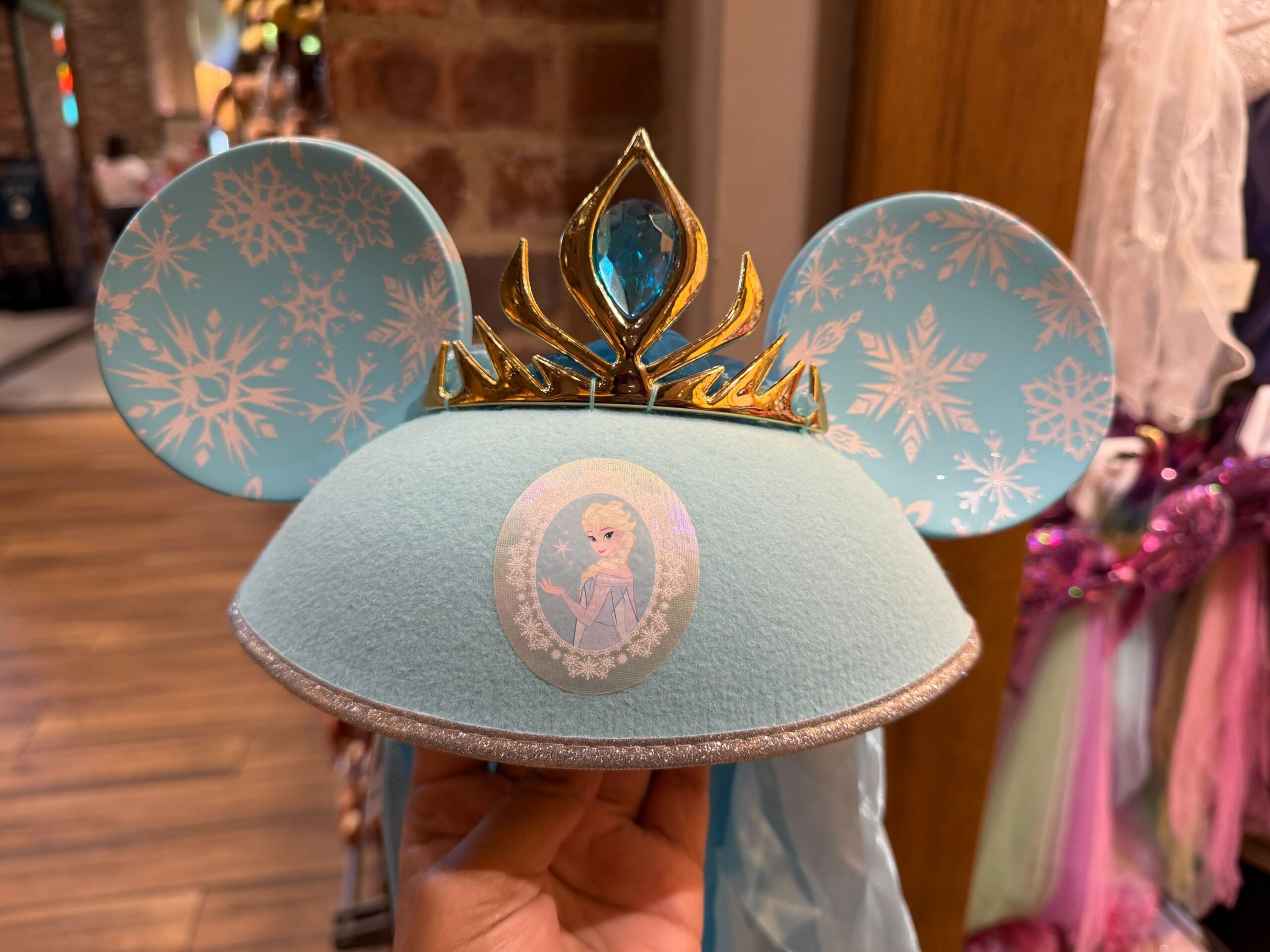 This youth ear hat is pale blue with snowflake-patterned ears. The cap has silver trim. An image of Elsa is on the front. It’s topped by a metallic gold plastic tiara with a blue gem.