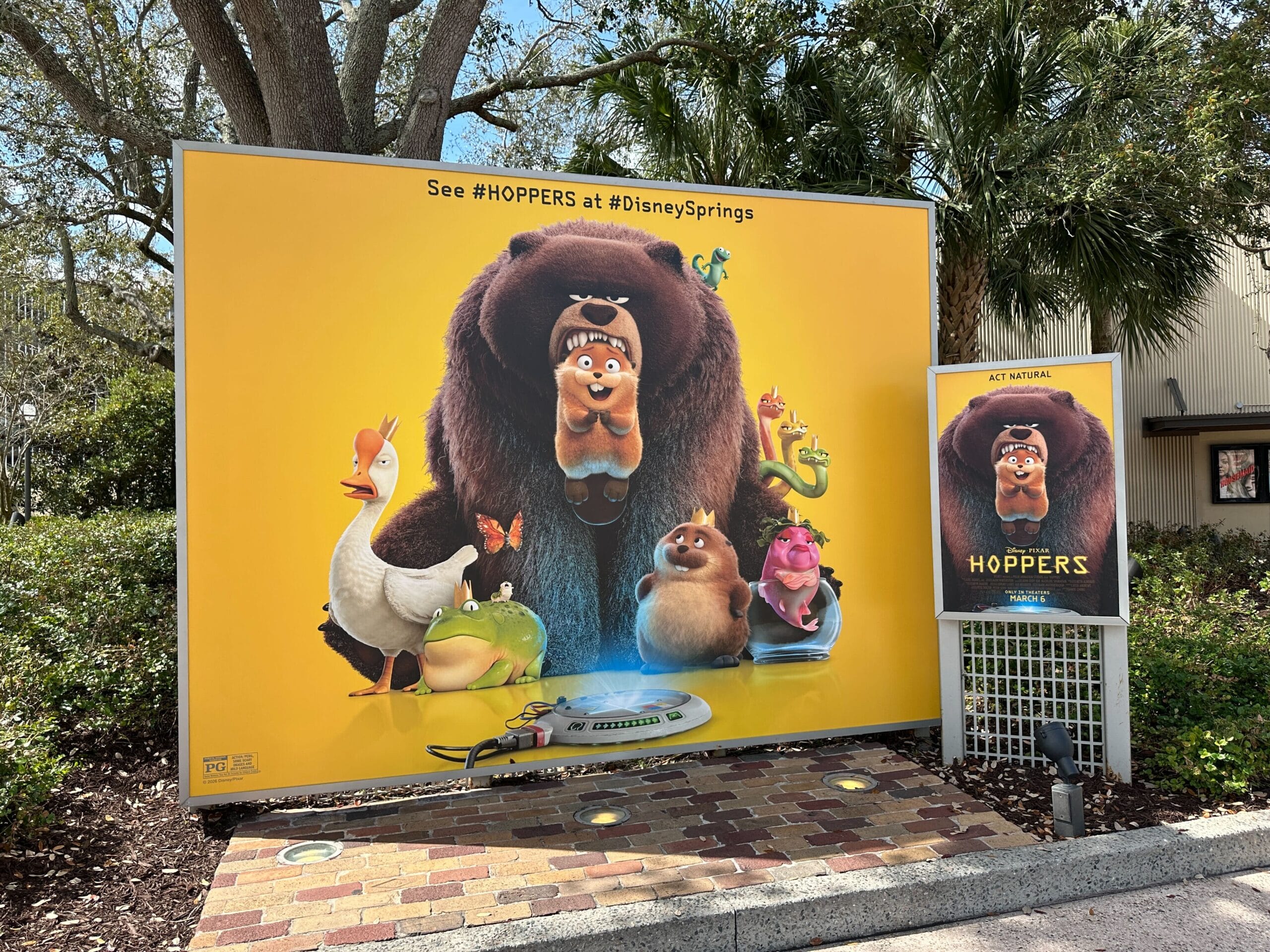 Along the walkway leading to the theater is another, smaller poster sign as well as a large image with several animals from the film arranged in a way that guests can take a photo with it. The photo op sign encourages guests to see Hoppers at Disney Springs.