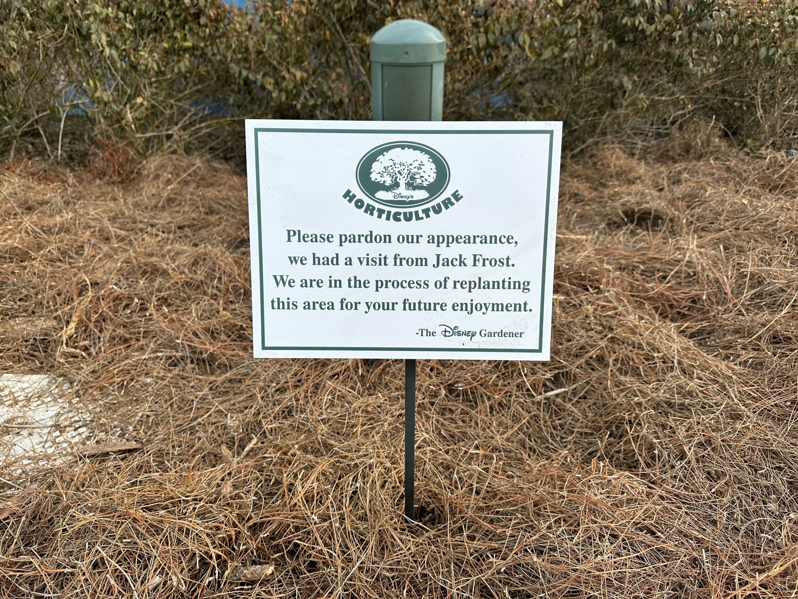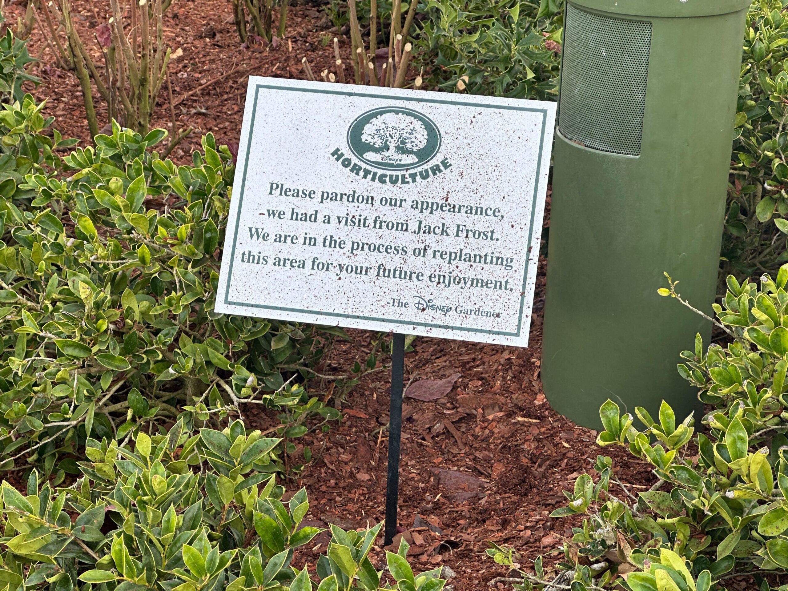 The horticulture team at Disney World has put signs up in various gardens after the freezing weather damaged many of the plants across property.