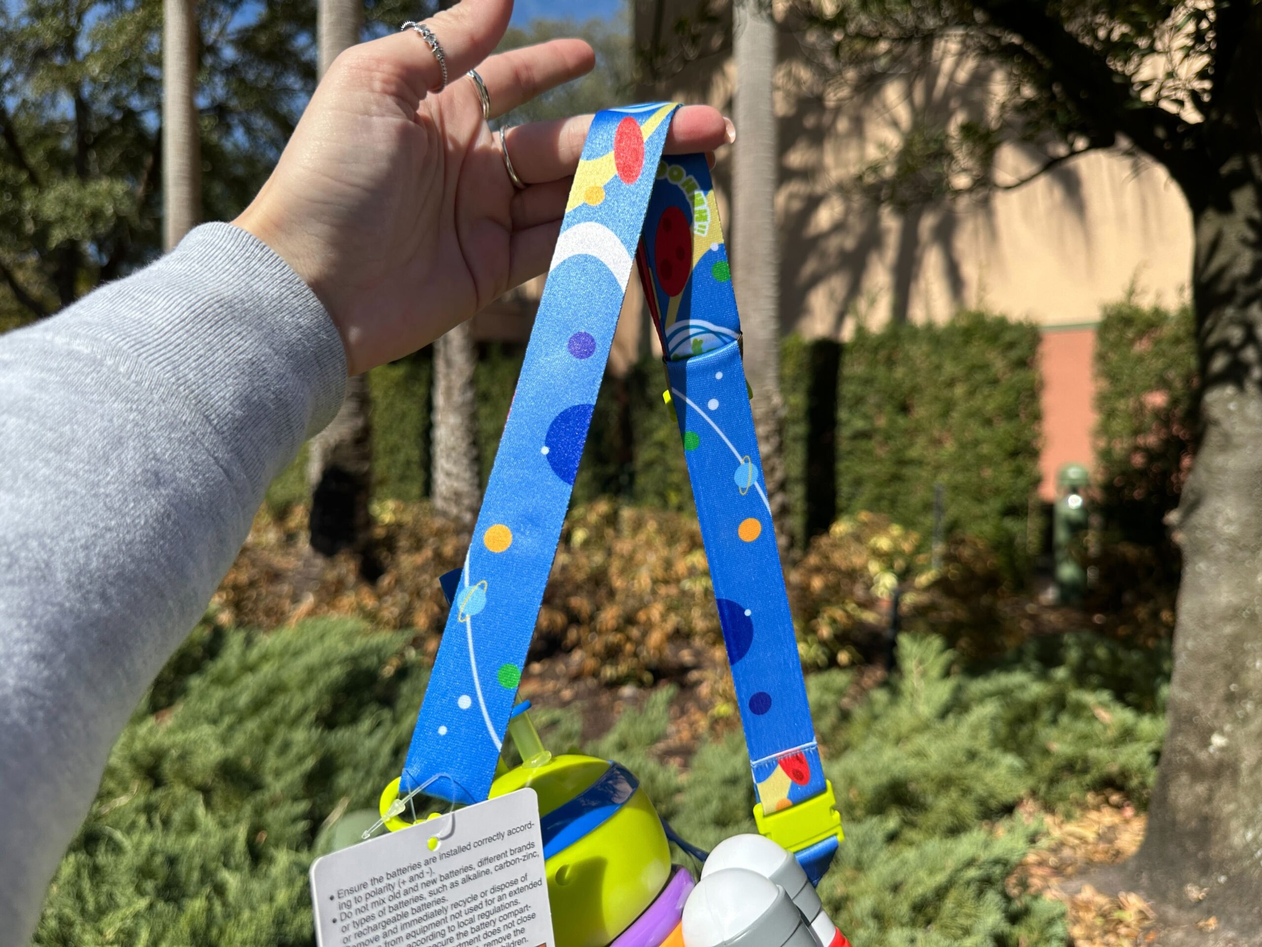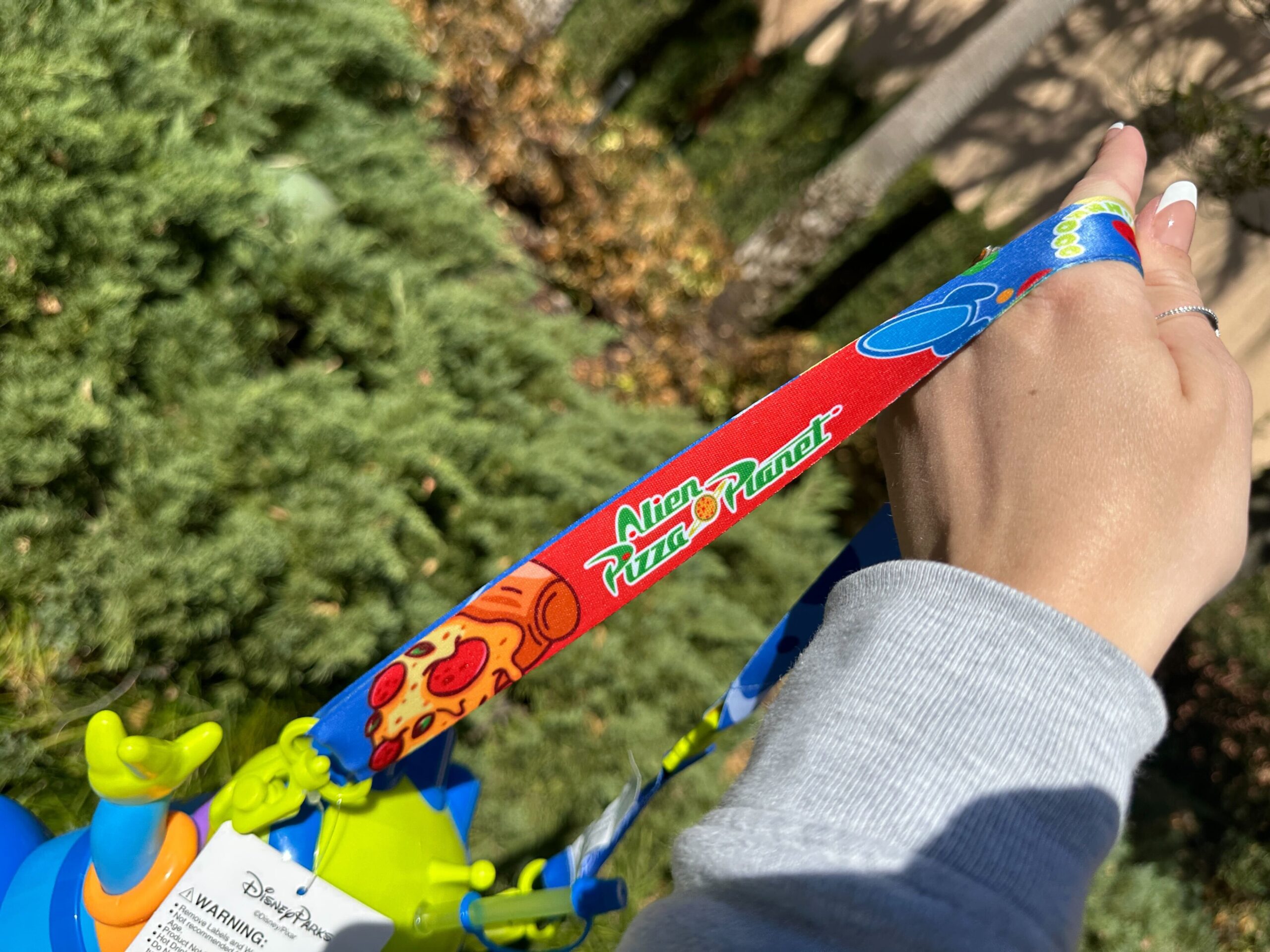 The sipper includes a detachable strap featuring pizza and alien imagery, as well as the Disney Parks wordmark.