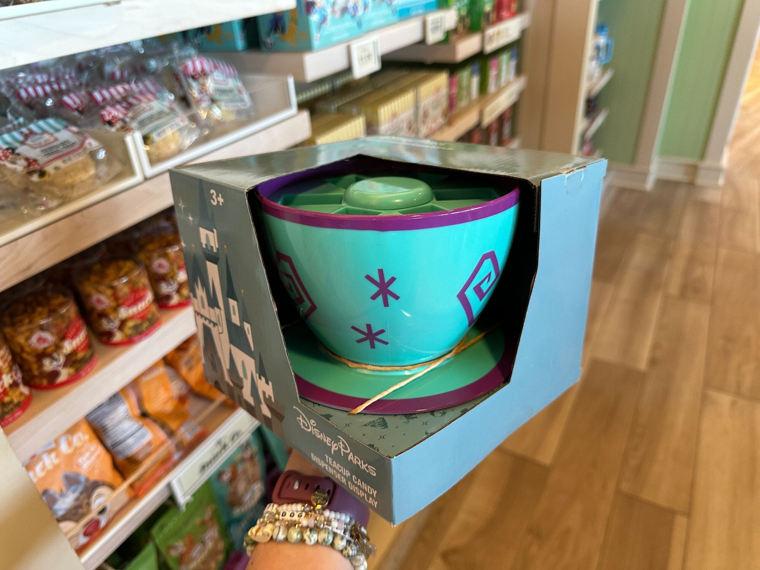 This Pez dispenser holder is in the shape of the turquoise and purple teacup from the Mad Tea Party ride at Disney World. We can see part of the holder sticking out from the packaging.