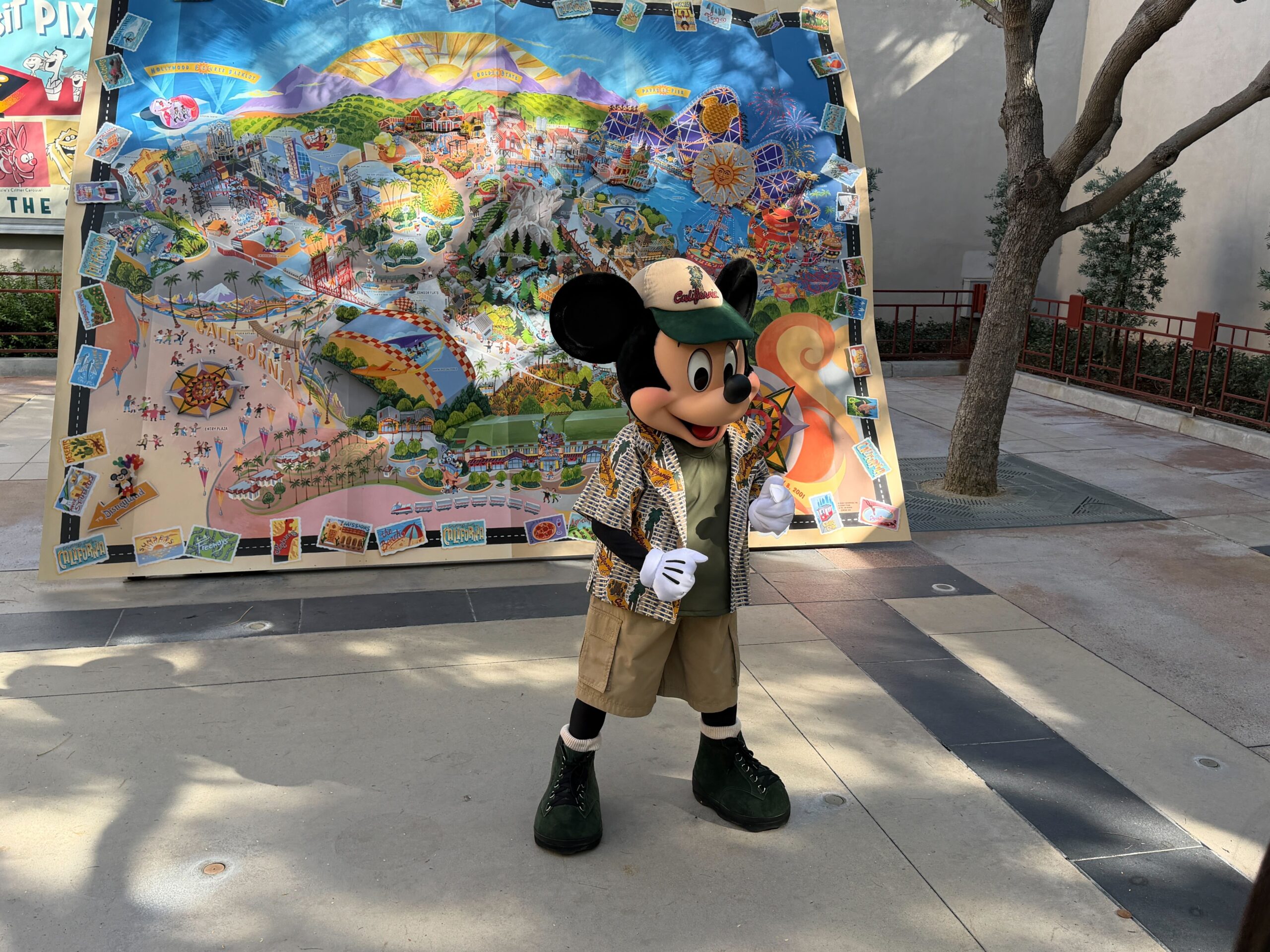 In front of the Disney California Adventure map, guests can take their photo with Mickey Mouse. He is wearing a green t-shirt, cargo shorts, and black shoes. His shirt and hat are decorated with palm trees and the outline of the state of California.