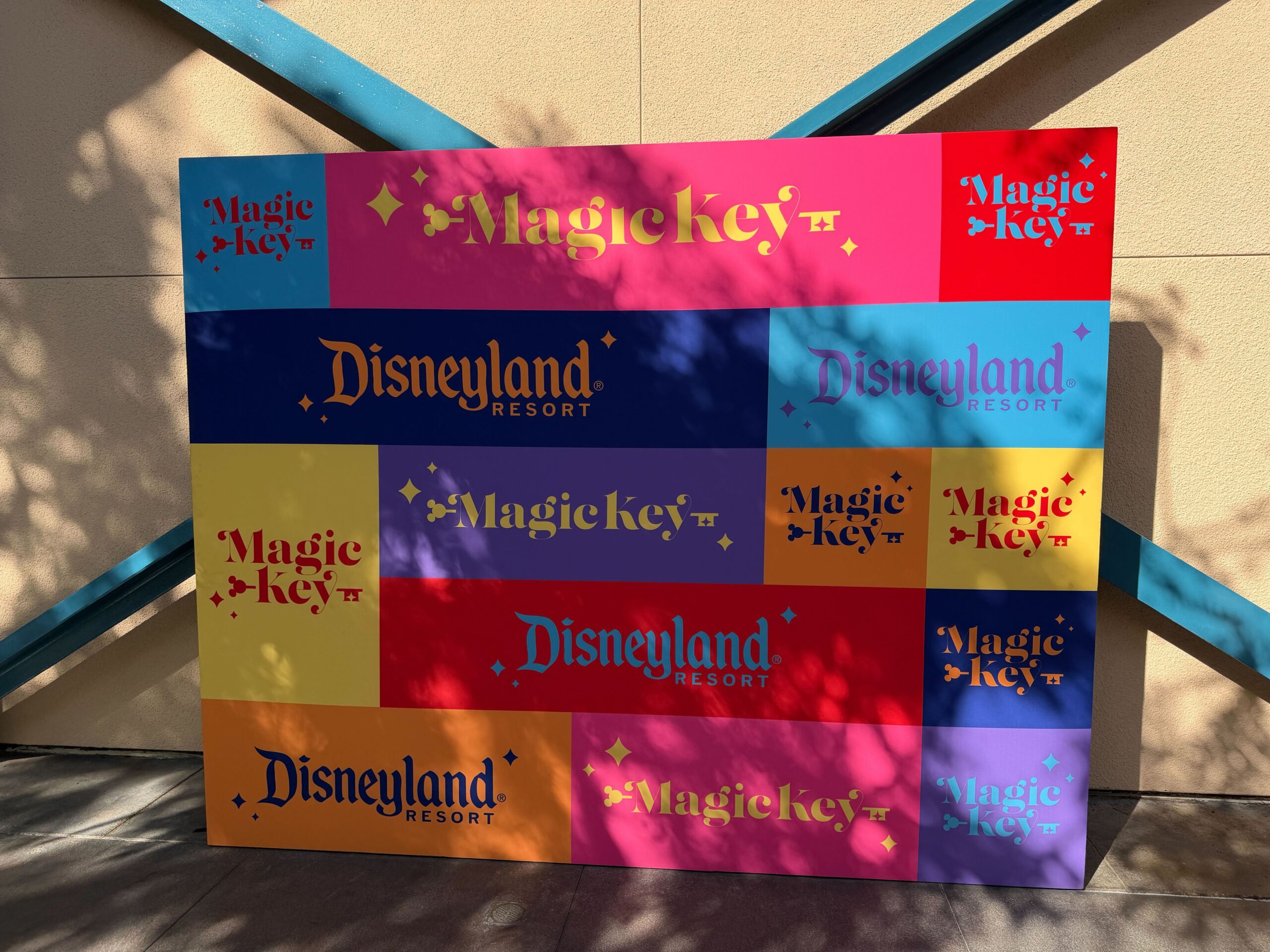 There are several photo ops for guests in the Hyperion Courtyard. The first photo op has colorful blocks printed with the Disneyland Resort and Magic Key logos.