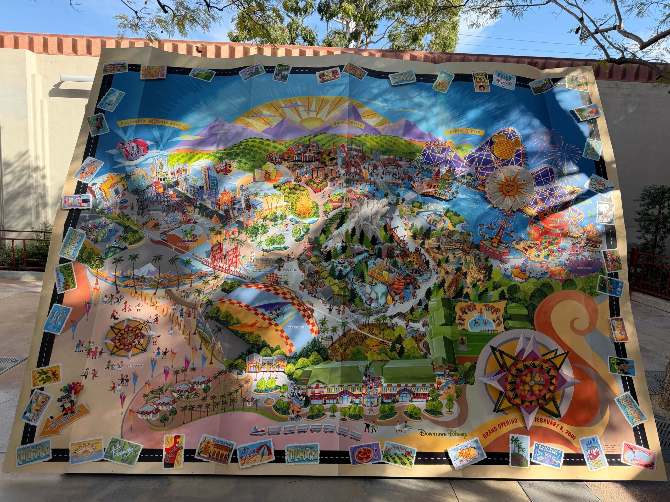 The second photo op is a large map of Disney California Adventure as it used to look when the park first opened. Notable differences include Paradise Pier instead of Pixar Pier and the omission of Cars Land and Avengers Campus. California-themed postcards form a border around the photo op.