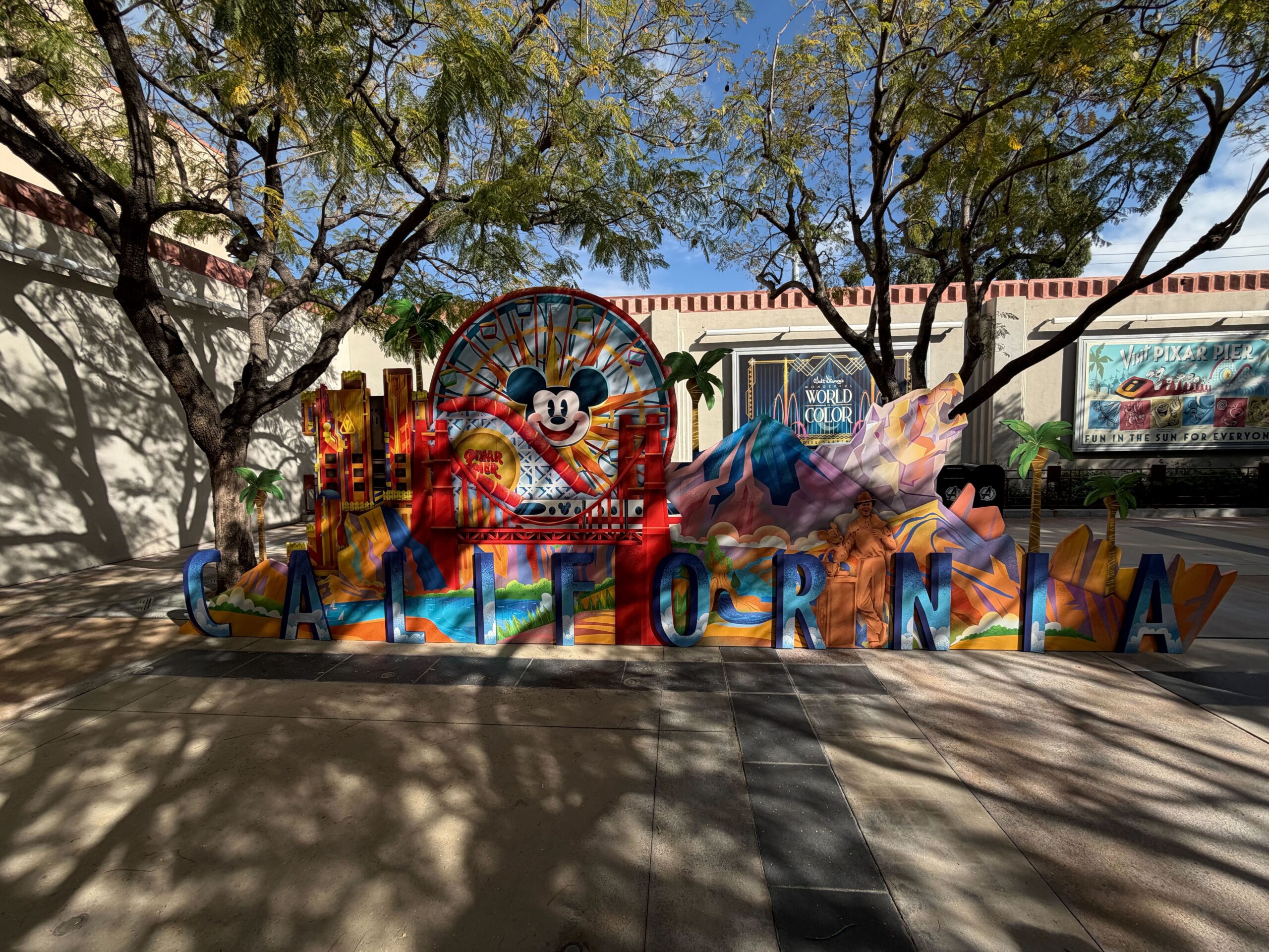 Another photo op features several iconic Disney California Adventure attractions among natural scenery, including Guardians of the Galaxy – Mission: BREAKOUT!, the Incredicoaster, Pixar Pal-A-Round, a monorail crossing the Golden Gate Bridge, Grizzly Peak, and the bronze Storytellers statue of Walt Disney and Mickey Mouse. “California” is depicted in cloud-filled letters along the bottom of the photo op.