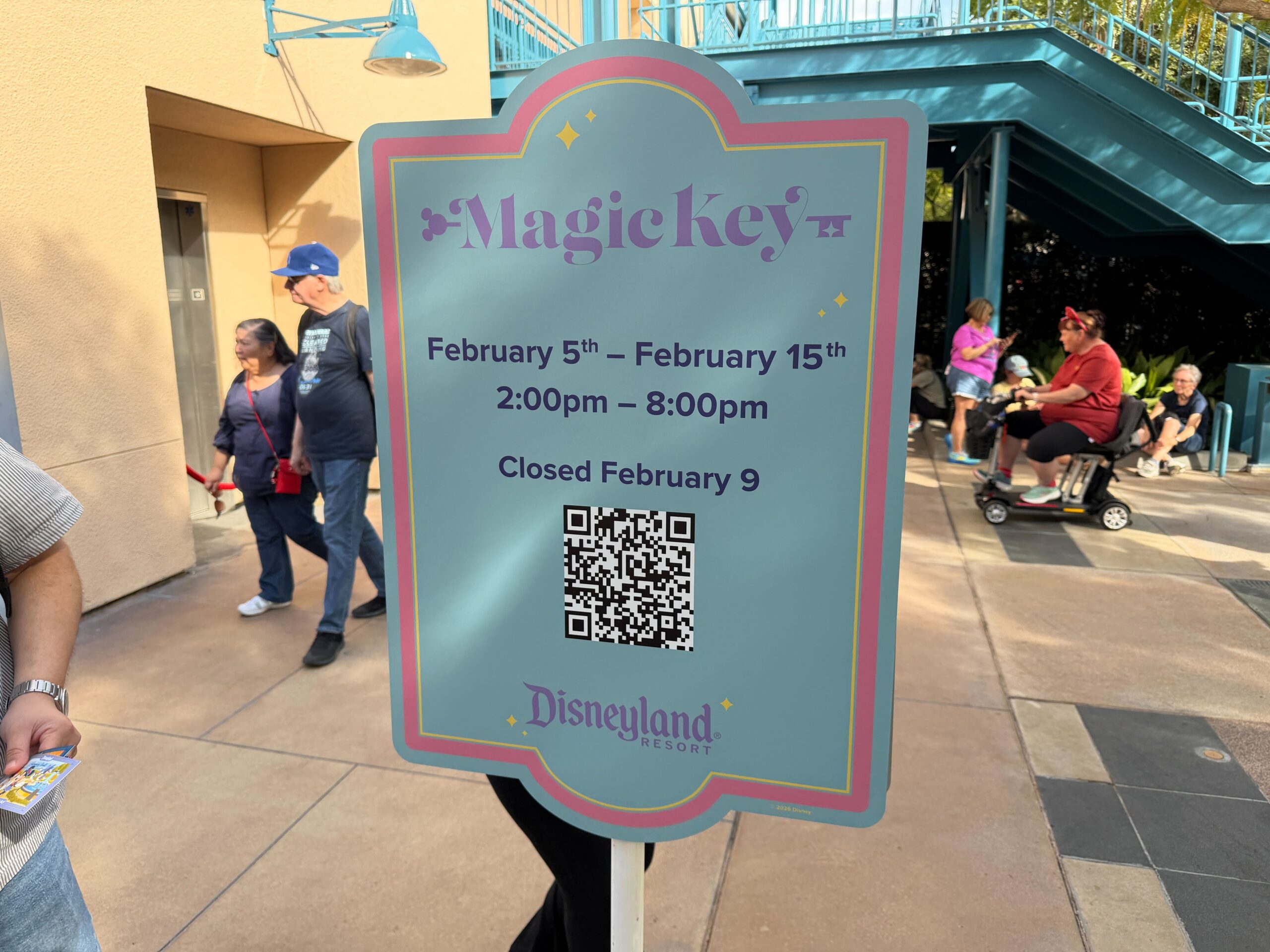 In the Hyperion Courtyard in Hollywood Land at Disney California Adventure, signs are posted informing guests about this exclusive event for Magic Key Holders. The event takes place from 2:00 PM – 8:00 p.m. on February 5 through February 15, 2026.