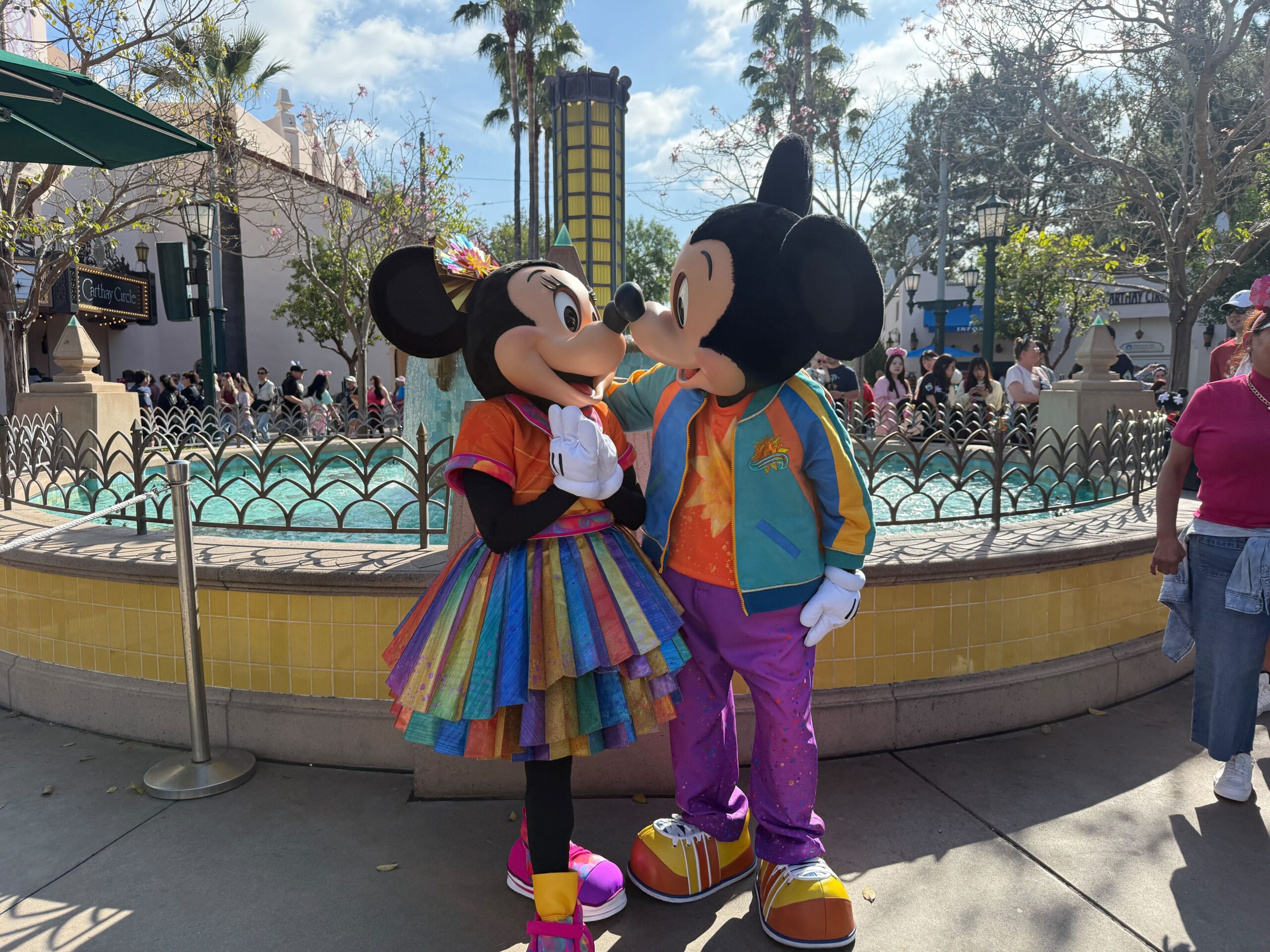 Mickey and Minnie have debuted new costumes for the 25th anniversary of Disney California Adventure. They feature coral, magenta, turquoise, yellow, and pink colors with coordinating sun motif orange shirts.