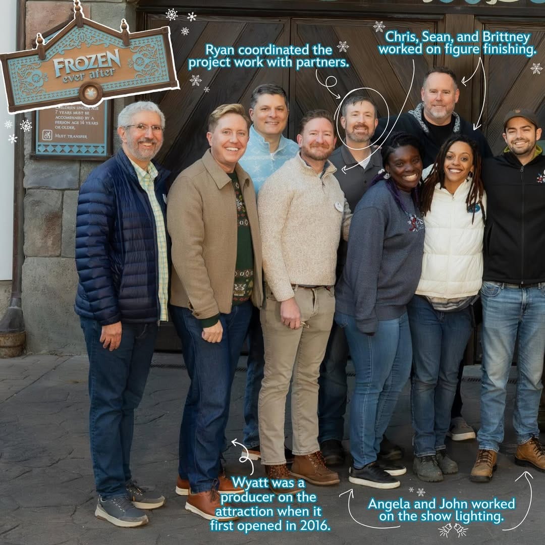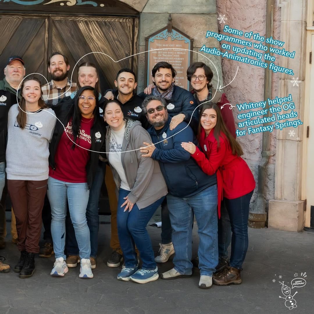 Working alongside the team was also Whitney, who helped engineer the articulated heads for Anna and Elsa’s Frozen Journey at Tokyo DisneySea’s Fantasy Springs. That attraction opened in June 2024. The other Imagineers who worked on updating the animatronics are also featured in the photo, but were not named.