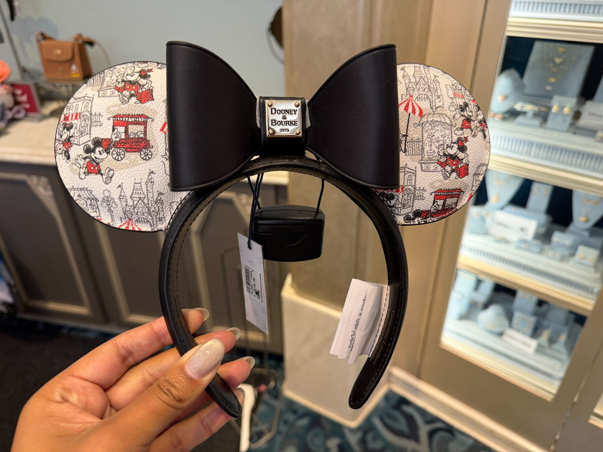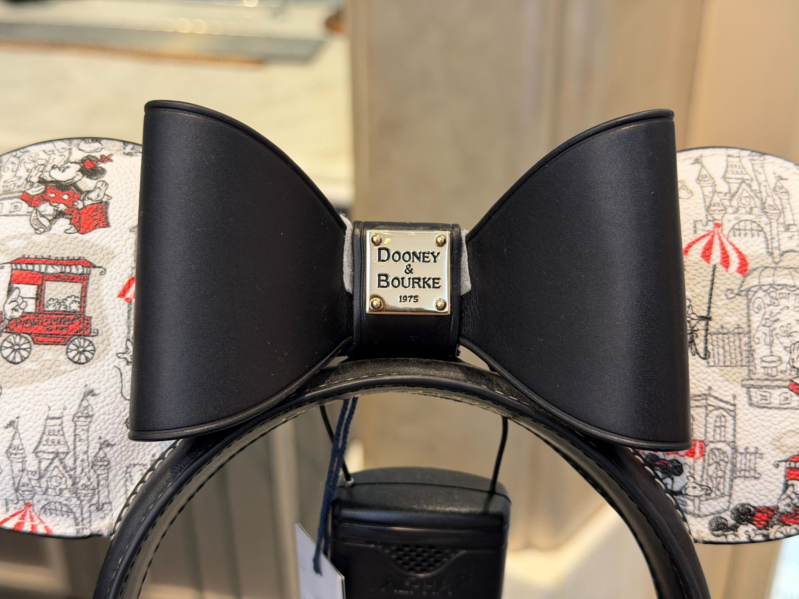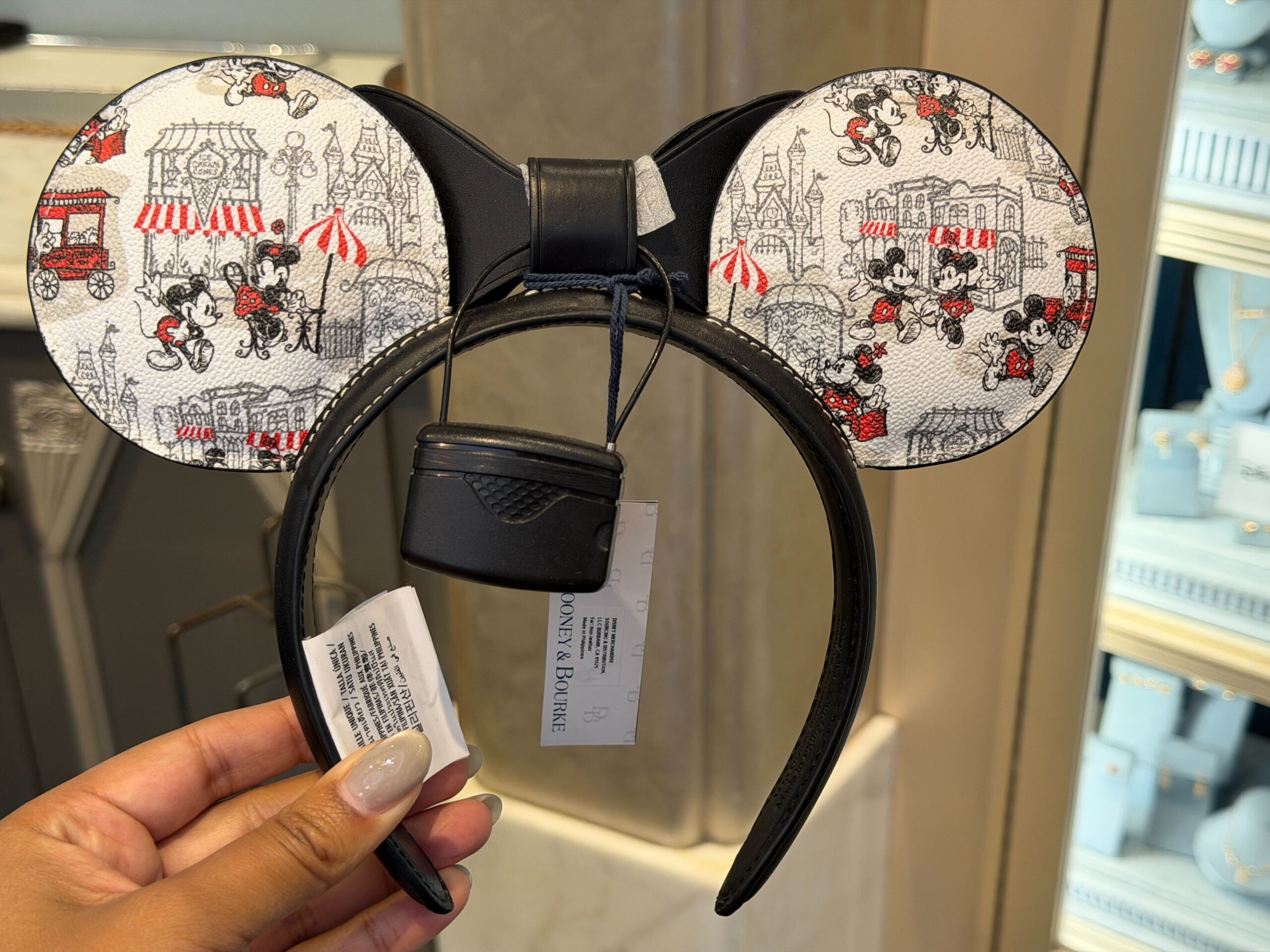 A new ear headband by Dooney & Bourke features Mickey and Minnie Mouse in a Main Street scene.