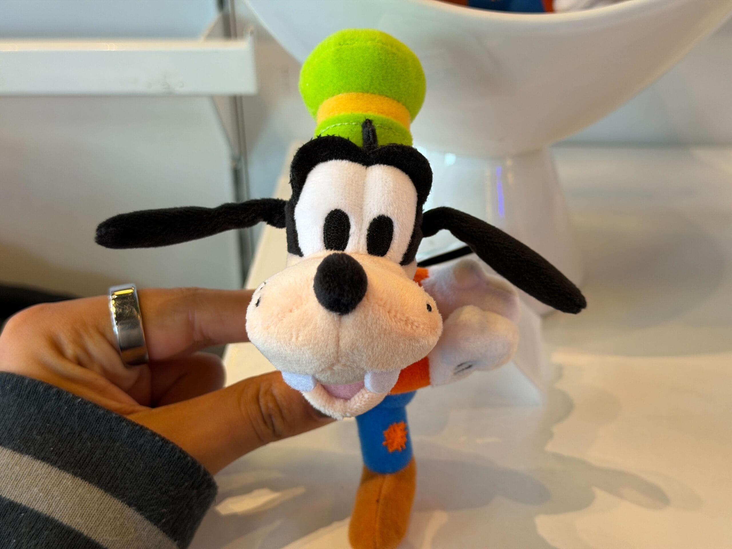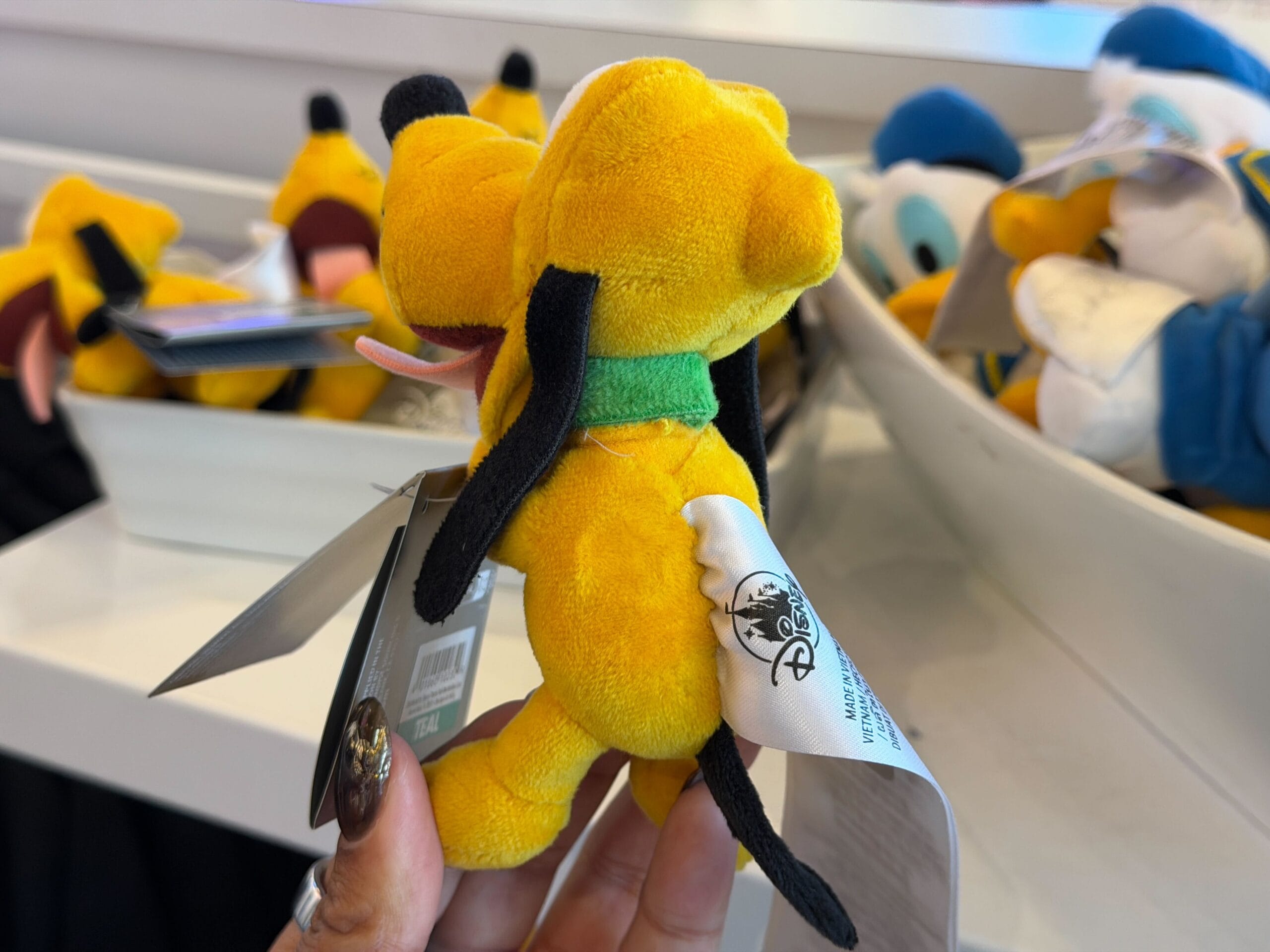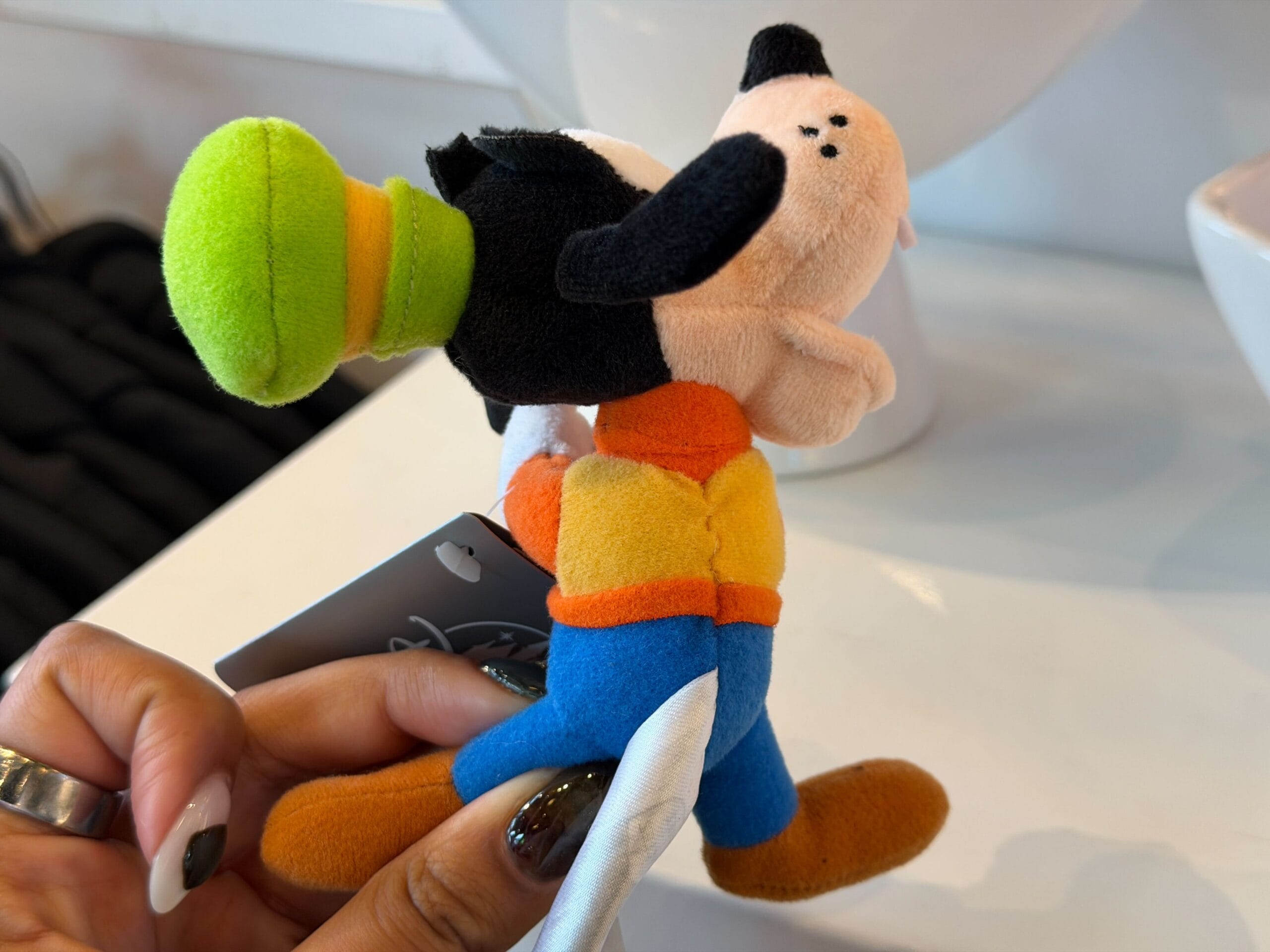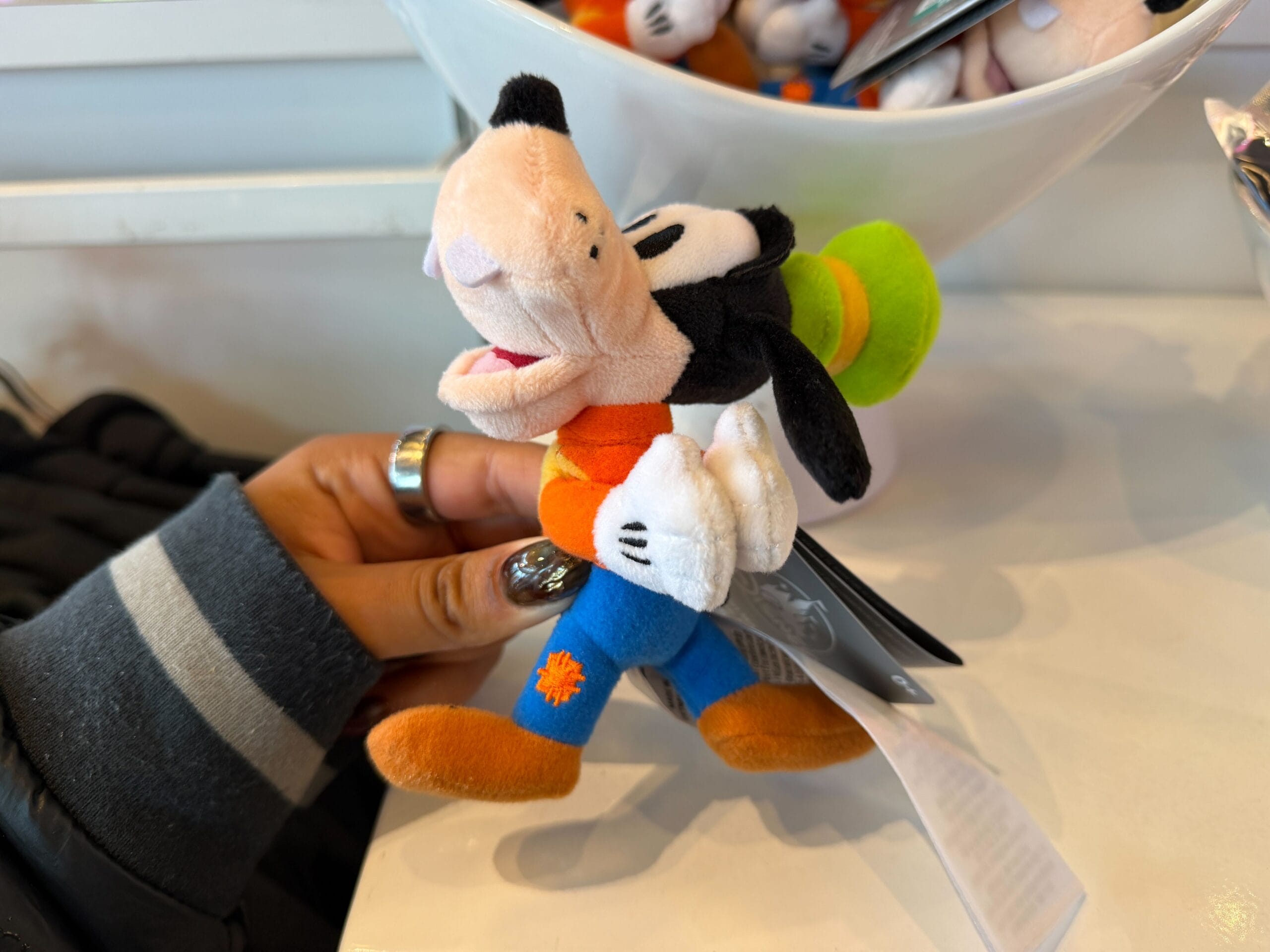 Each of these mini plush have magnets in their hands so they stick to each other. This makes it easy to hang them on a bag strap, lanyard, or other accessory. Goofy is wearing his green hat, blue pants, and yellow vest.