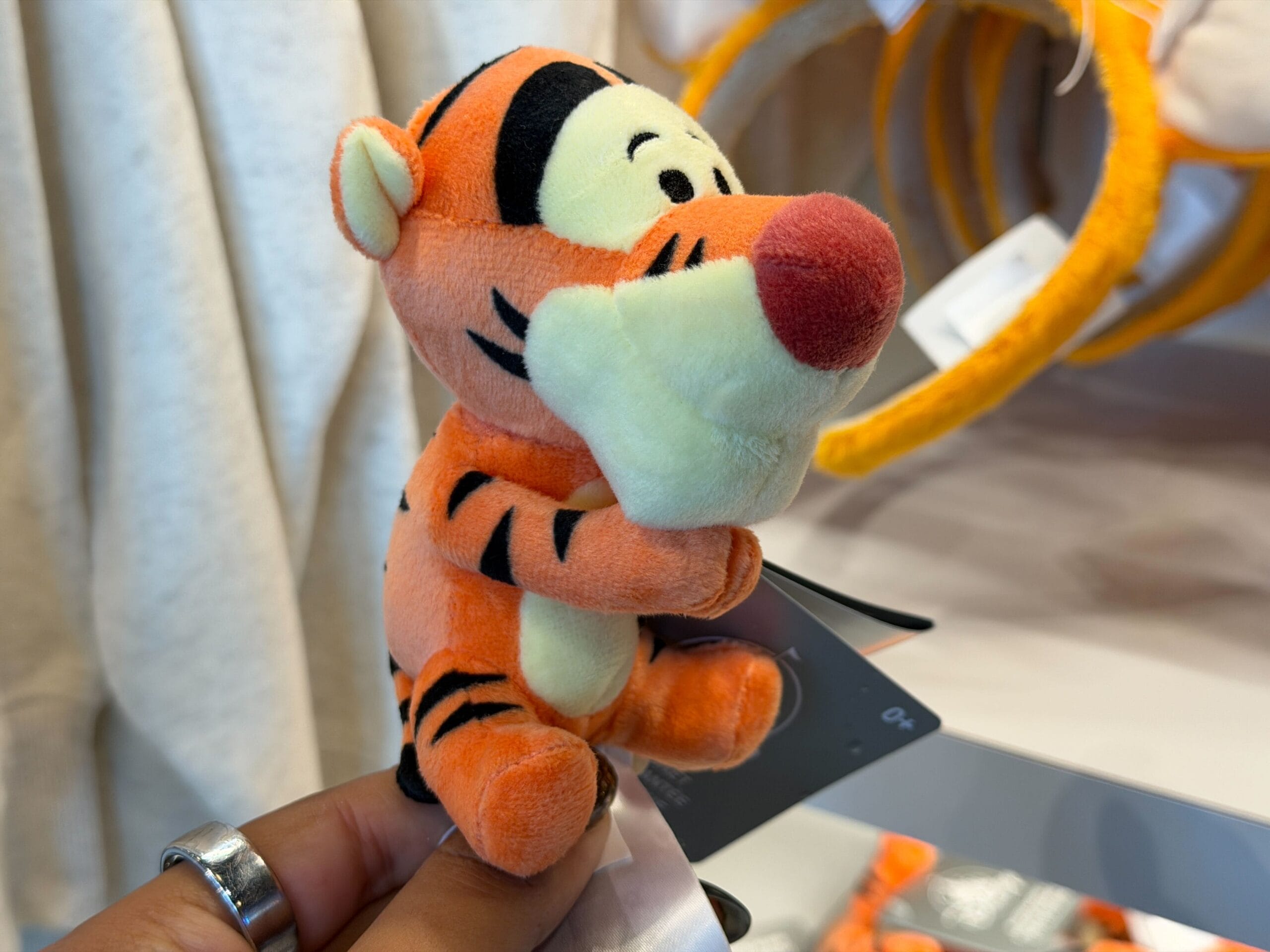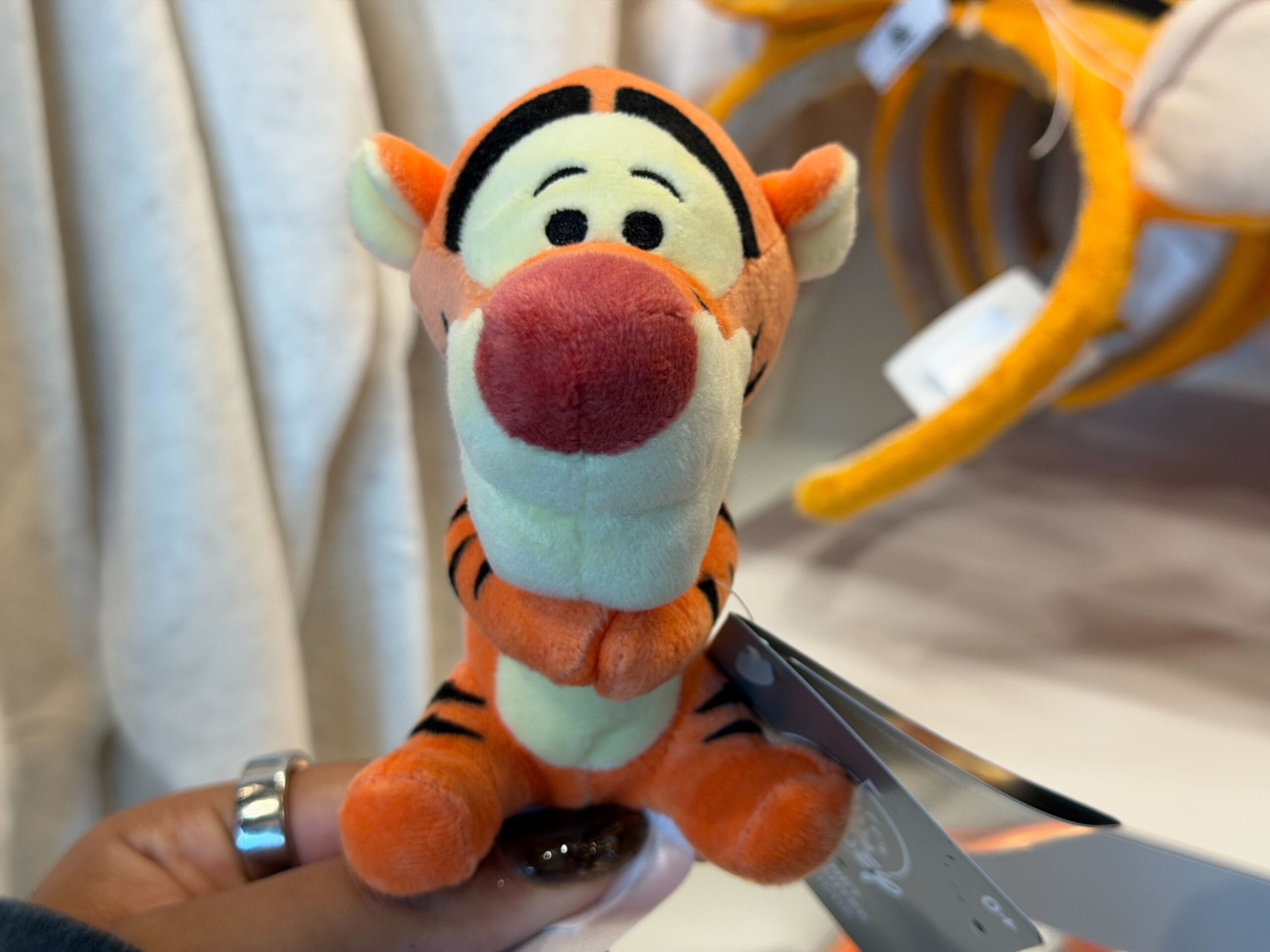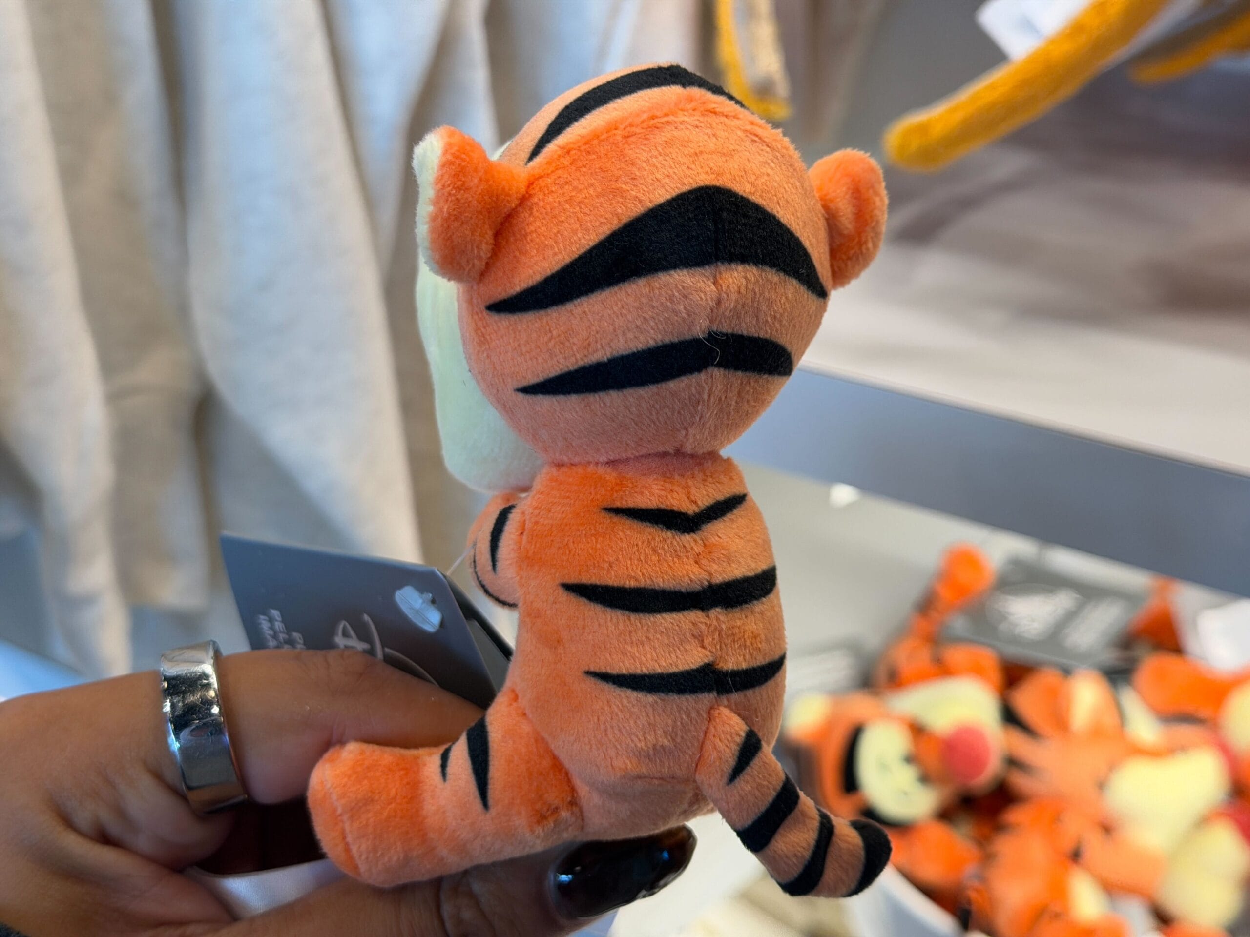 Tigger has soft orange fur with black stripes and embroidered facial features.
