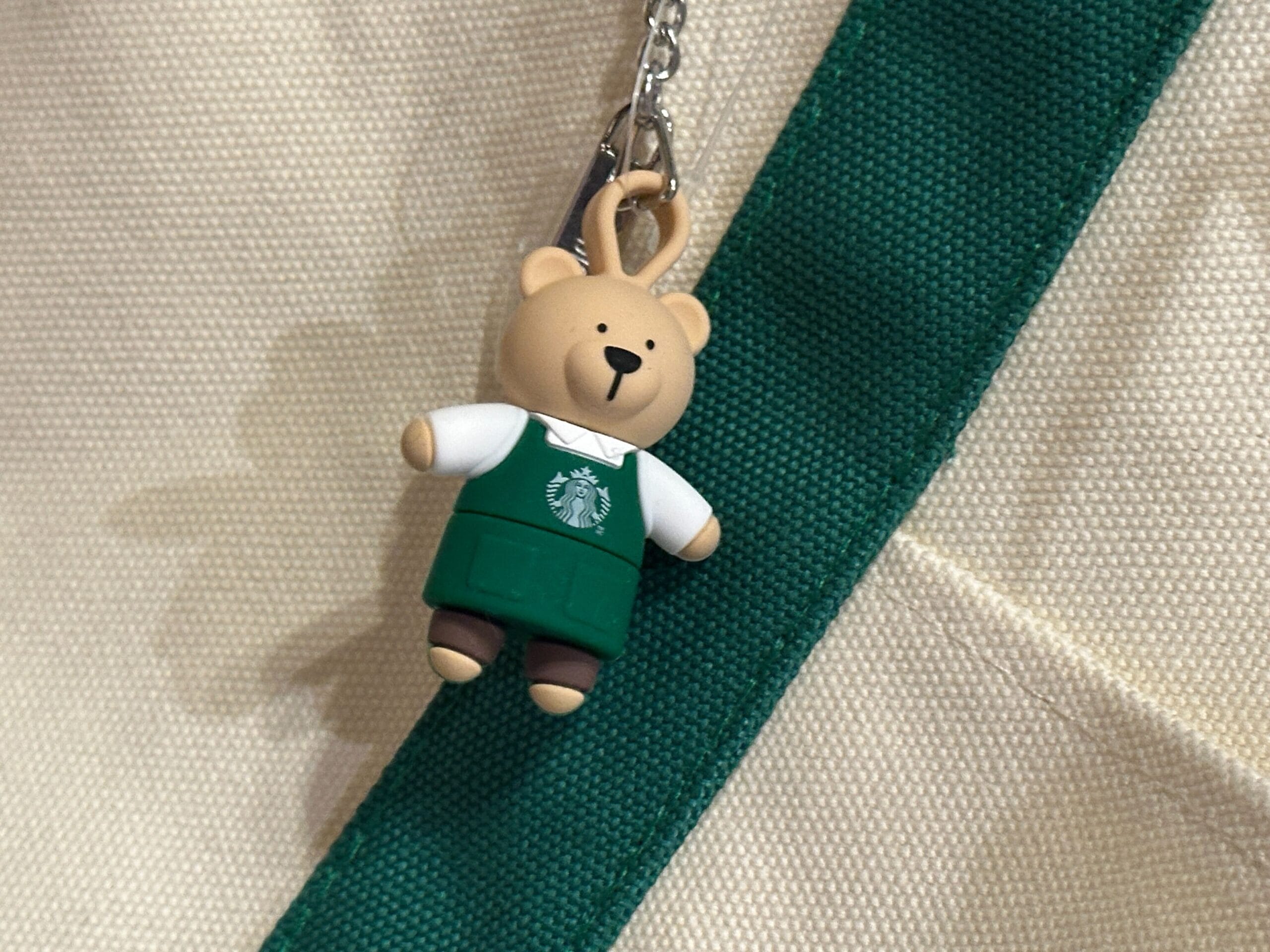 The tote has a little fabric loop on the outside with a bearista star topper keychain attached to it. This bearista is tan and wearing a green Starbucks apron and a white shirt.