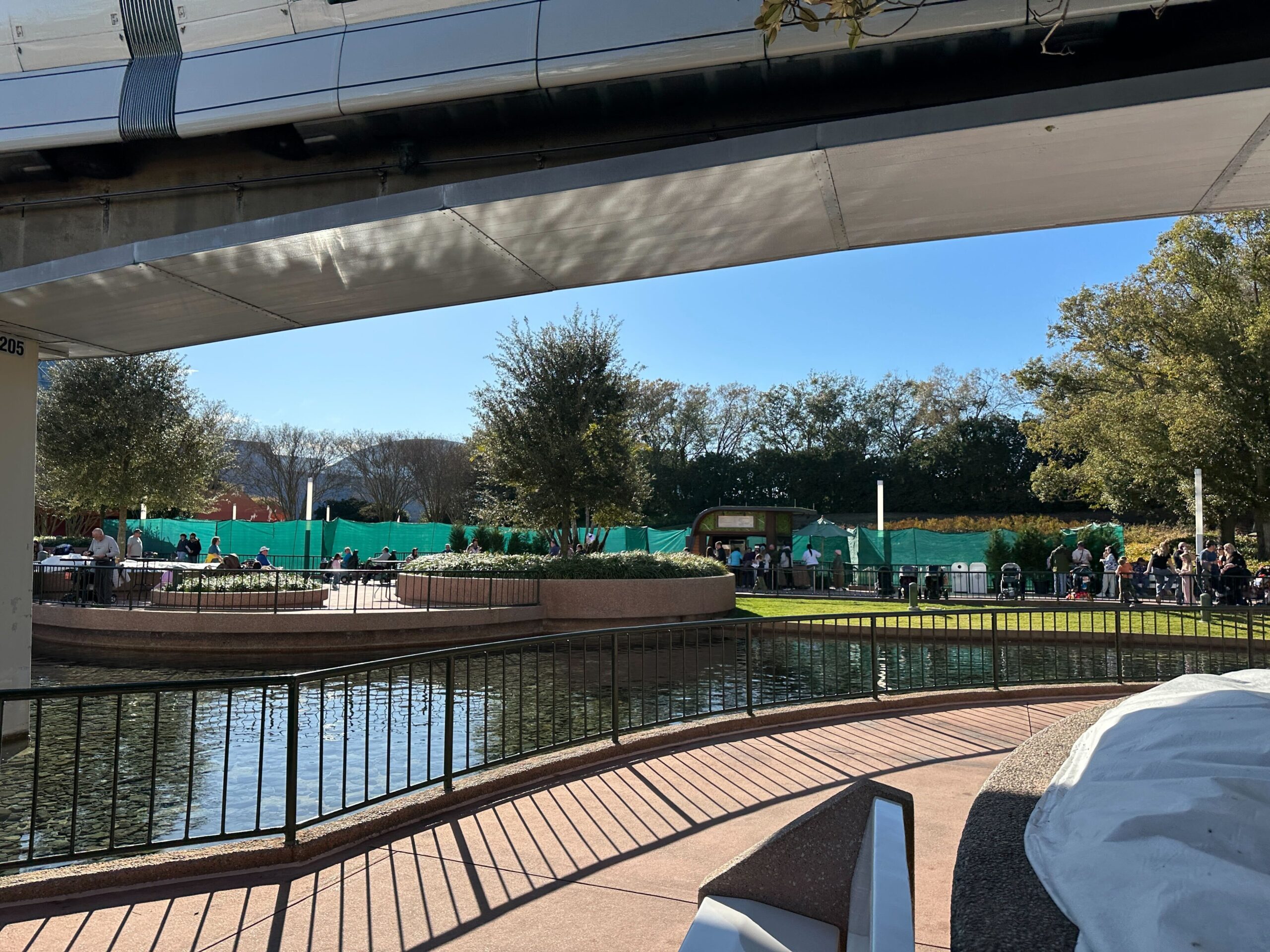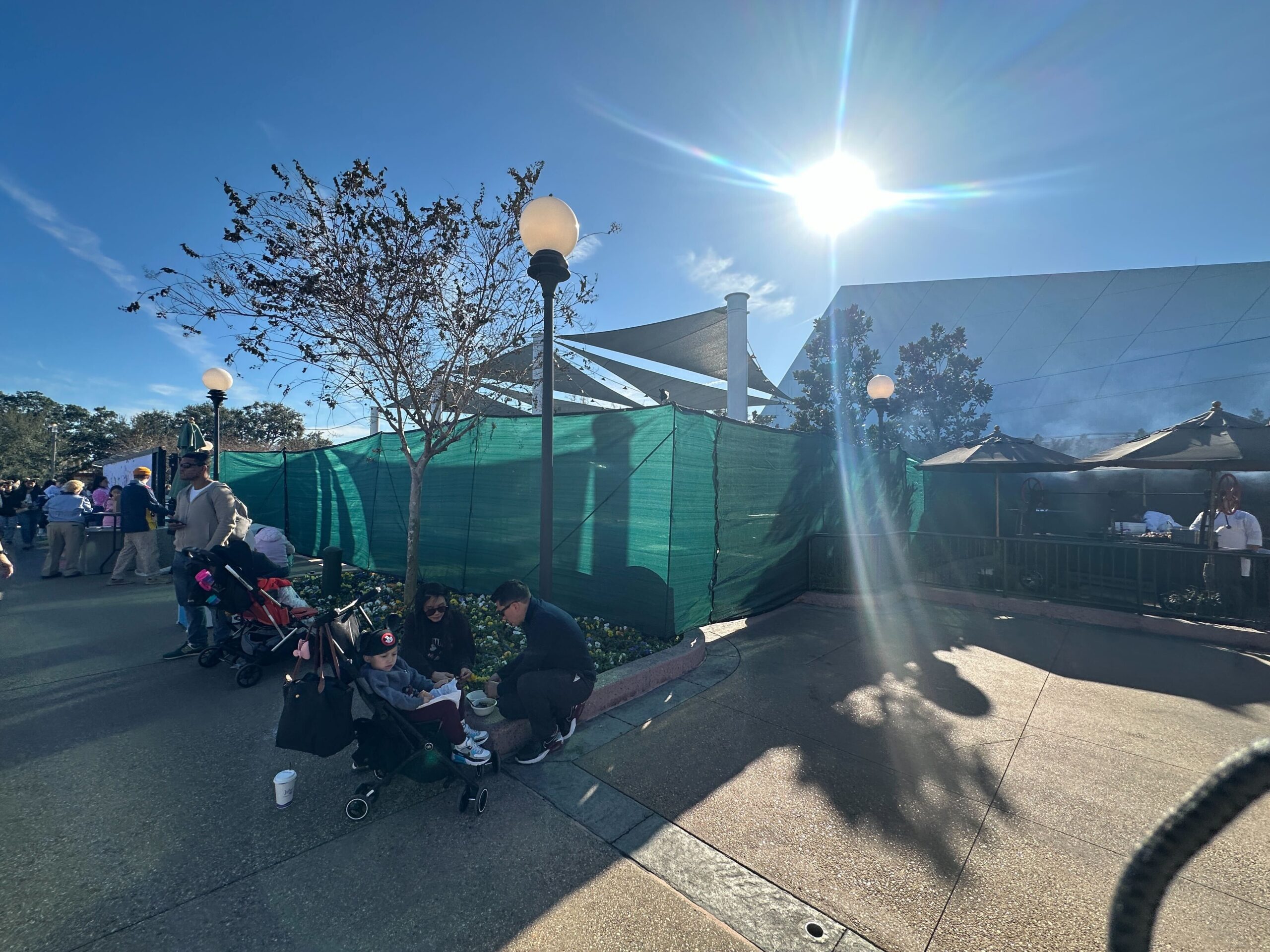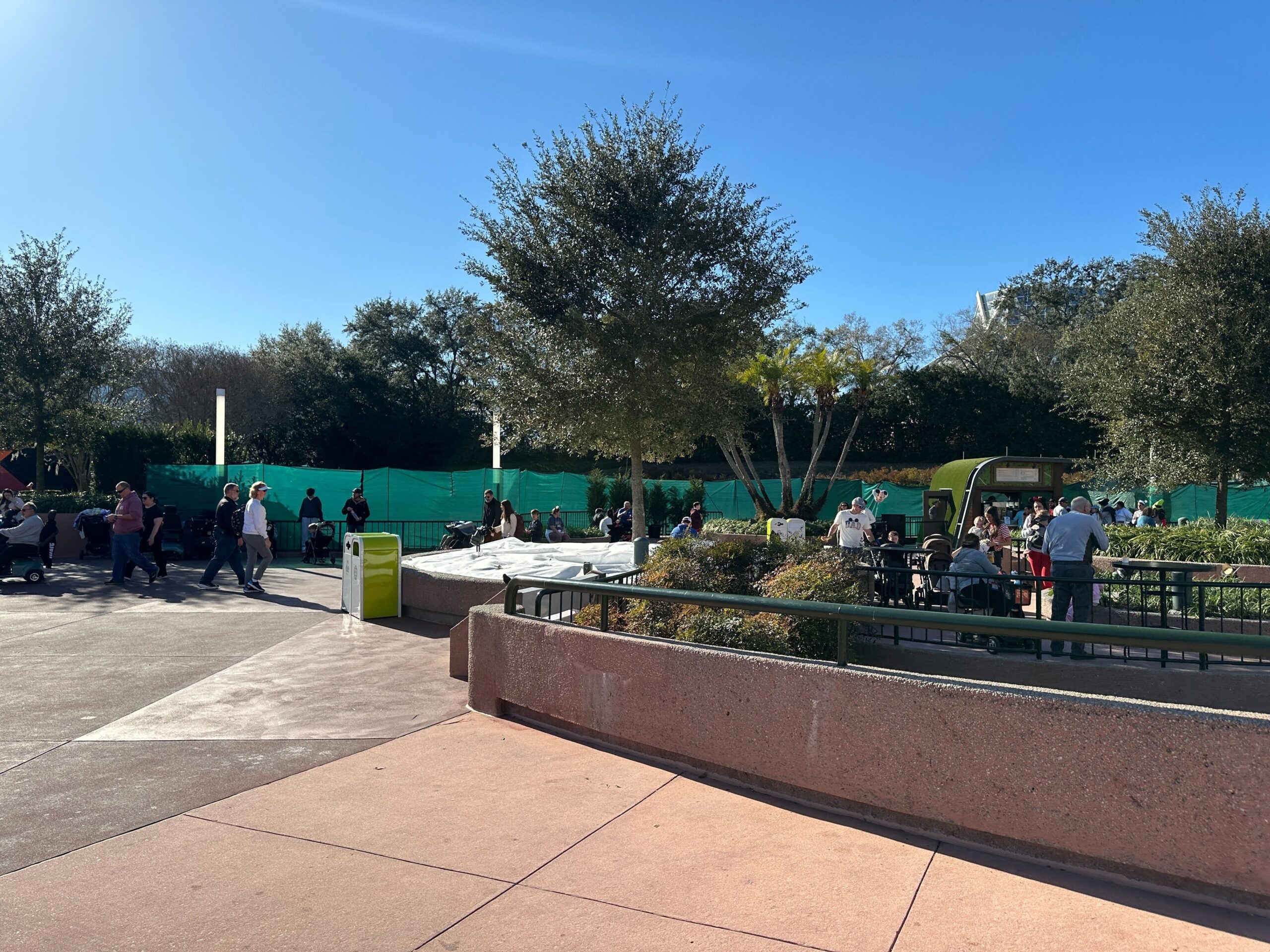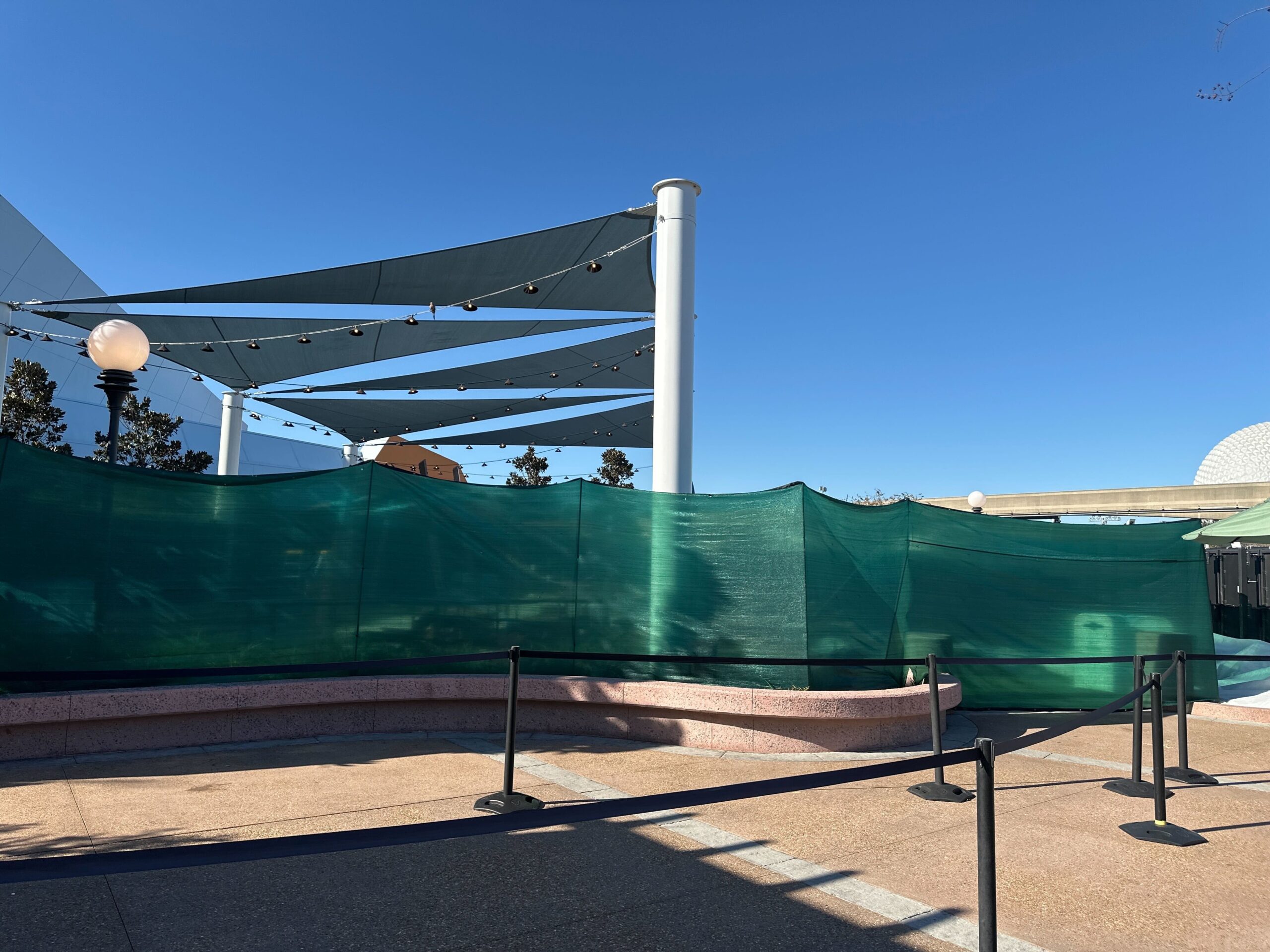 During a recent visit to EPCOT, we noticed green scrim walls have been installed to surround the playground area near the Imagination Pavilion. Awnings with string lights are visible above the scrim walls.