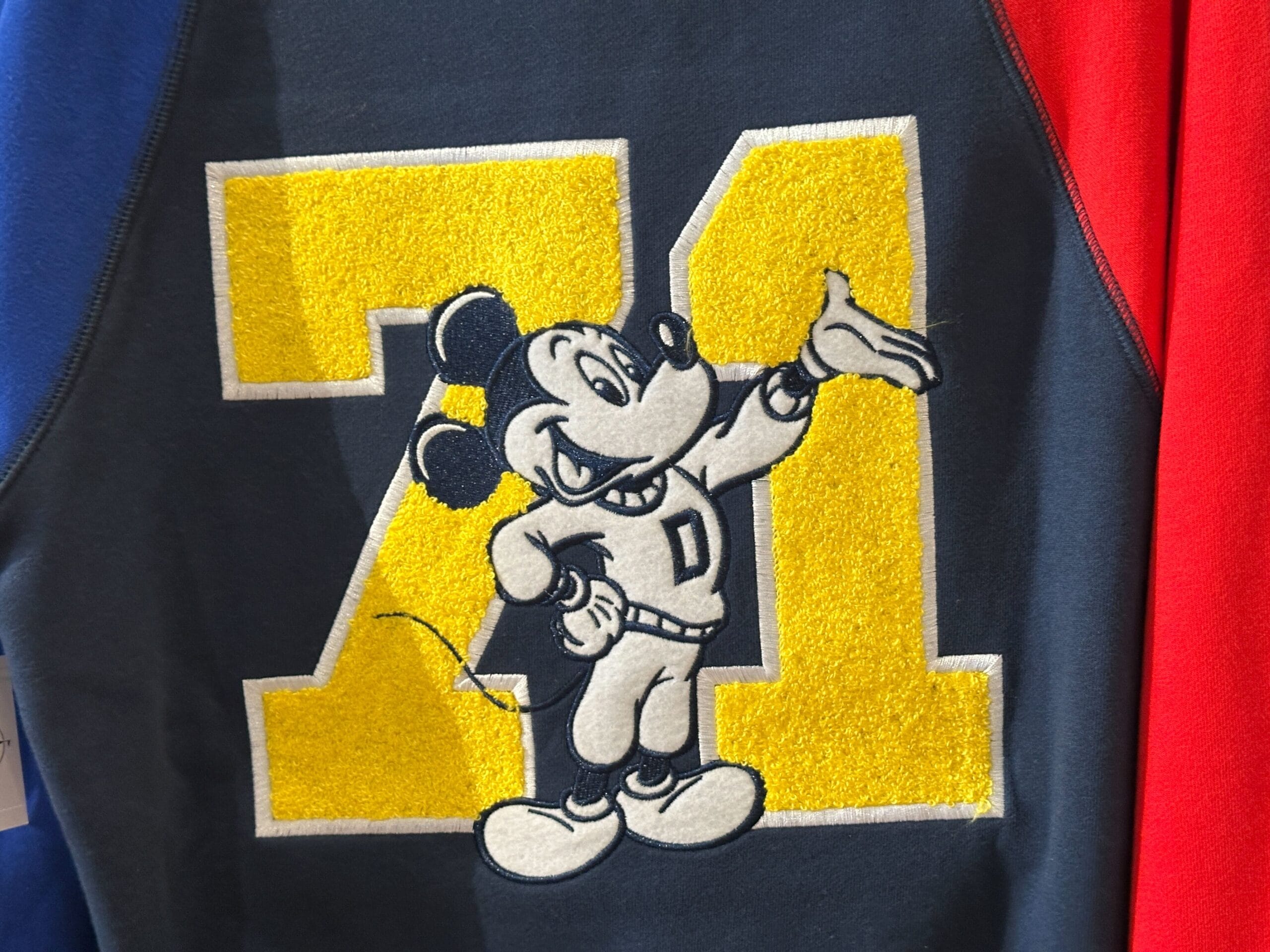 On the back is a large yellow chenille “71.” Mickey is in black and white in front of the number, wearing his same “D” sweater.