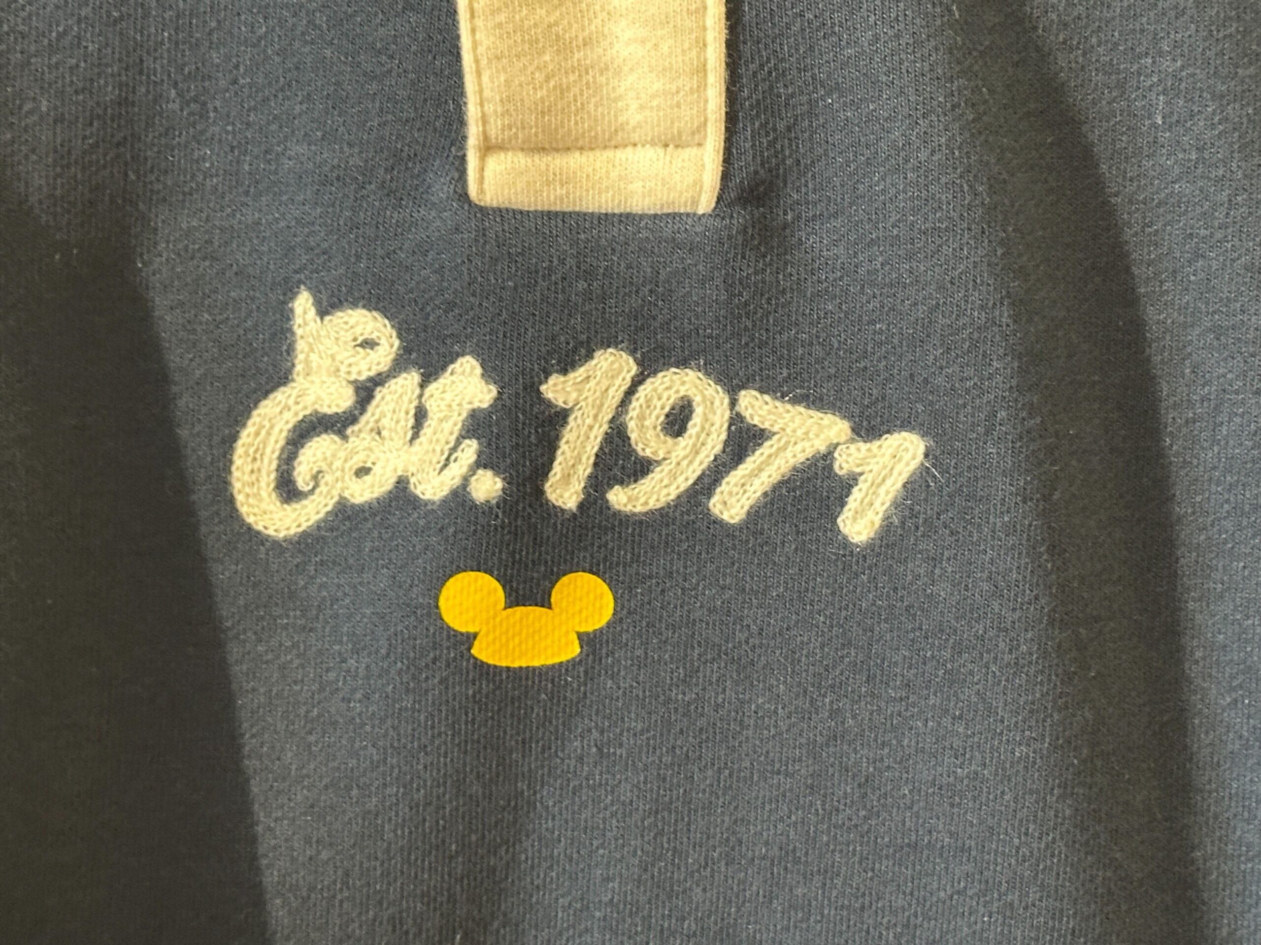 “Est. 1971” is embroidered in white on the chest with a yellow Mickey hat. A “Walt Disney World” tag is on the pocket.