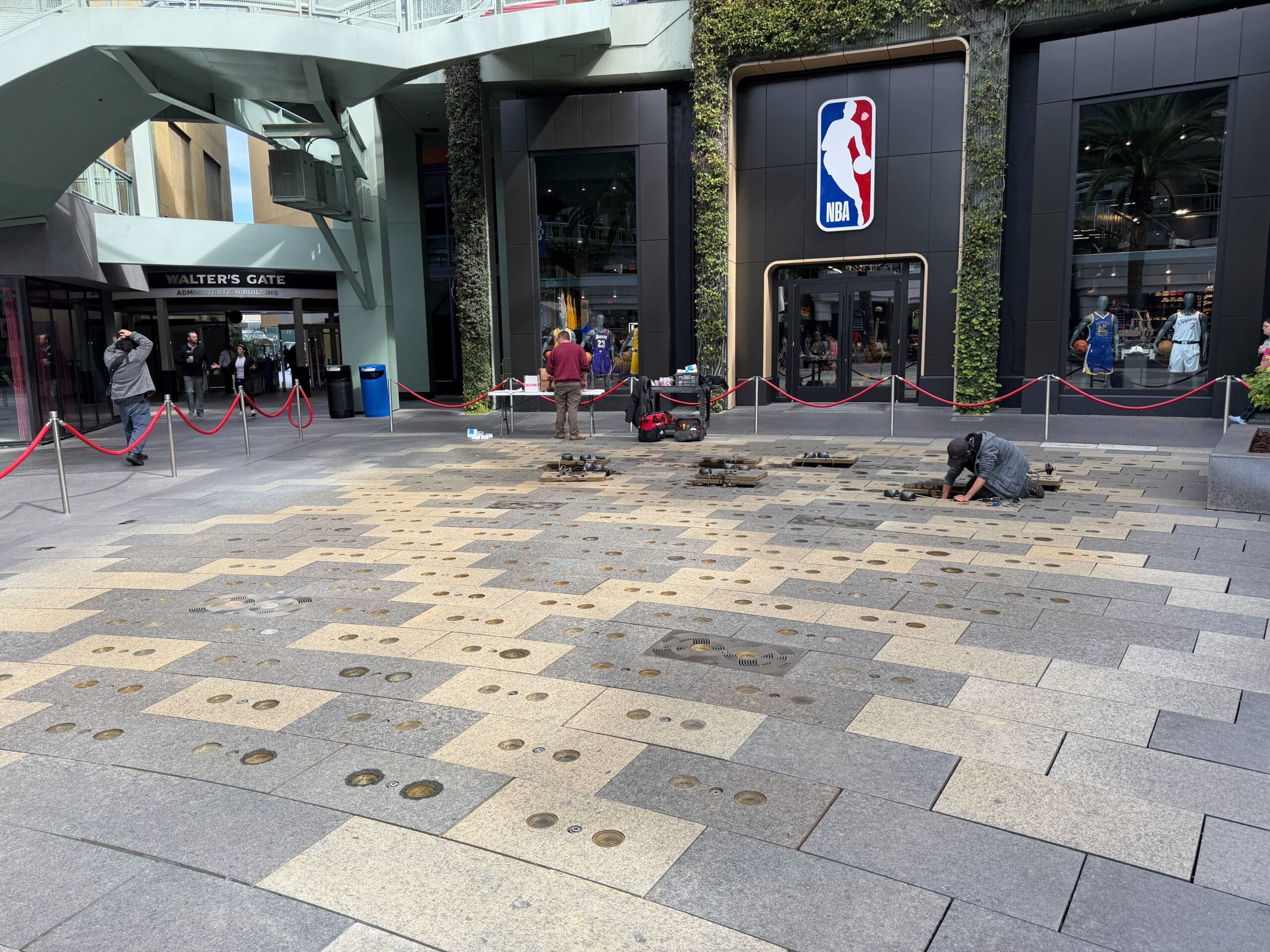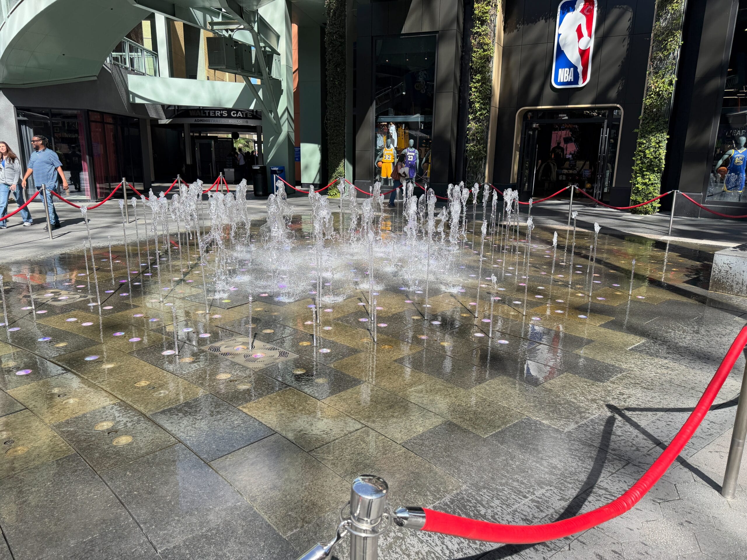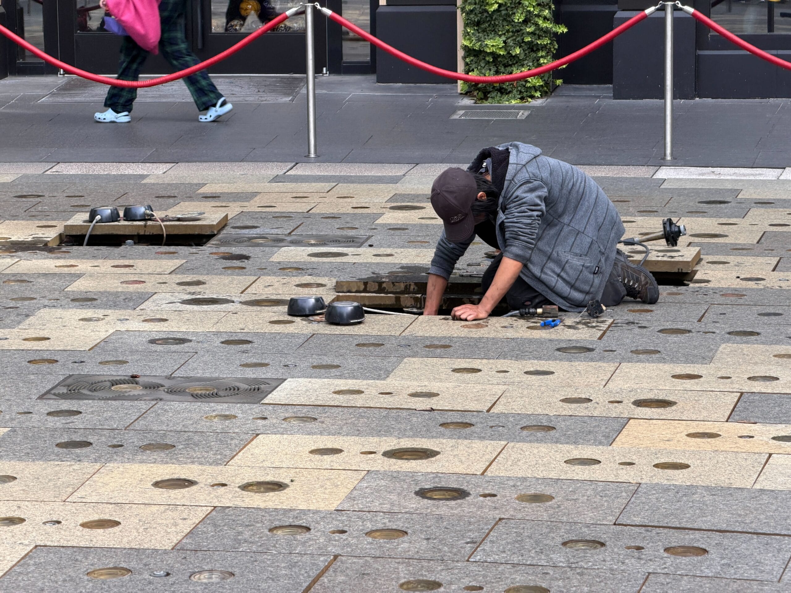 In the early morning, a crew member was working on the splash pad, which was blocked off by red ropes. Multiple fountain blocks had been removed.