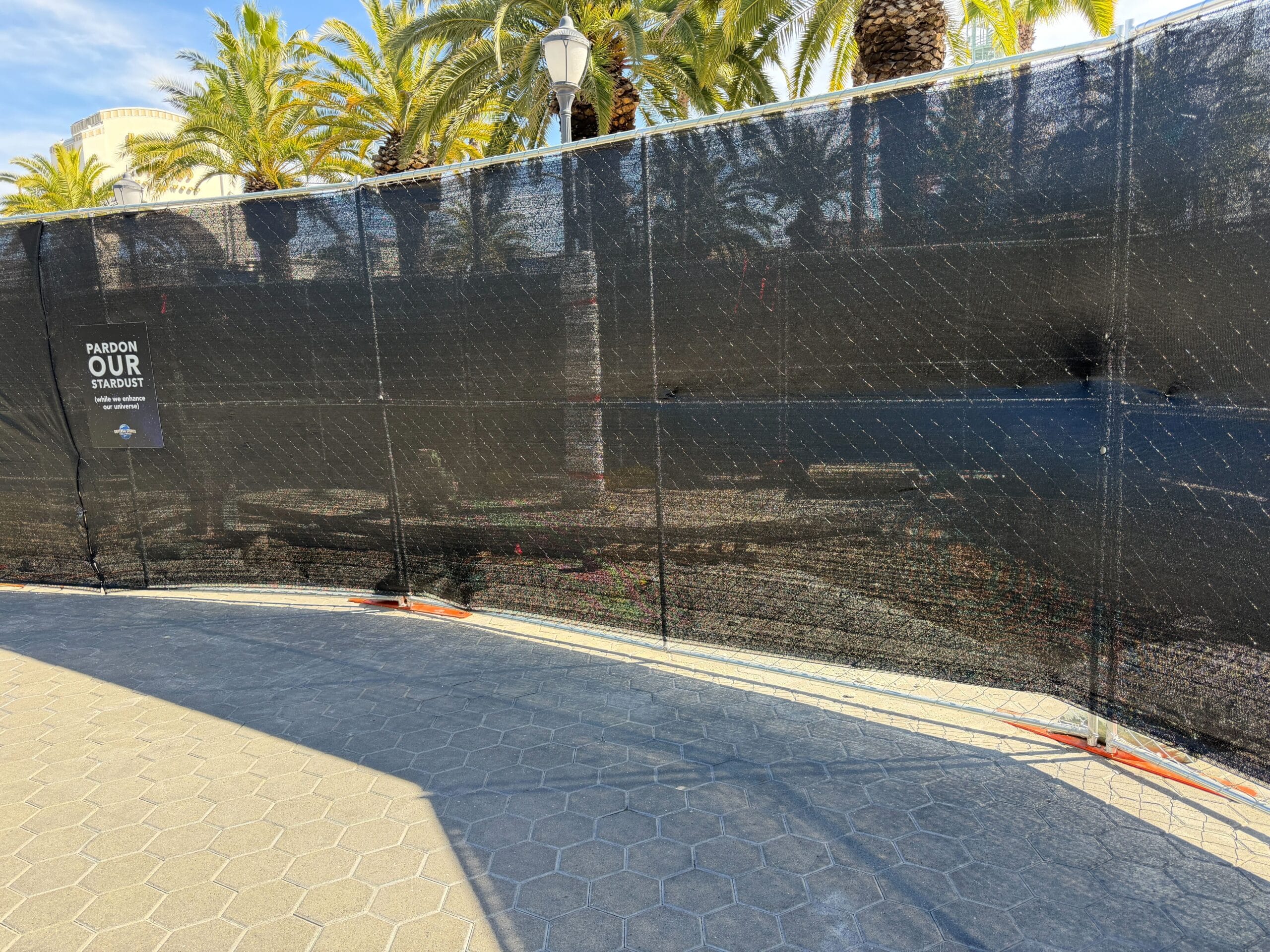 Near the security entrance, fencing surrounded a long stretch of sidewalk for an apparent refurbishment. Black scrim was covering the fencing, but we could see through in some areas.