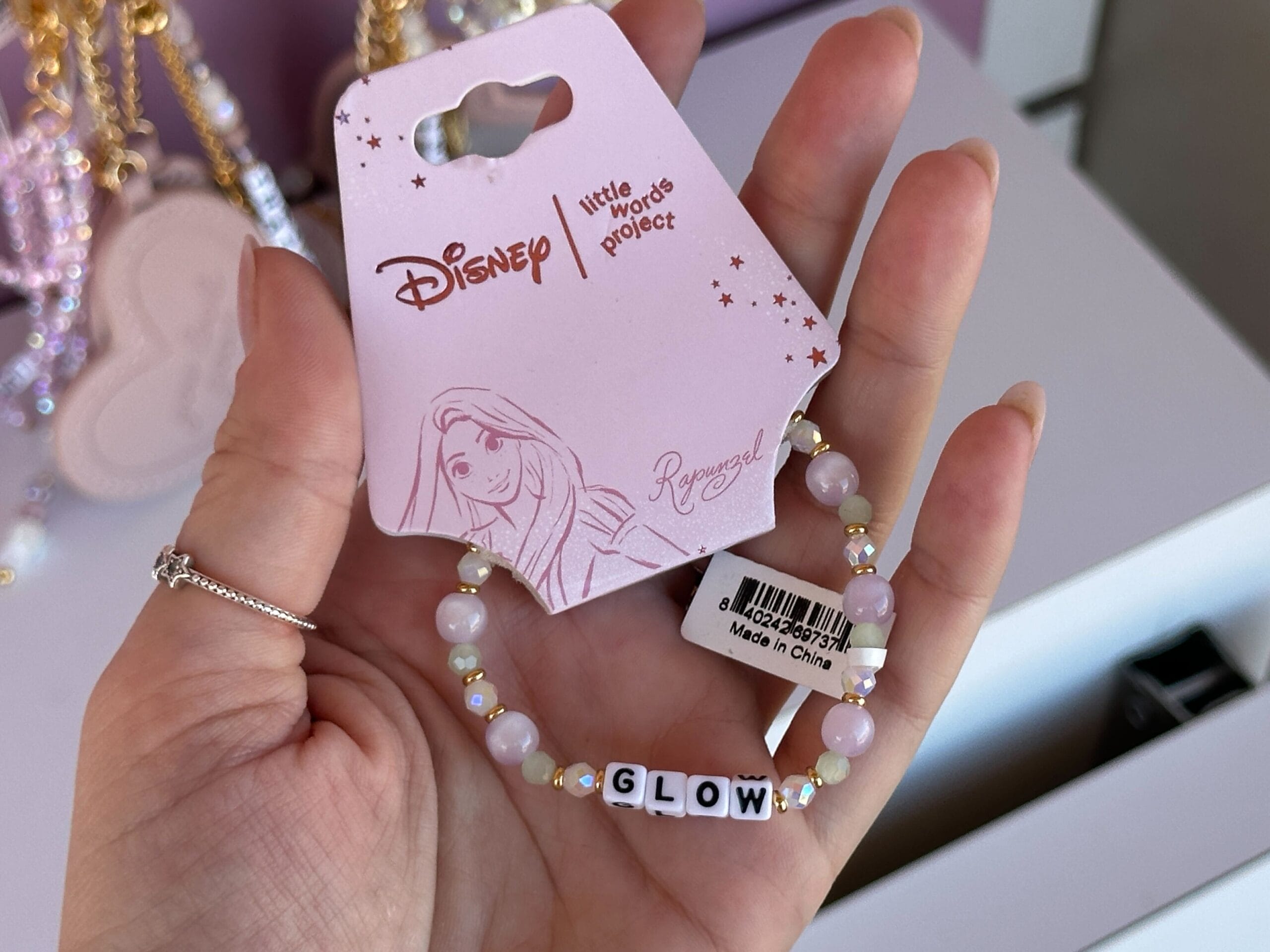 This bracelet is themed after Rapunzel, or more specifically, her magical, glowing hair. The letter beads in the center spell “Glow.” Beads around it are iridescent or in shades of mint and lavender.