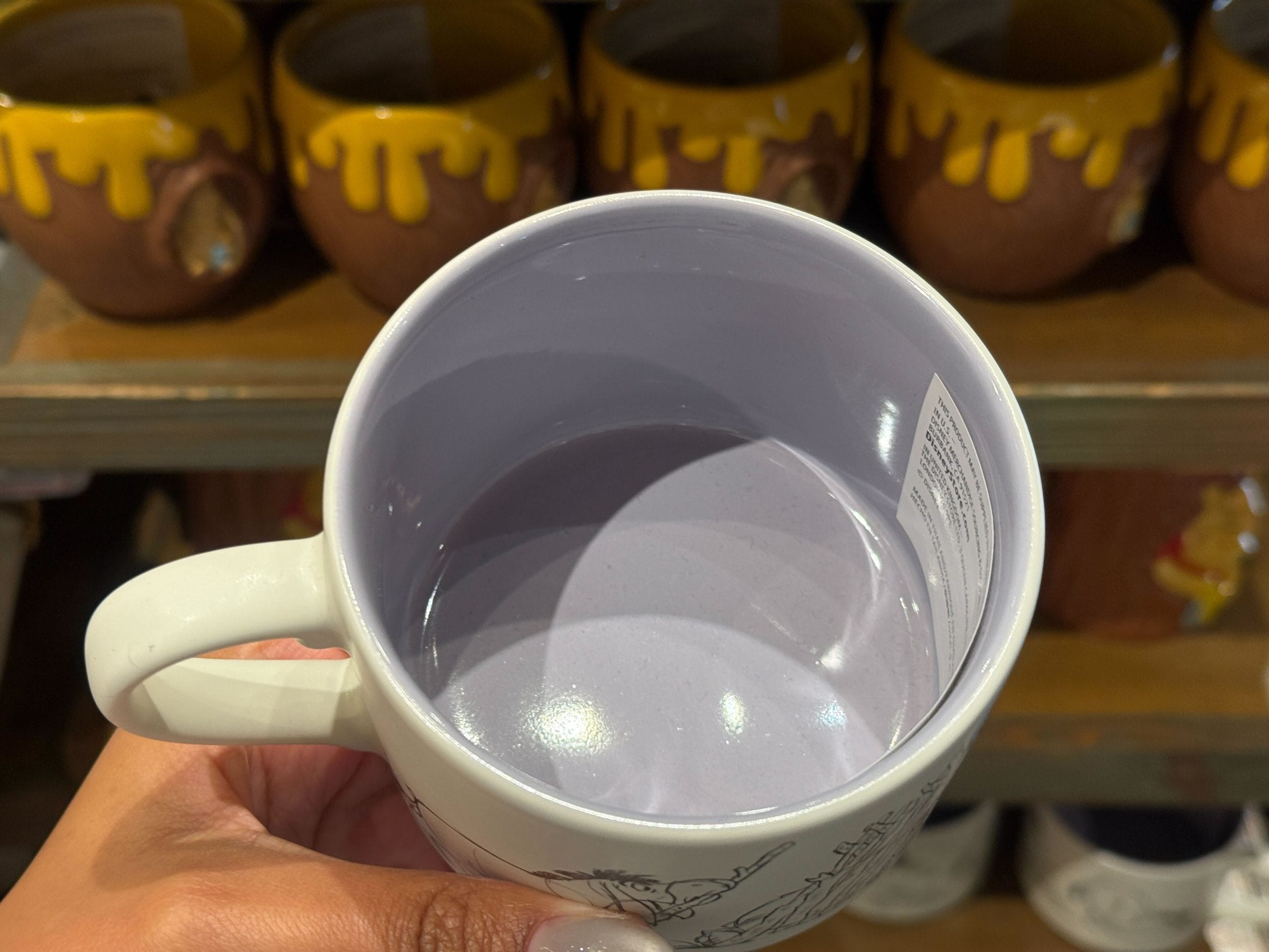 The Eeyore mug features him putting together his stick home, which then collapses around him. The interior is lavender.