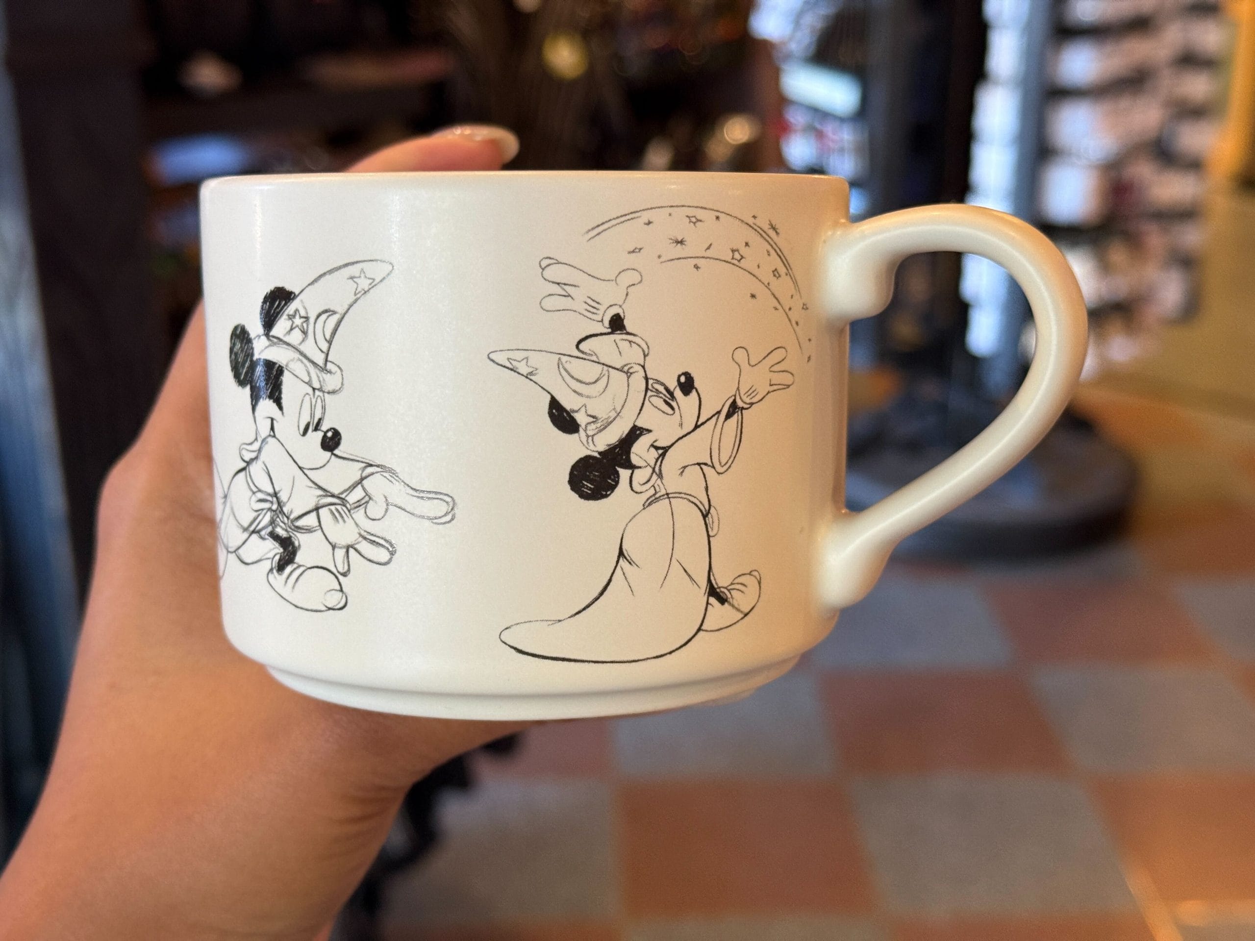 The mugs are matte white with a series of sketches of the featured character (Sorcerer Mickey and Eeyore) going through a scene. We found them in Disneyland Park.