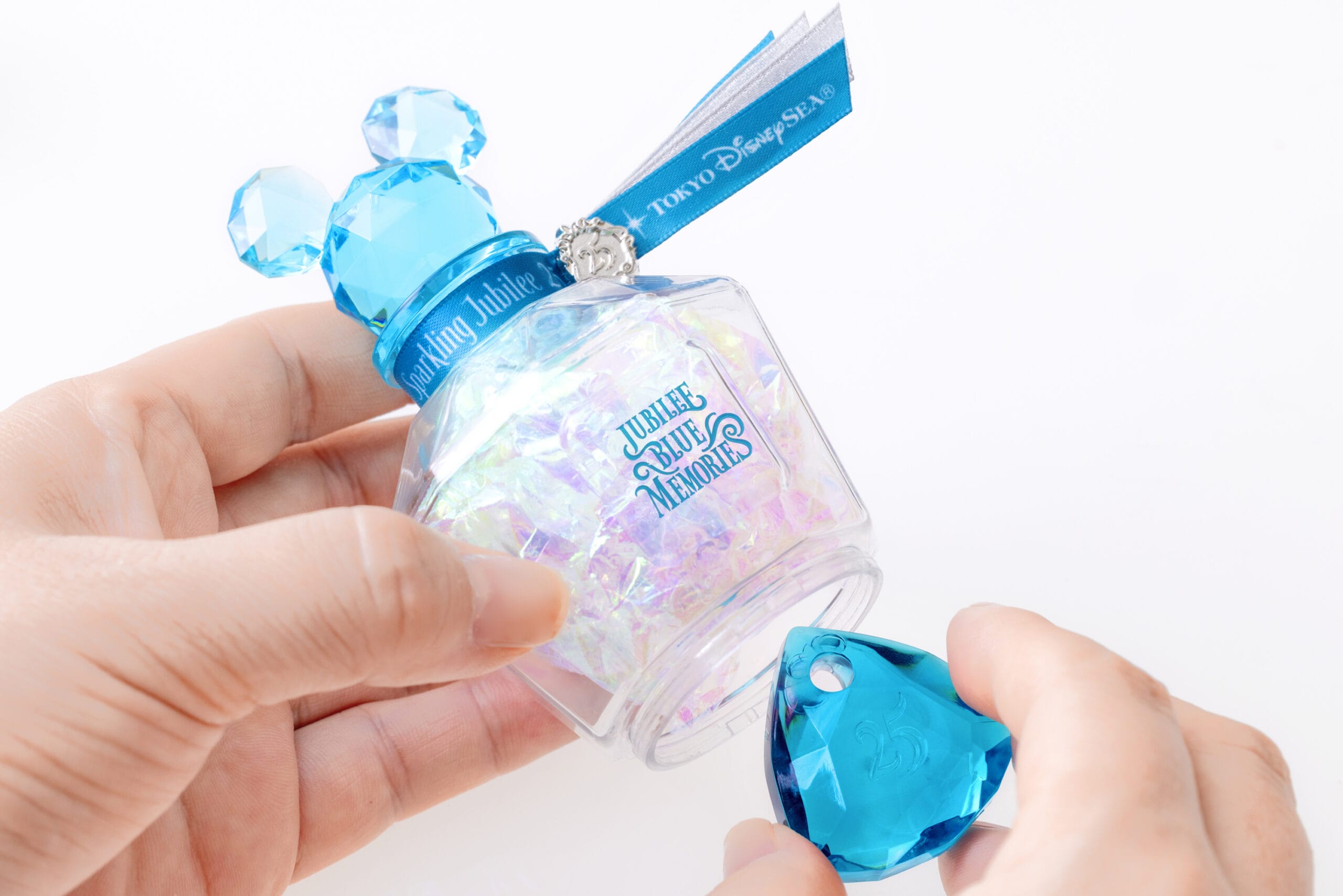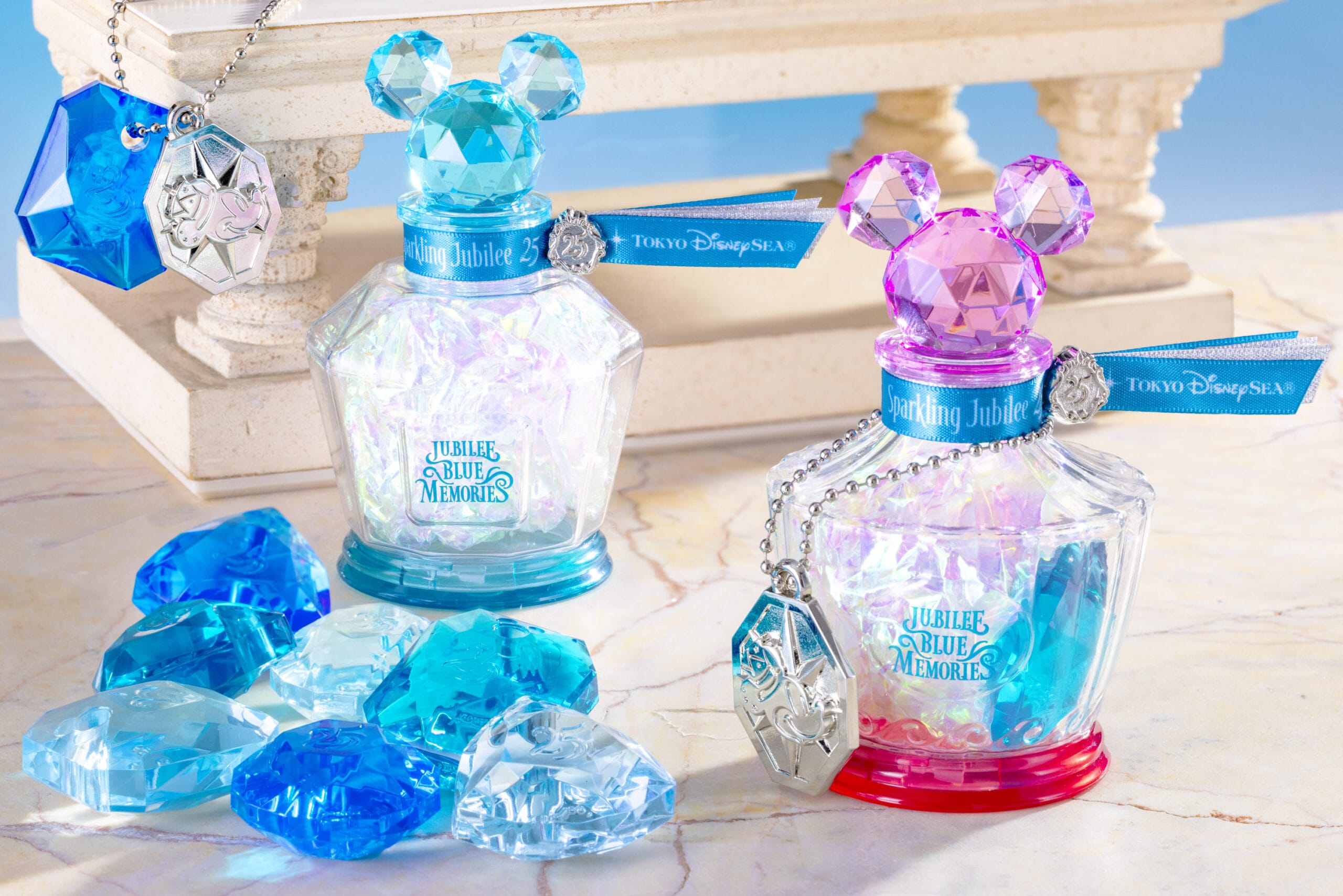 There will be two bottle options. Both have a clear center, a Mickey-shaped gemstone cap, and a Tokyo DisneySea 25th Sparkling Jubilee ribbon secured with a silver “25” medallion. One bottle has a blue base and blue Mickey cap, while the other has a red base and pink Mickey cap.