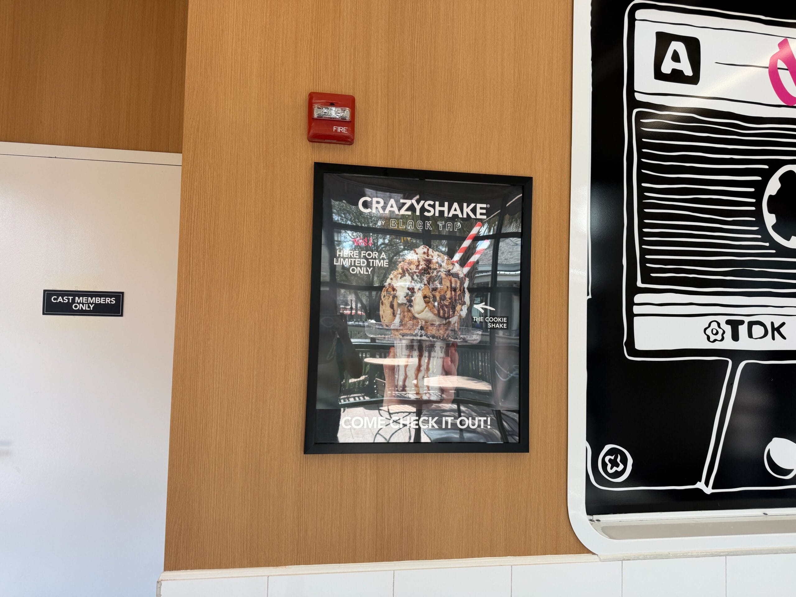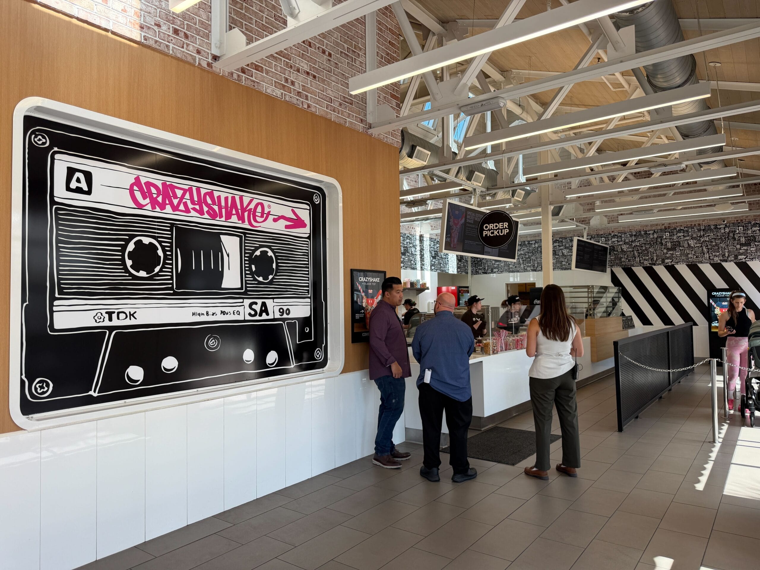 The window that previously looked into the Sprinkles kitchen has been covered by a cassette tape decal featuring the CrazyShake logo in pink.
