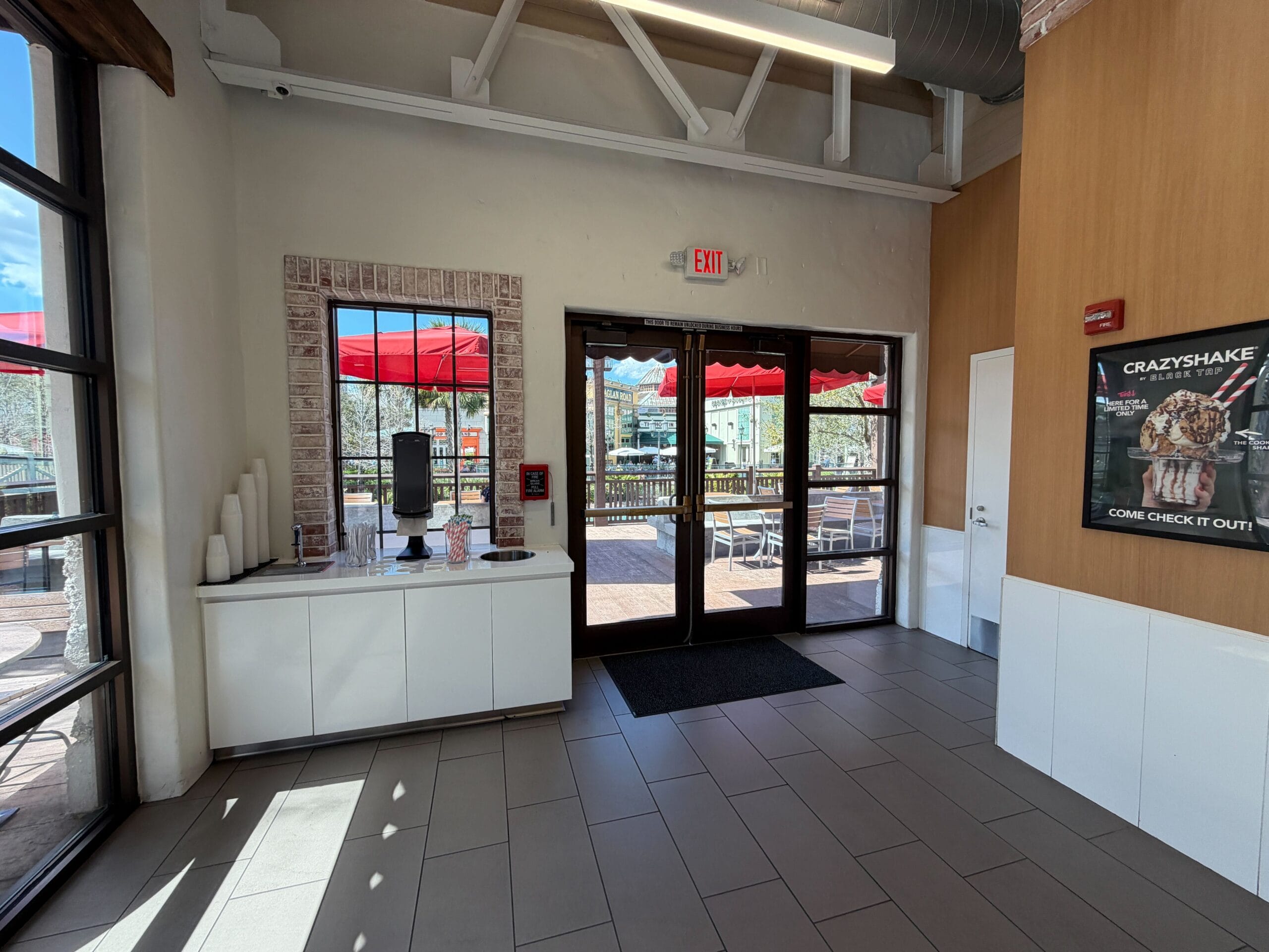 A screen near the front door cycles through images of different shakes. A colorful mural of circles has been replaced by a decal of black and white stripes.