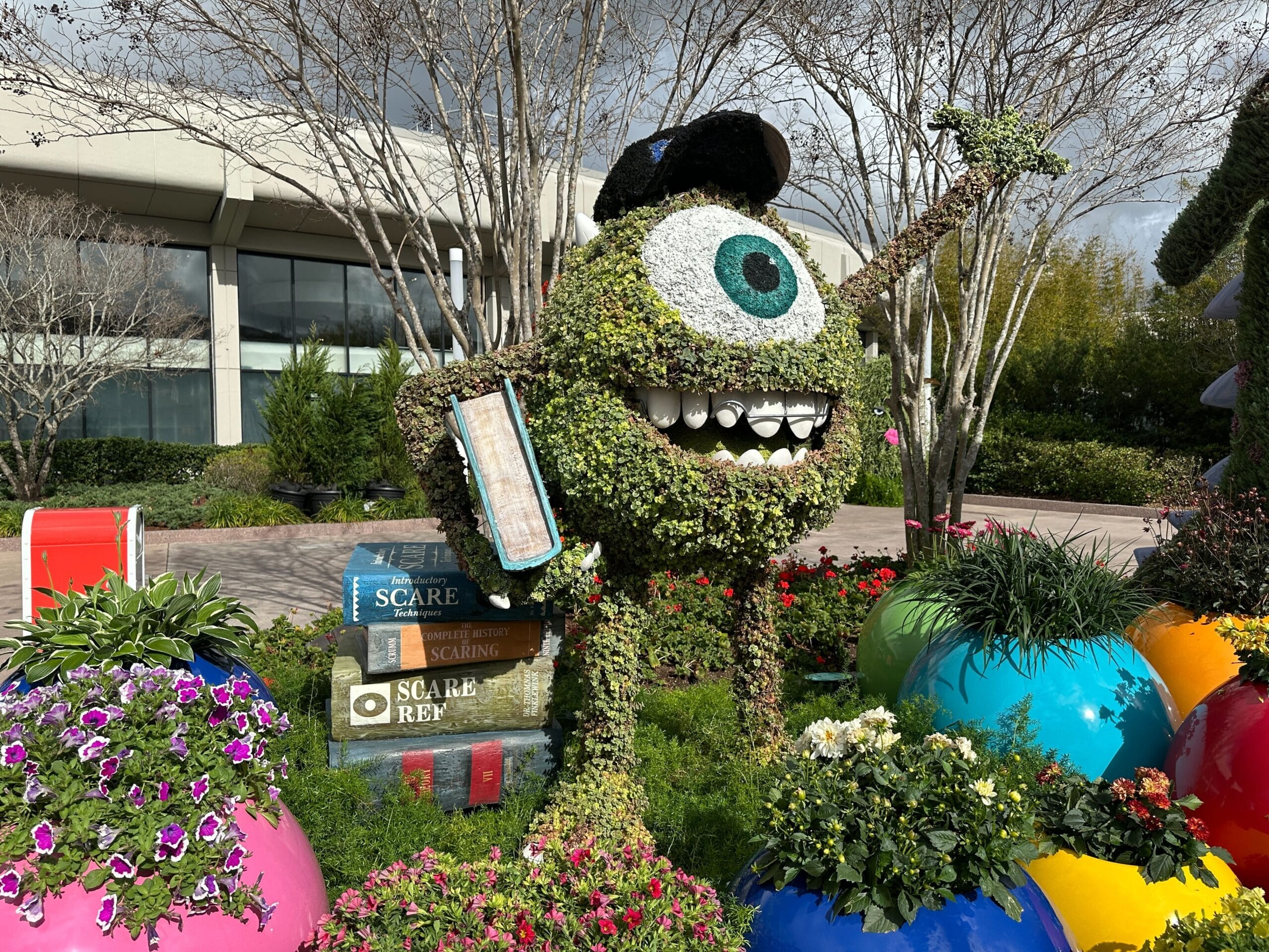 Being based on Monsters University, the topiaries have school-related props like books, an MU pennant, and Mike’s MU ball cap.