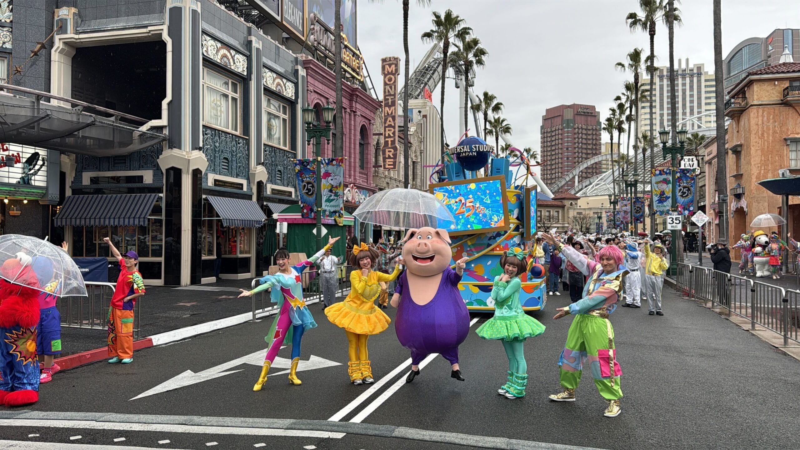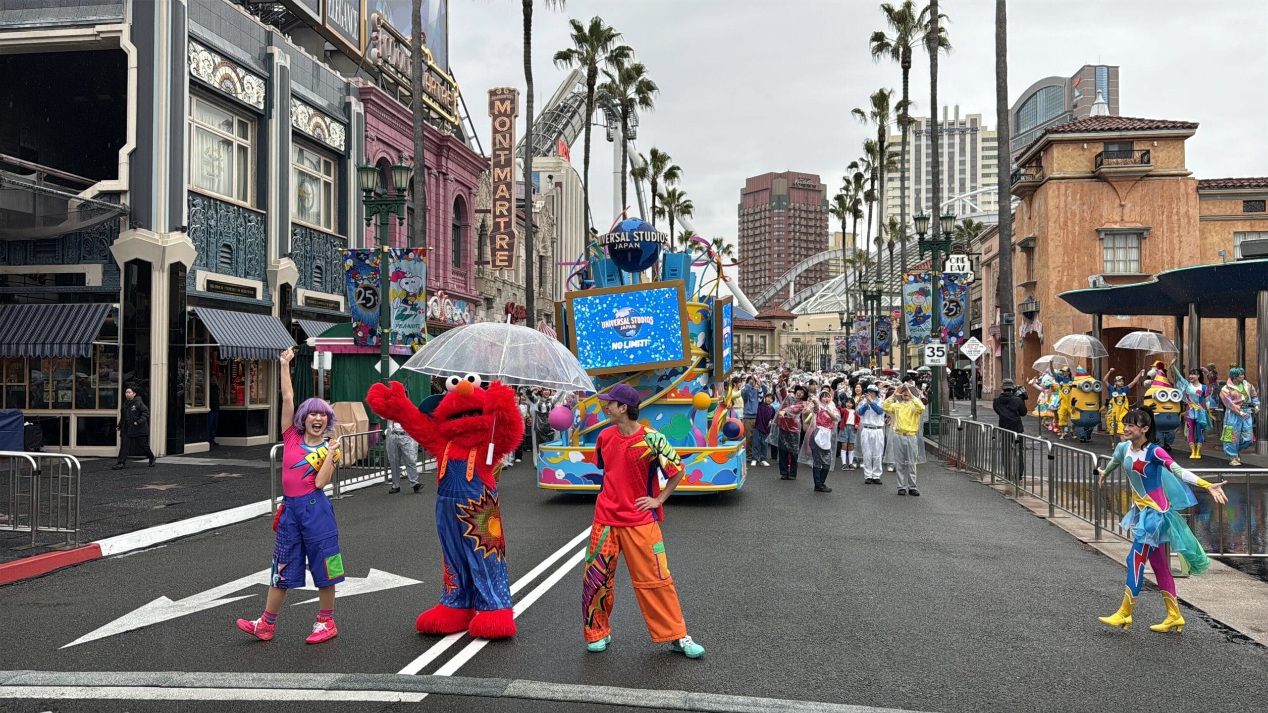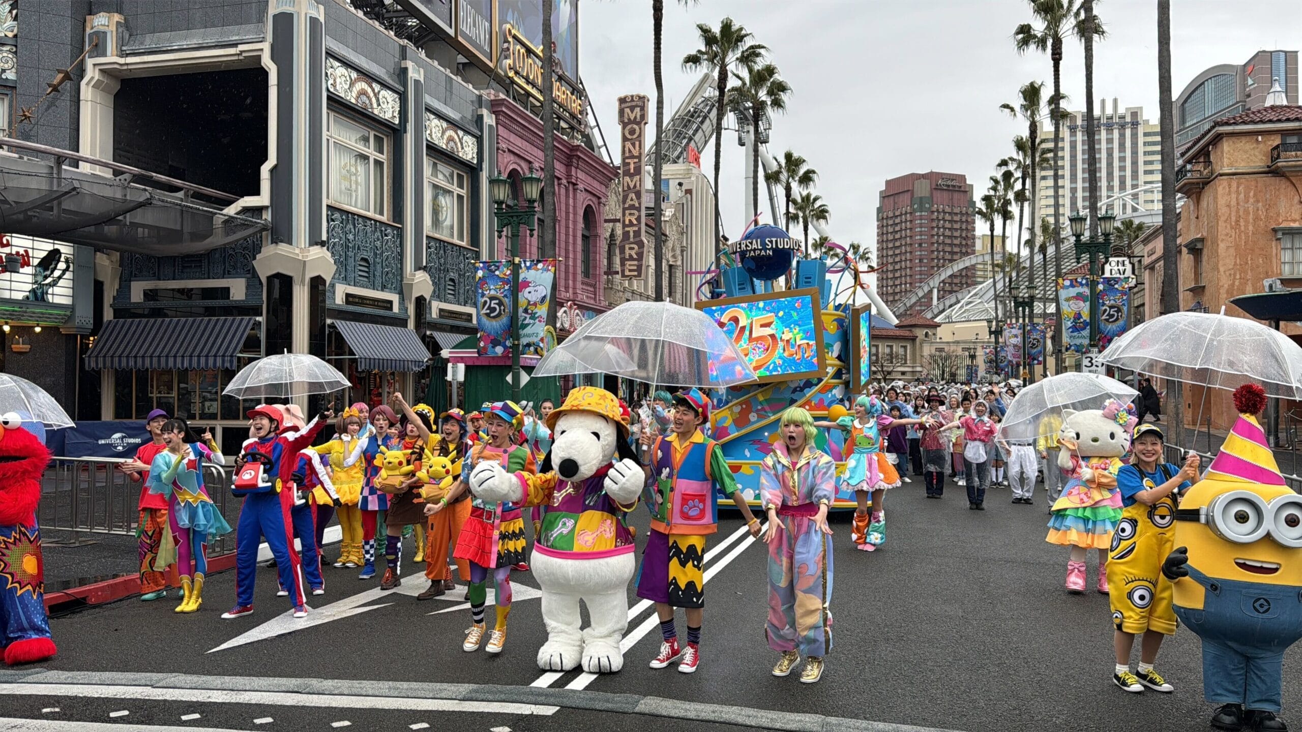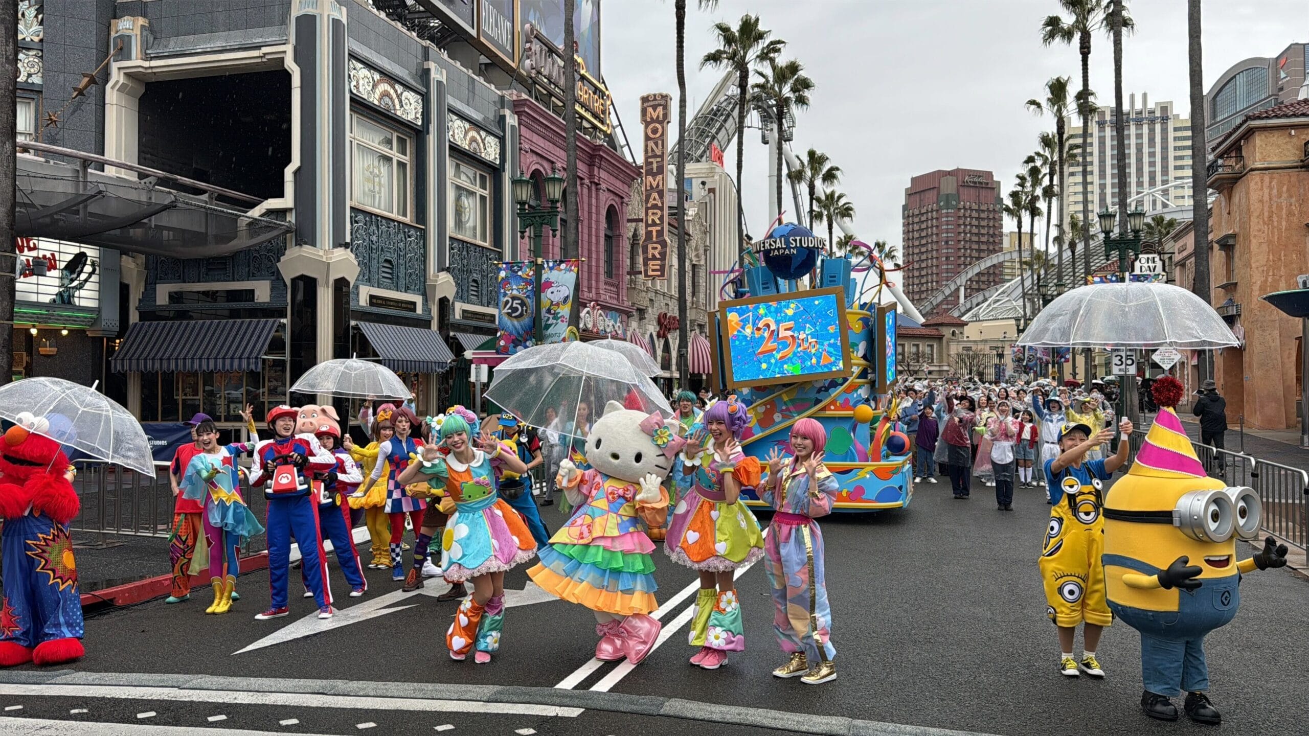 Hello Kitty and Snoopy joined Elmo in representing Universal Wonderland, a kids-themed area of Universal Studios Japan. Minions in party hats represented Minion Park.