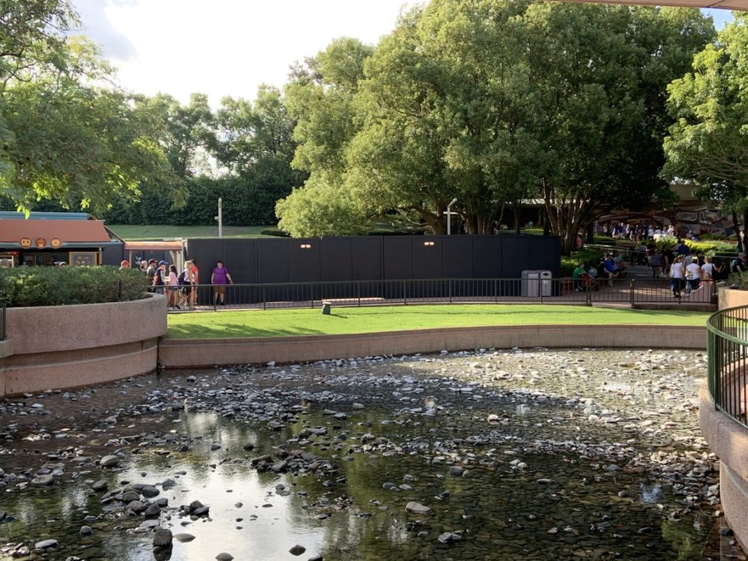 Today, we noticed these construction walls near the Imagination Pavilion, spanning over from The Land Pavilion. It’s hard to tell what exactly the construction walls are trying to cover, as there doesn’t seem to be much activity visible beyond the walls. Next to the construction walls, these water features, which are usually full of, ya …