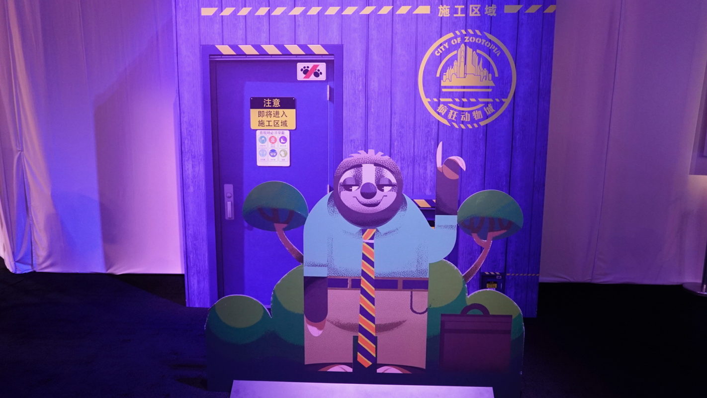 Hello… there… Check… out…. this…. photo opportunity at Disney Parks’ “Imagining Tomorrow, Today” pavilion at the 2019 D23 Expo. I write sloth-like because it’s all about Shanghai Disneyland’s upcoming Zootopia expansion, and this display features everyone’s favorite sloth, Flash! That is one nice-looking city seal. (An emblem, not an actual seal.) The photo op mimics …