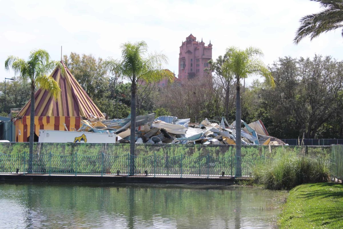 The last time we showed you the site for the new Swan and Dolphin hotel, “The Cove”, construction walls had just gone up. Demolition recently began in earnest to clear the site for construction. The new hotel is being built on land previously occupied by part of the Fantasia Gardens complex (picnic pavilions, tennis courts, …