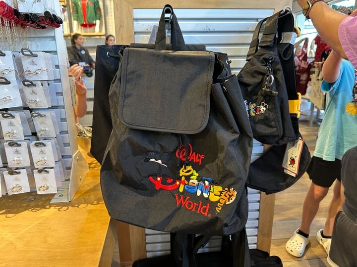 A black vinyl backpack is available at Walt Disney World with a retro embroidered design. We spotted this backpack in ...