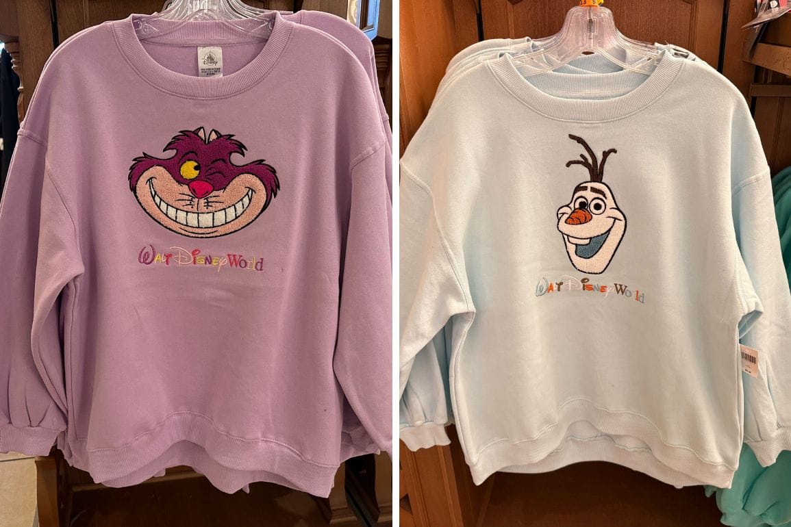 Olaf and the Cheshire Cat have arrived at Disney World in the form of character sweatshirts. These new additions match ...