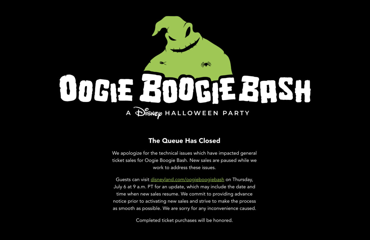 After experiencing technical issues this morning, ticket sales for Oogie Boogie Bash at Disney California Adventure have now been completely ...