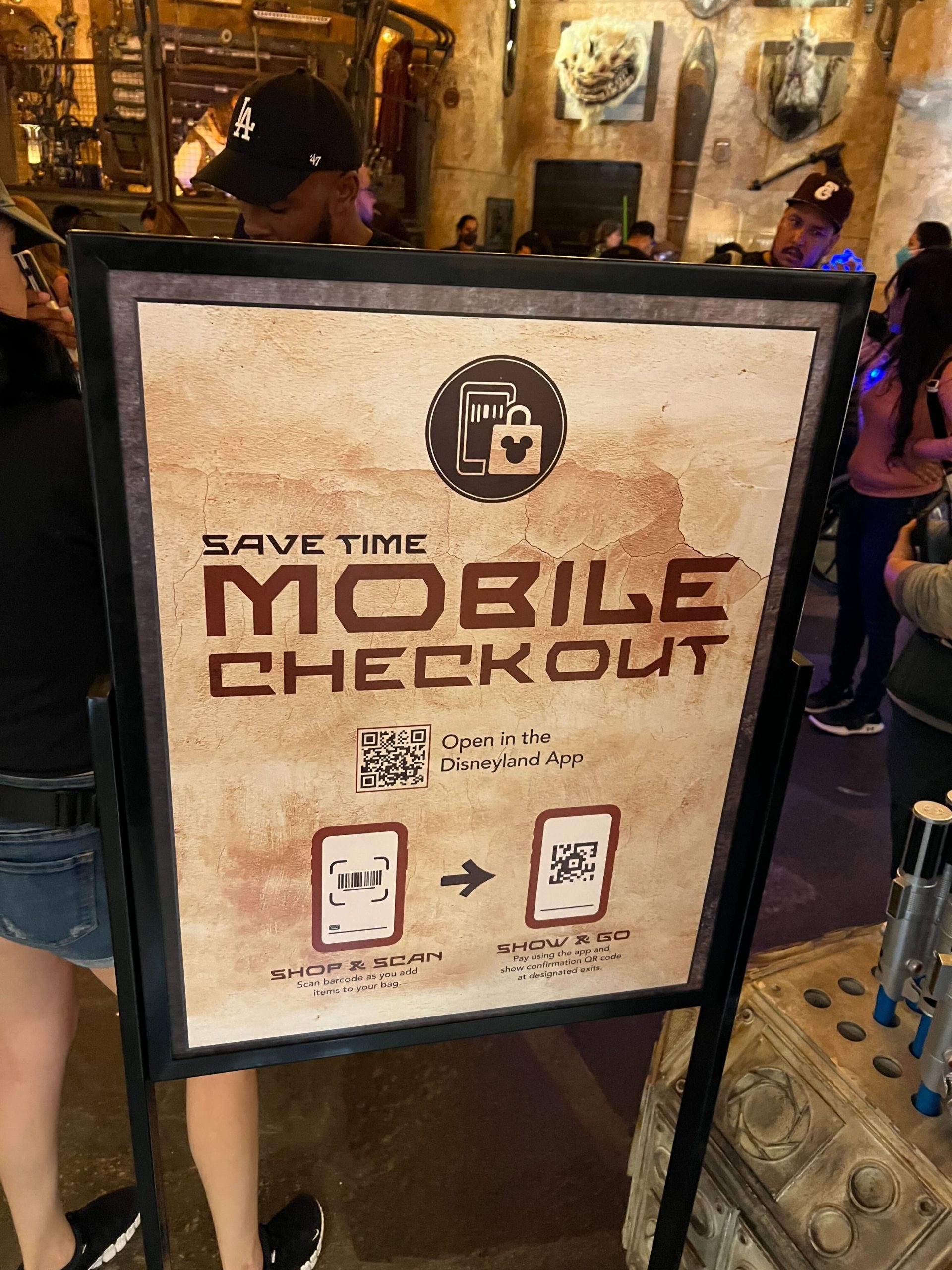Mobile checkout is now available at Dok-Ondar’s Den of Antiquities in Star Wars: Galaxy’s Edge at Disneyland. Signs advertise mobile ...